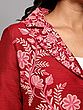 The embroidery adorning this jacket is a celebration of nature's beauty. Delicate floral clusters and winding vines in soft pinks and lighter reds gracefully cascade across the lapels, the front opening, and the sleeves. Each petal, leaf, and stem is rendered with precision, showcasing the skill and dedication of the artisans. The contrast between the deep red silk and the lighter, detailed embroidery creates a captivating visual appeal that is both sophisticated and eye-catching.