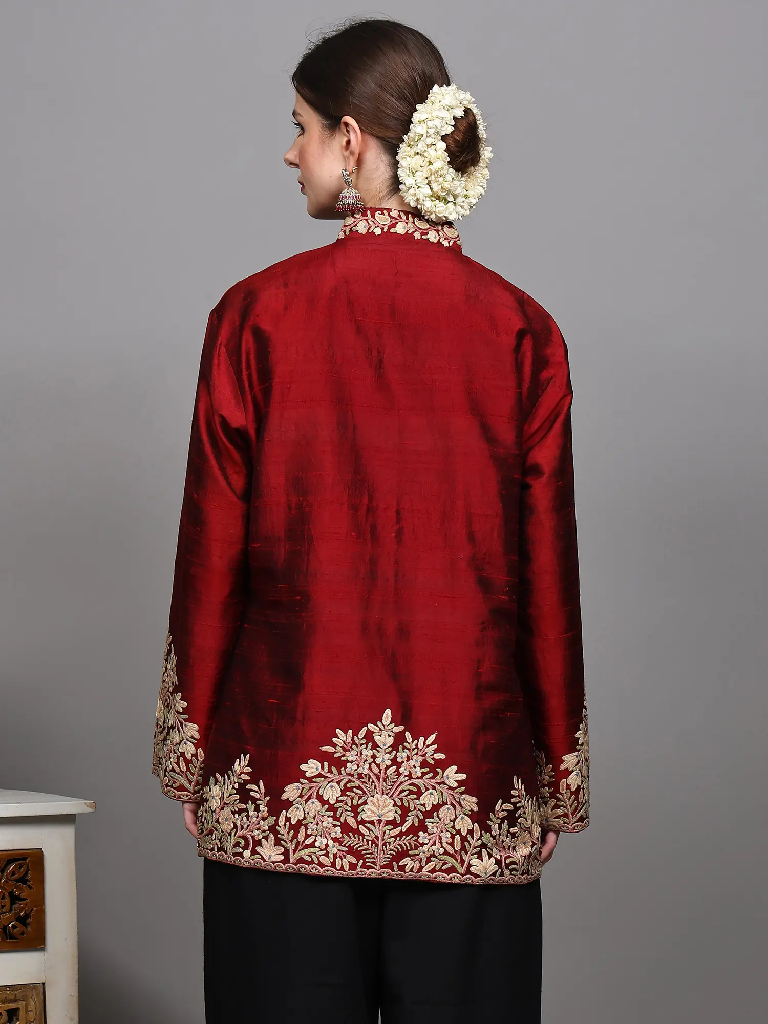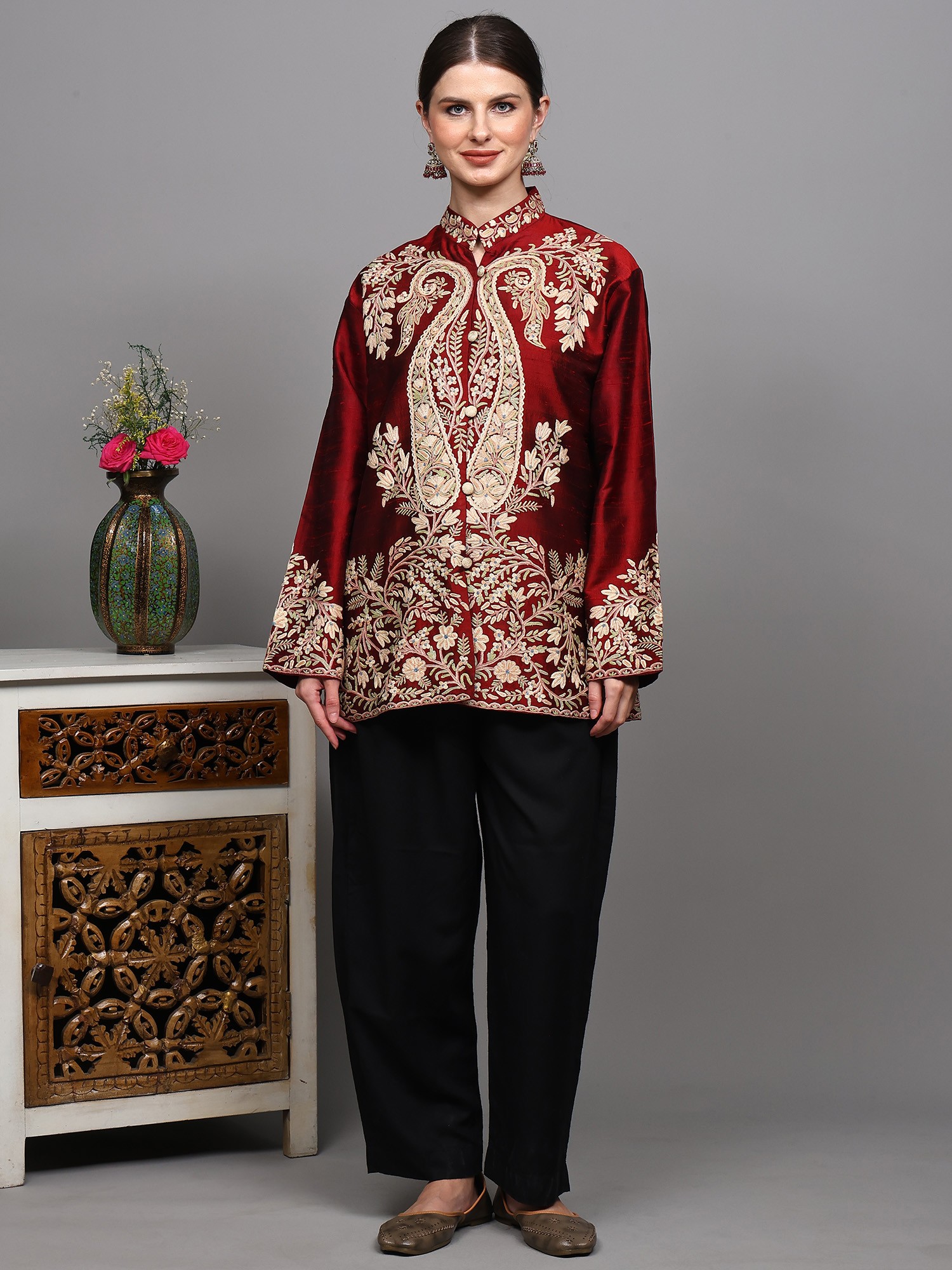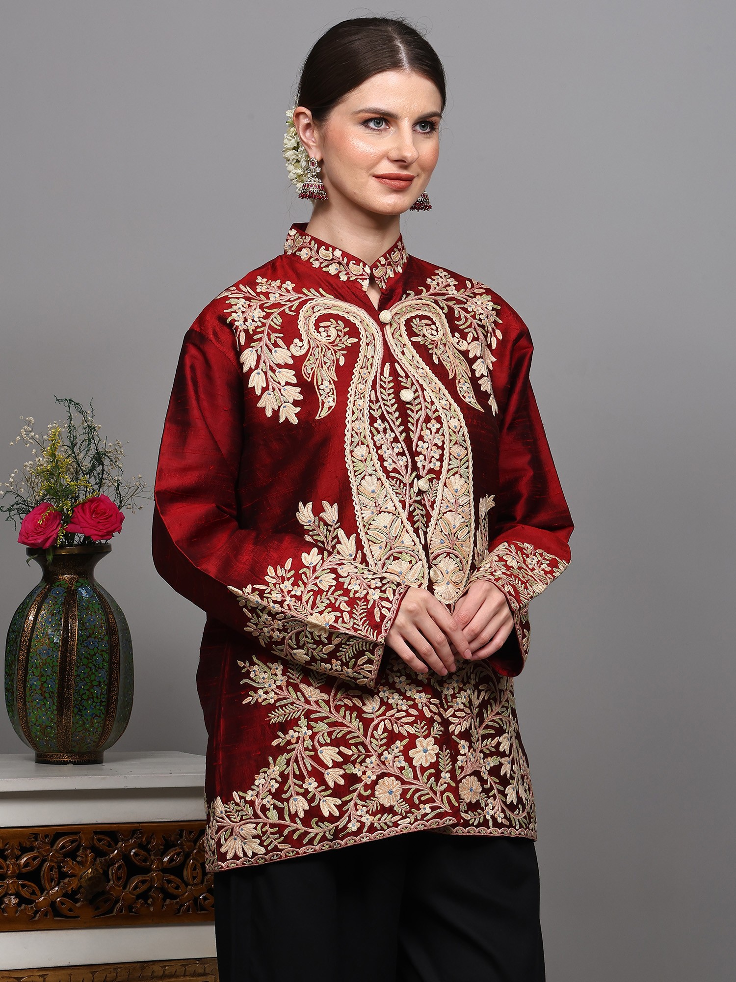 Pure Silk Short Jacket from Kashmir with Aari Embroidered Paisleys Jaal