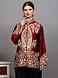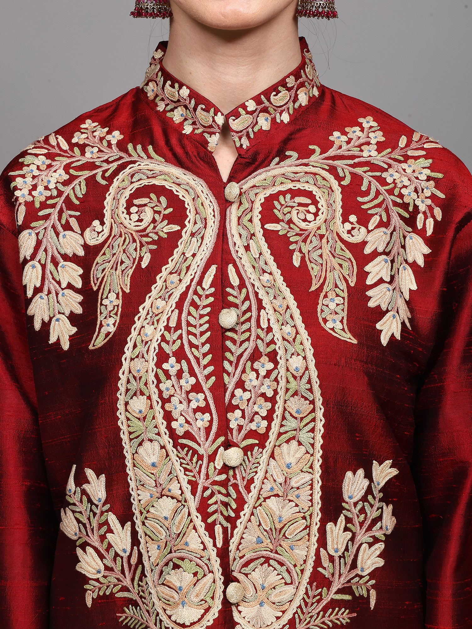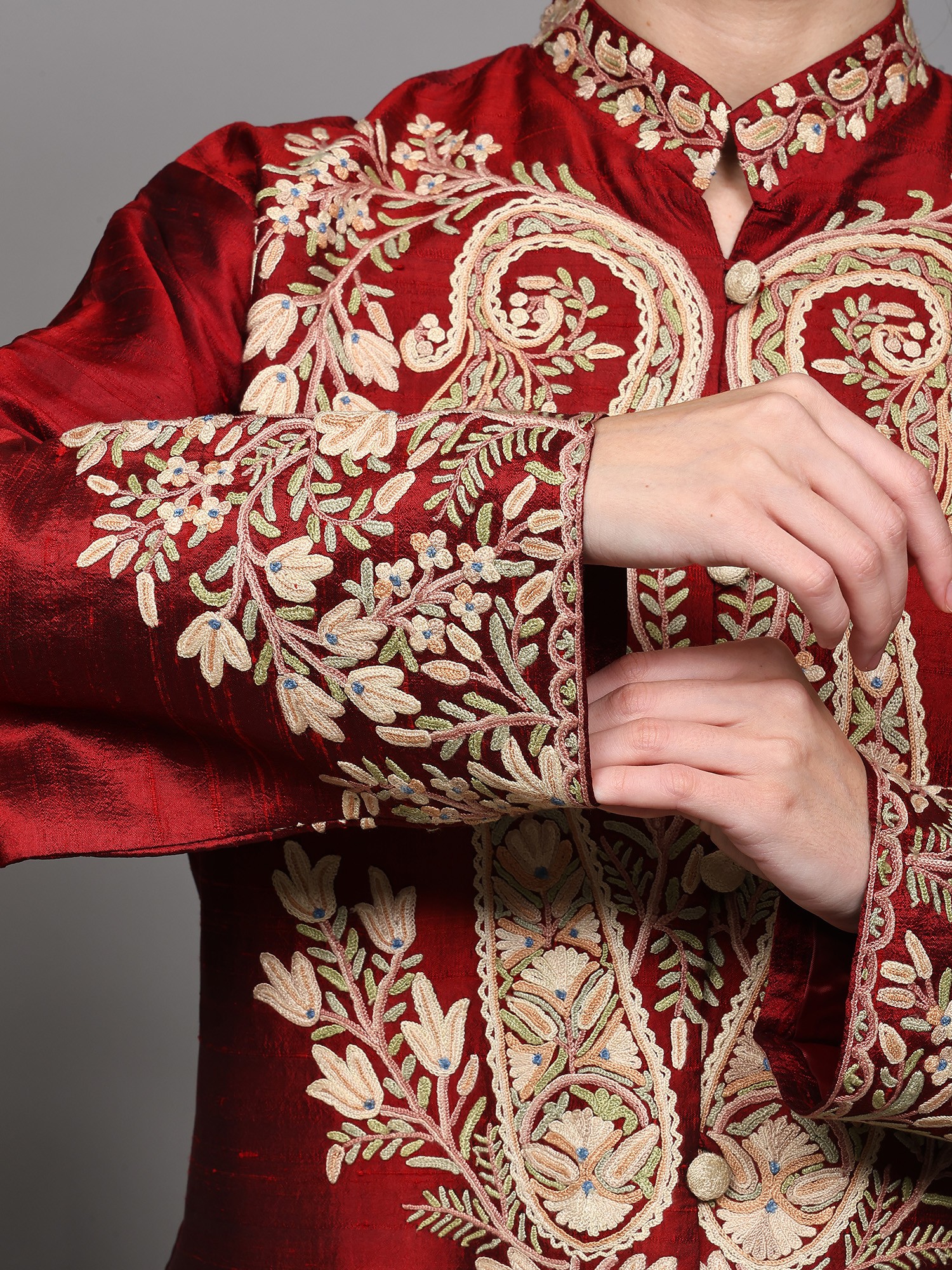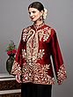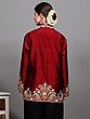 Red-Dahlia Pure Silk Long Jacket from Kashmir with Aari Embroidered Paisley Jaal