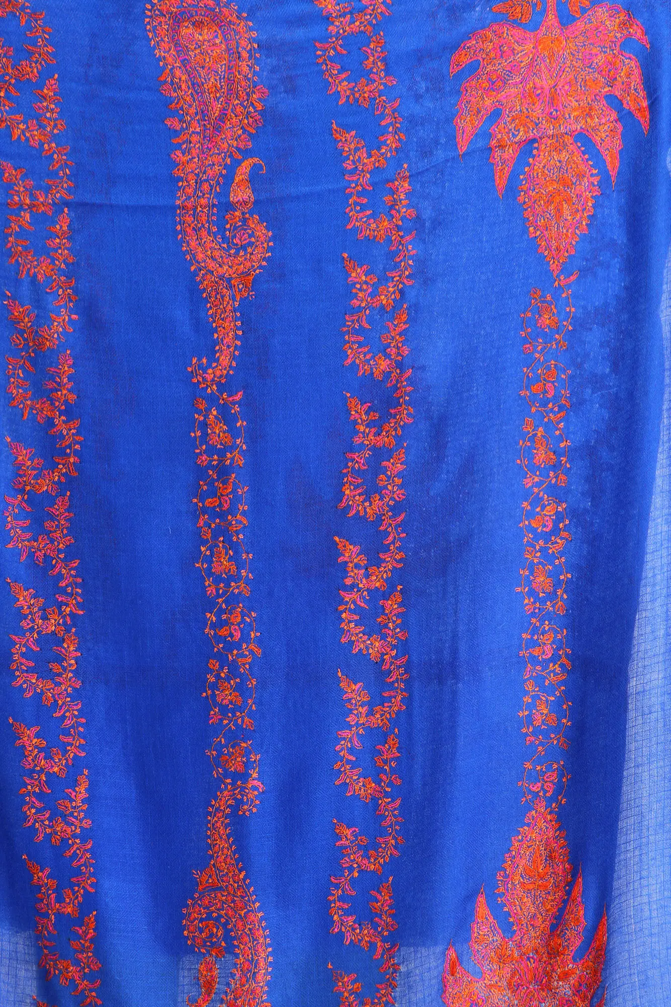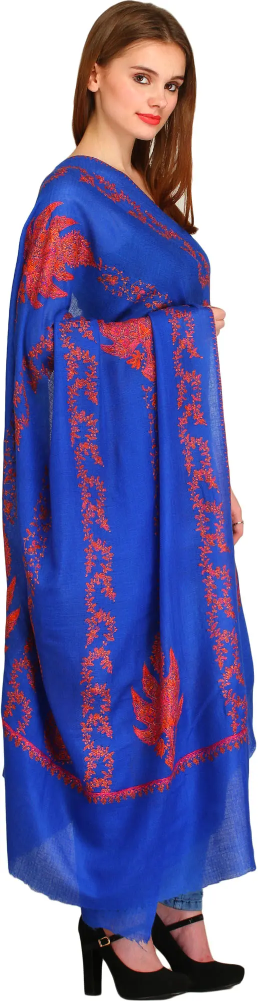 What truly elevates this Pashmina shawl is the intricate needle embroidery, meticulously done by hand. Skilled artisans have adorned the rich blue fabric with vibrant coral-red motifs, creating a stunning visual contrast. The embroidery features classic paisley patterns and delicate floral vines, arranged in a captivating dance across the entire expanse of the shawl. Each stitch is a testament to the patience, precision, and dedication of the craftsperson. The detailed work captures the essence of traditional Kashmiri art, bringing a touch of sophisticated charm to any ensemble. The embroidery is not just decorative; it adds a subtle texture and depth, making the shawl a true work of art.