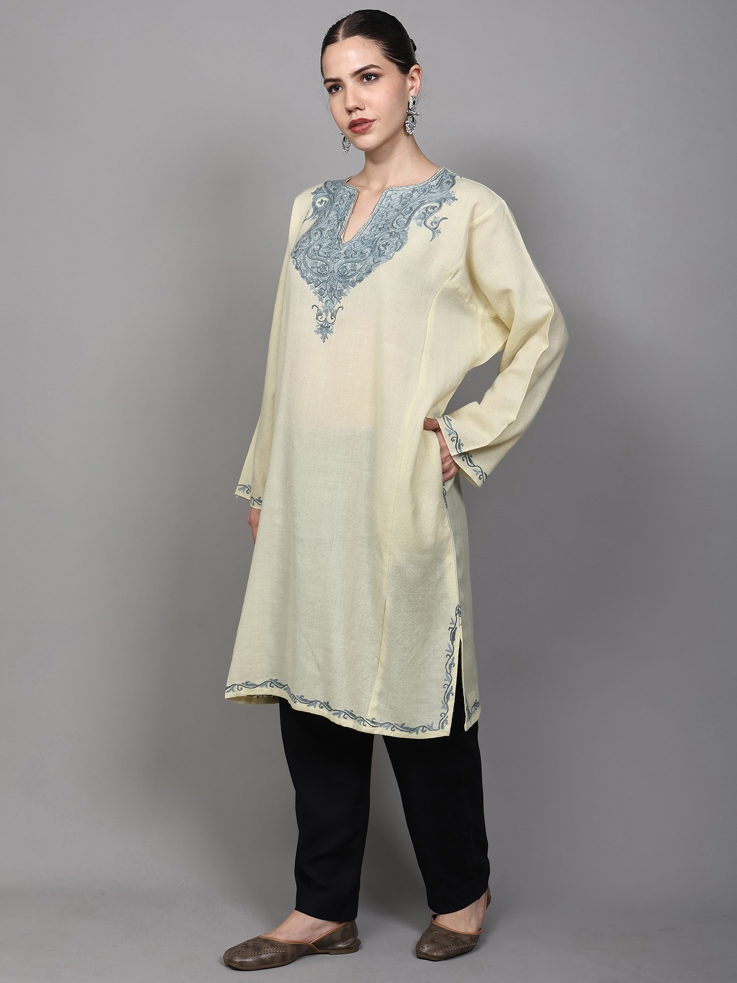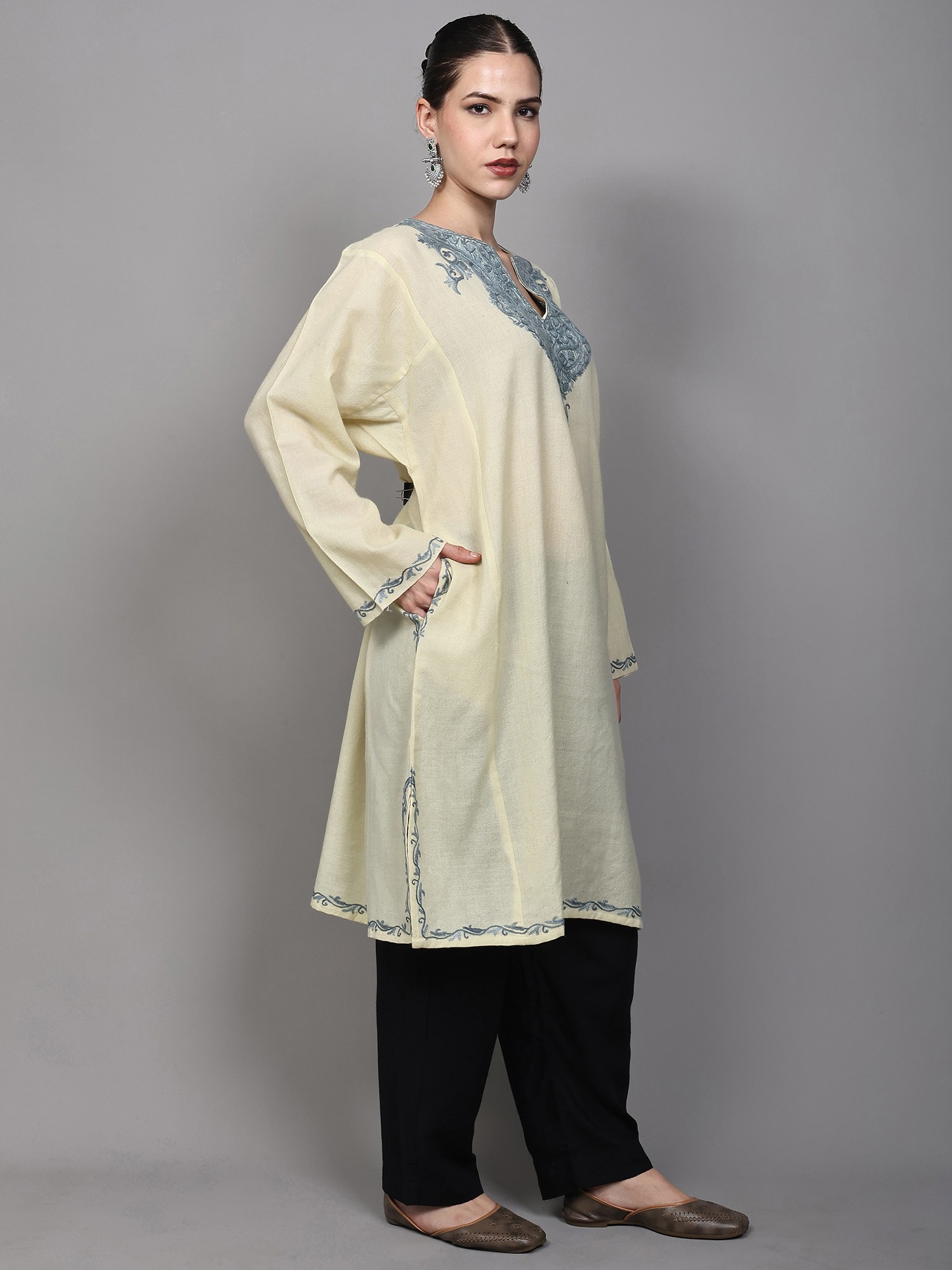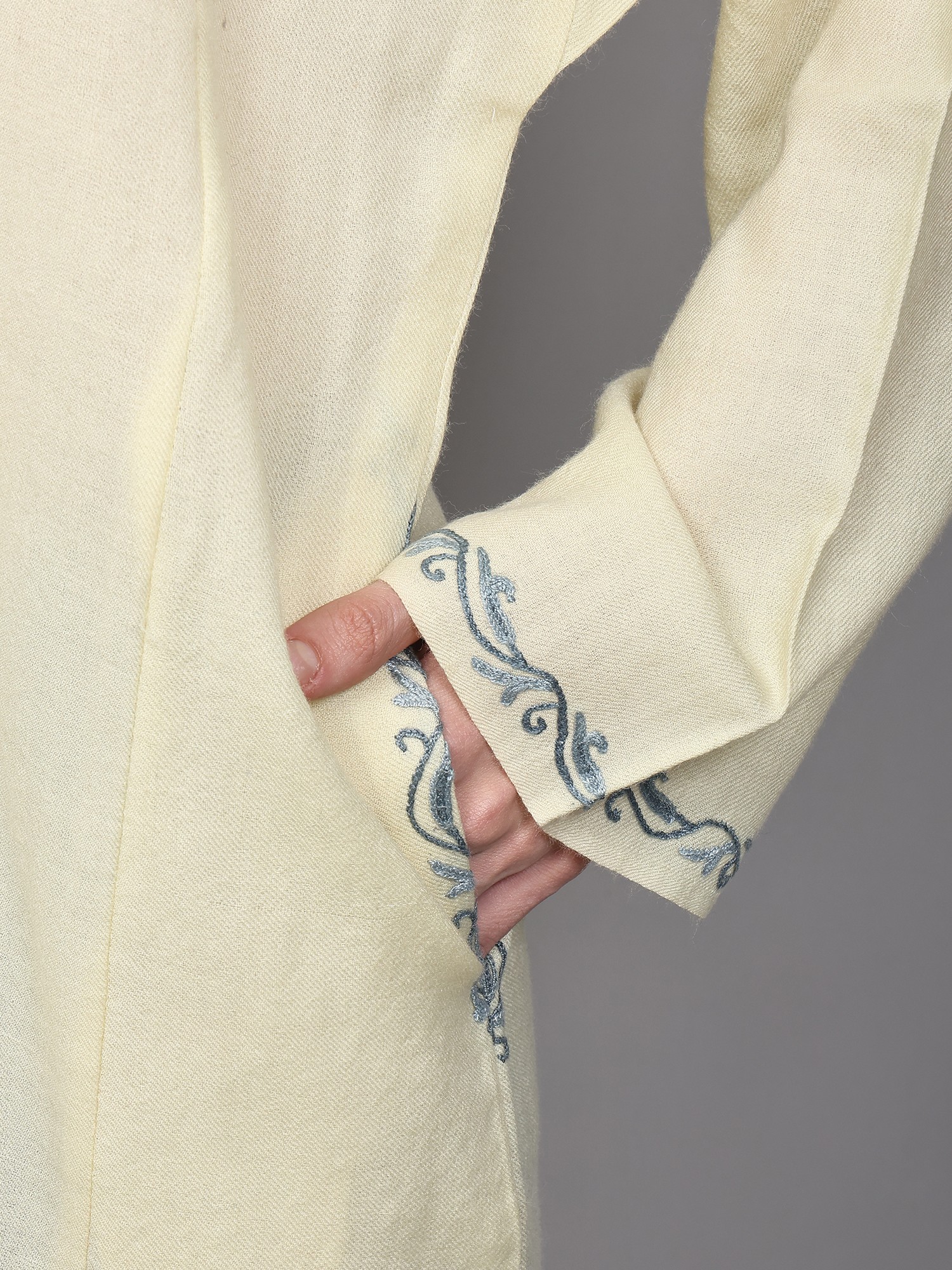 Wool Kashmiri Phiran with Aari Embroidered Paisleys on Neck and Side Pockets
