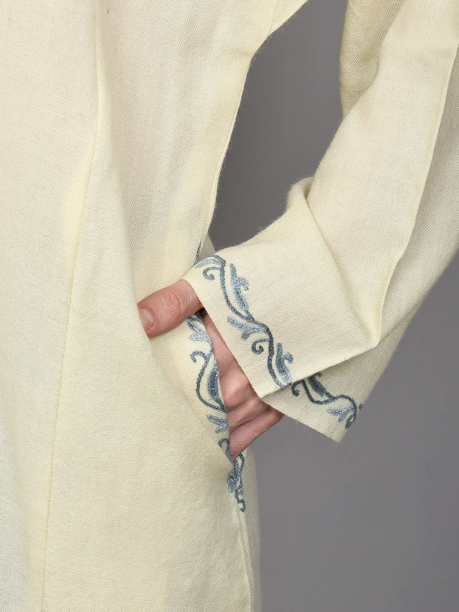 Wool Phiran from Kashmir with Aari Embroidered Sprig Vines All-Over and Side Pockets