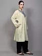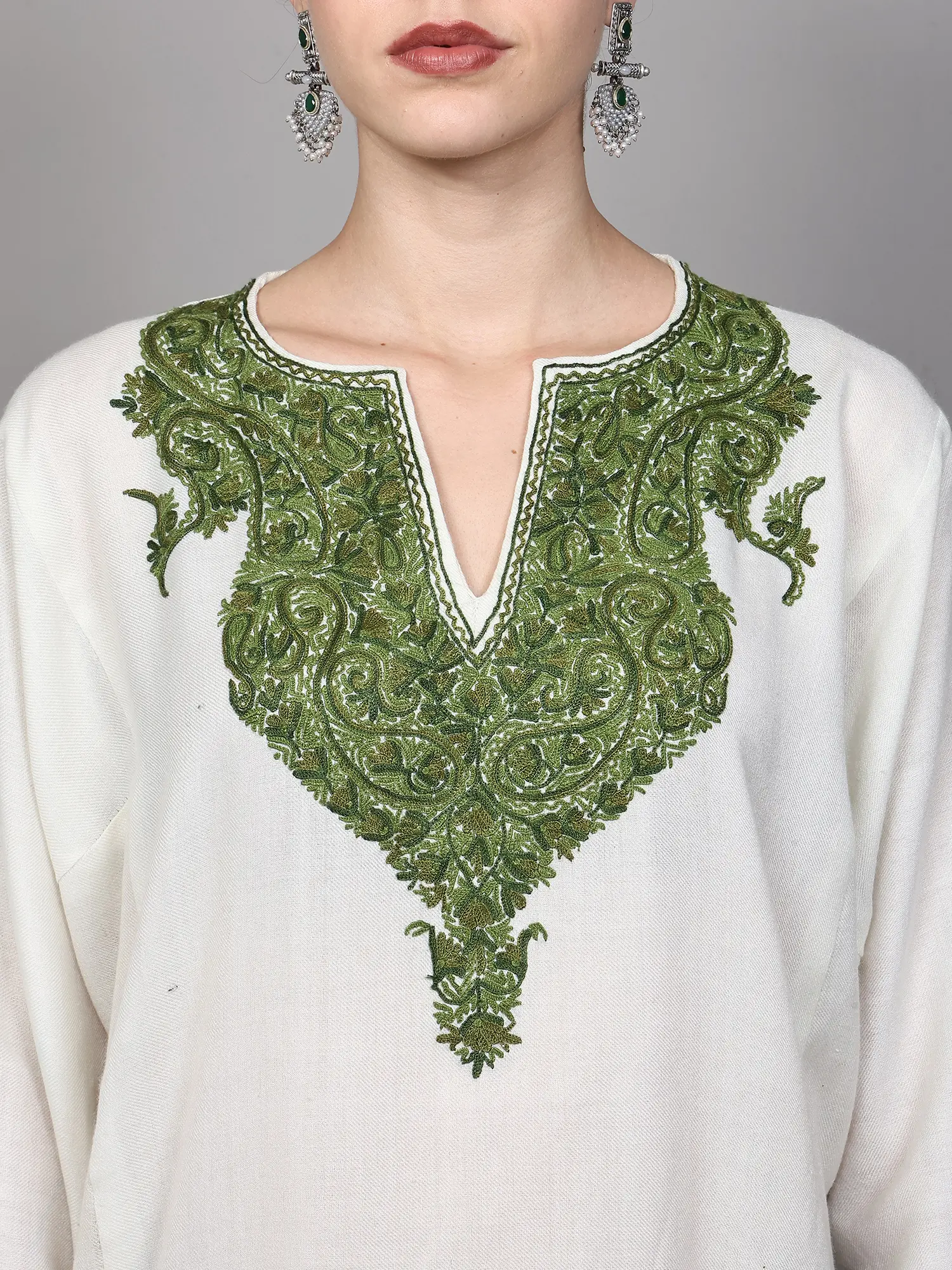 Pure Wool Phiran with Aari Embroidered Paisleys and Floral Leaf Stripe on Neck from Kashmir