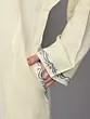 The true beauty of this phiran lies in its captivating Aari embroidery. Delicate, paisley motifs adorn the neckline in a stunning shade of blue, intricately stitched by skilled artisans. Aari embroidery is a time-honored Kashmiri needlework technique known for its fine details and intricate patterns, often created using a fine hook. The paisley, a symbol of life and fertility, adds a touch of traditional elegance and rich cultural heritage to the garment. The embroidery is also subtly echoed along the hem and cuffs, creating a cohesive and polished look.