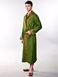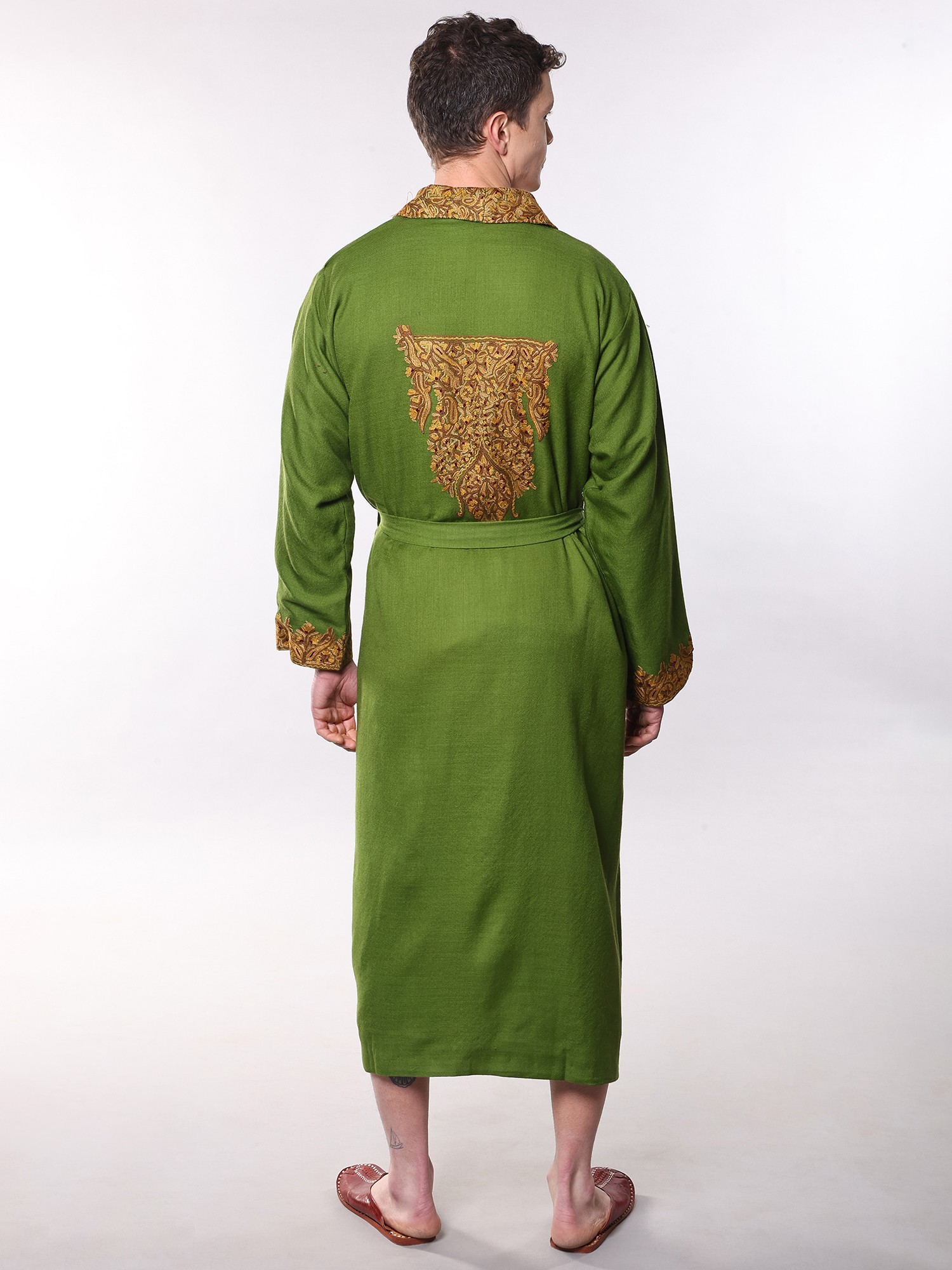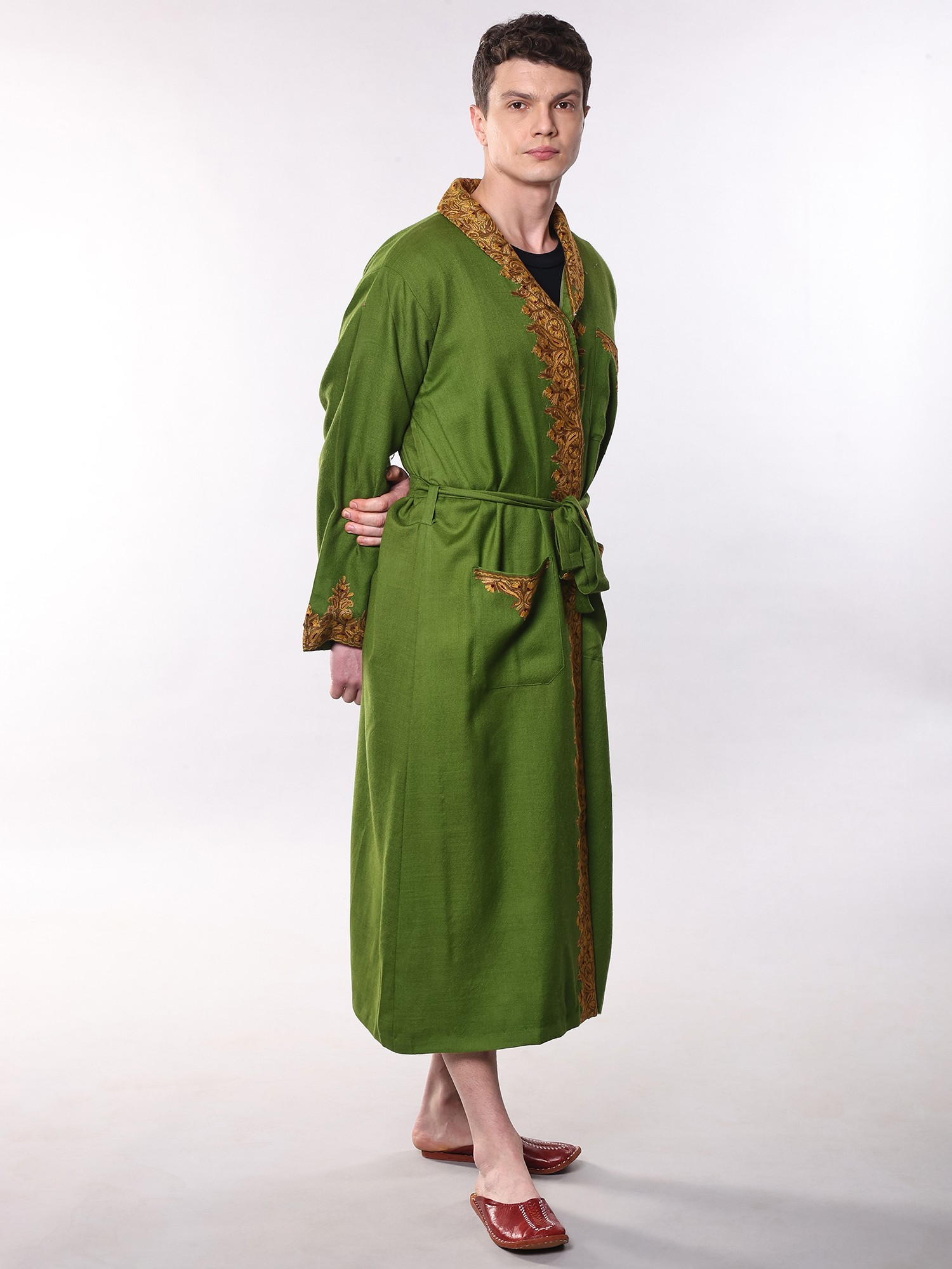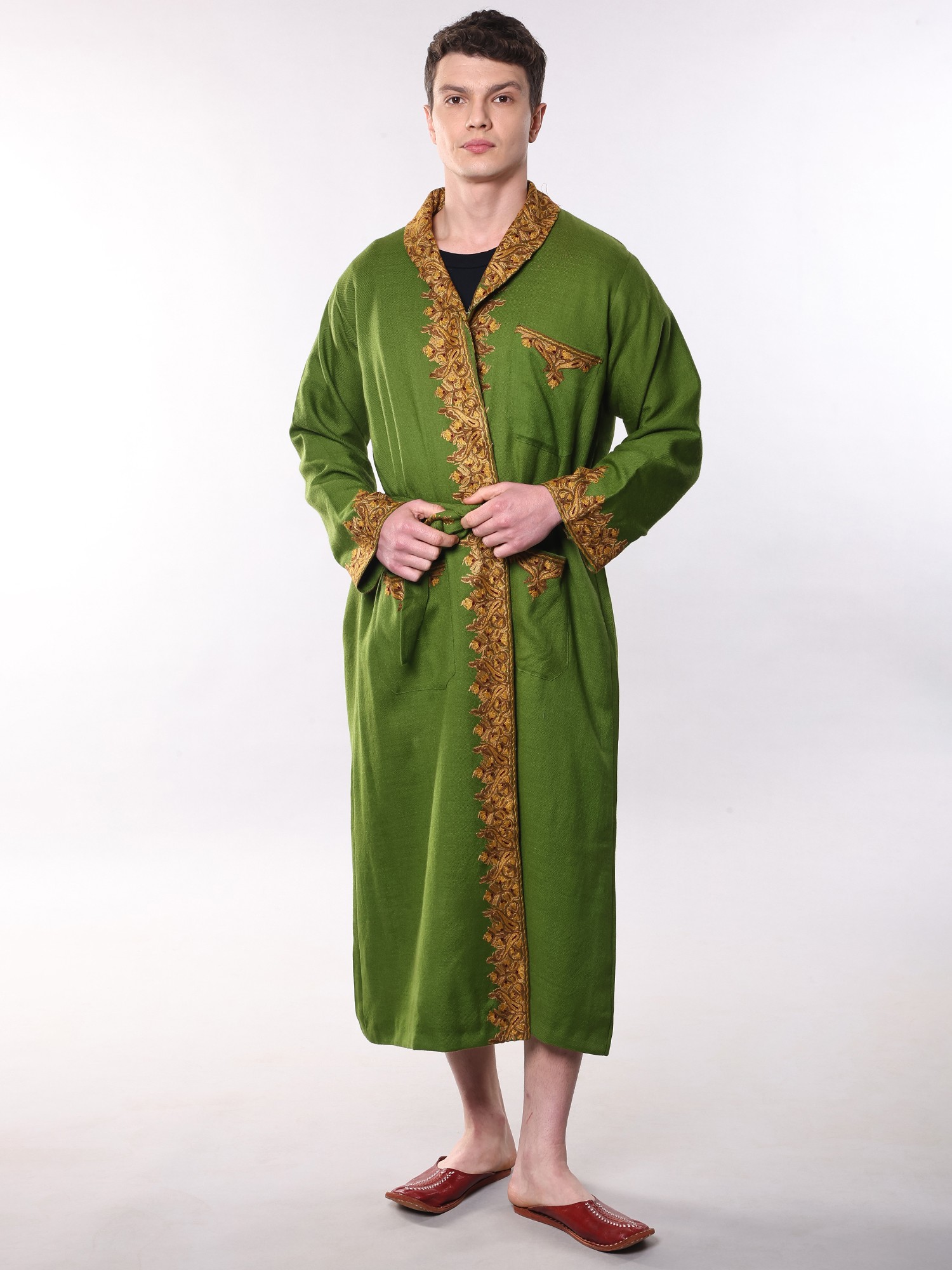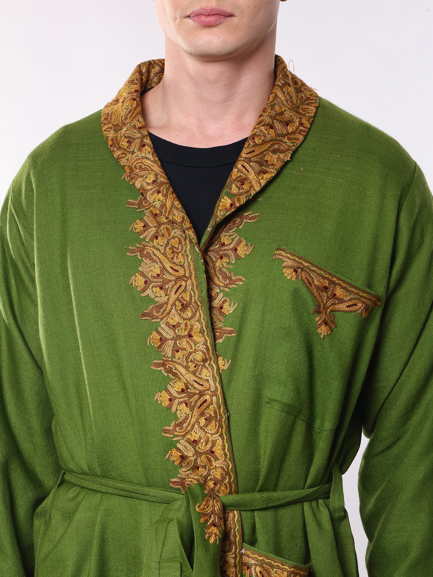 The ariwork on this jacket is a signature of Kashmiri handiwork. It starts all the way around the collar and traverses down the length of the frontal edges of the robe. Embroidered is a series of slender, double-paisley motifs, one as if a mirror-image of the other. Matching embroidery is to be found along the mouths of the spacious pockets on either side of the robe and the ends of the airy, full-length sleeves. While the grey and green ones feature embroidery in contrasting colors, the embroidery on the red number is a complementary shade of the same color.