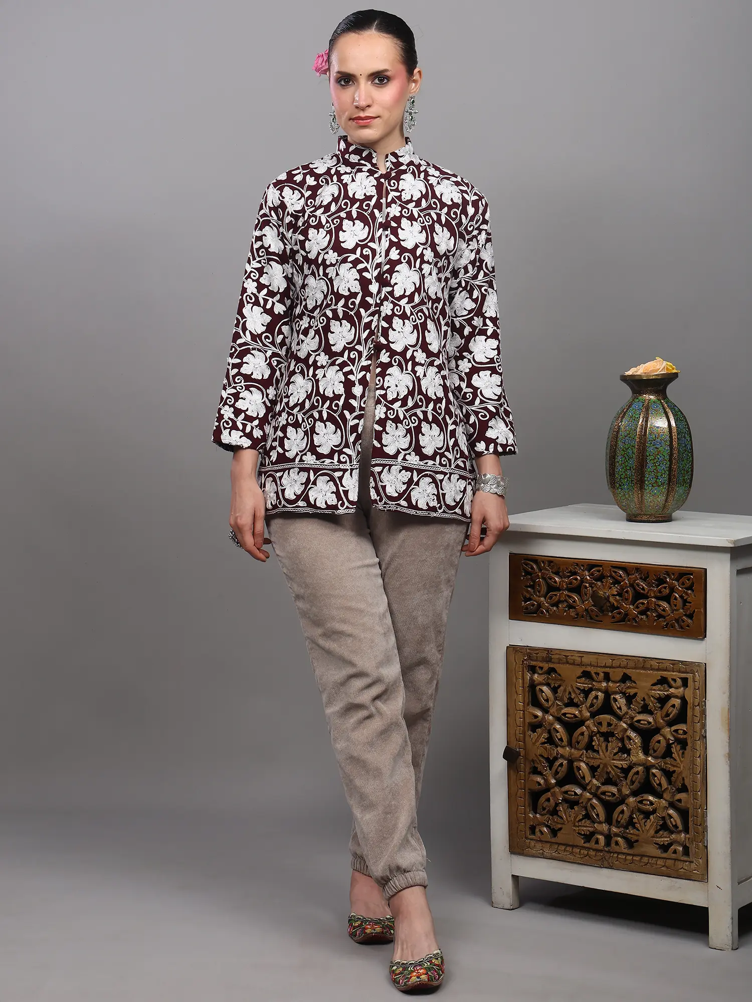 Black-Olive Kashmiri Long Jacket with Aari Embroidered Floral Vines with Side Pockets