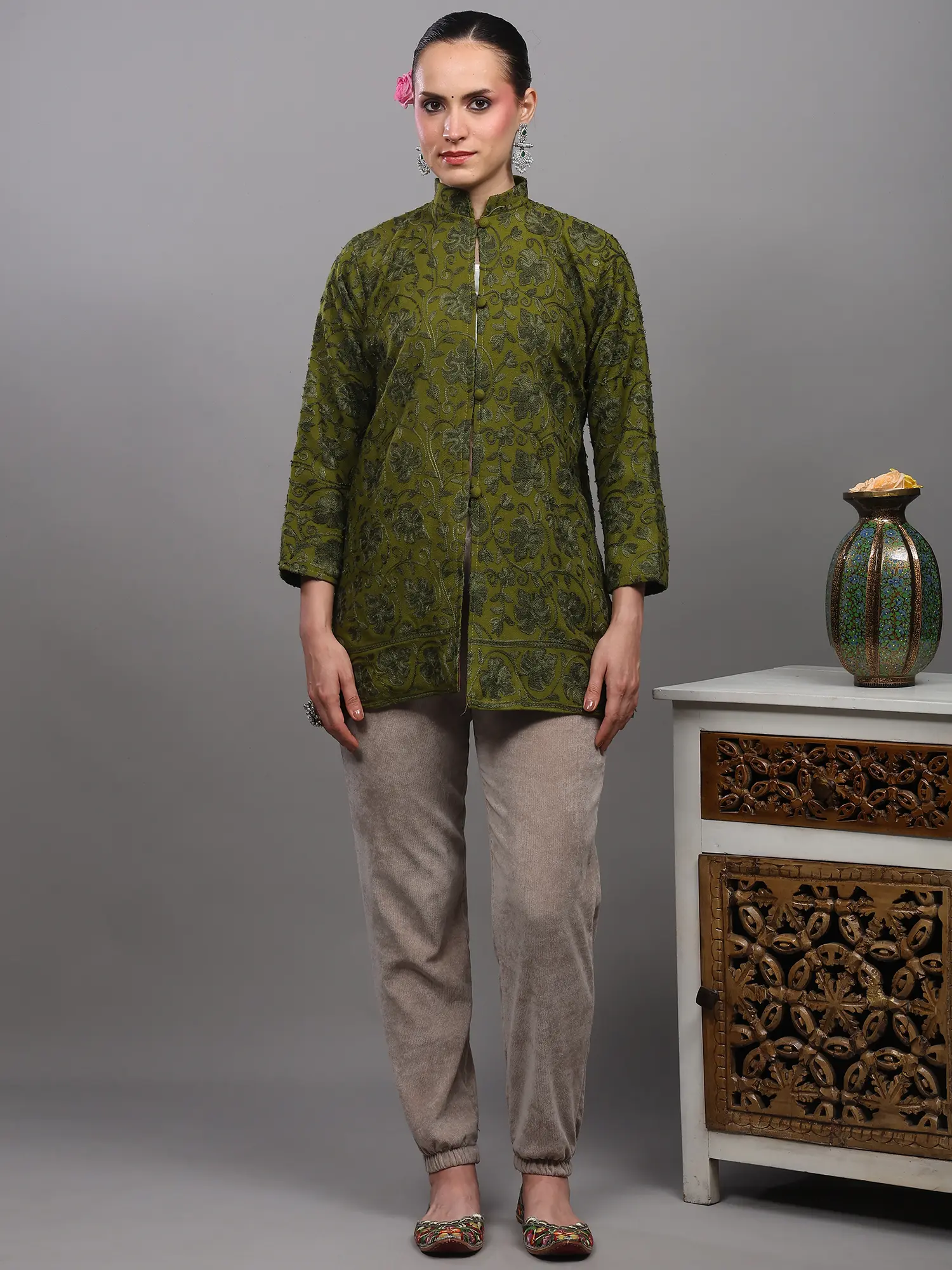 Black-Olive Kashmiri Long Jacket with Aari Embroidered Floral Vines with Side Pockets