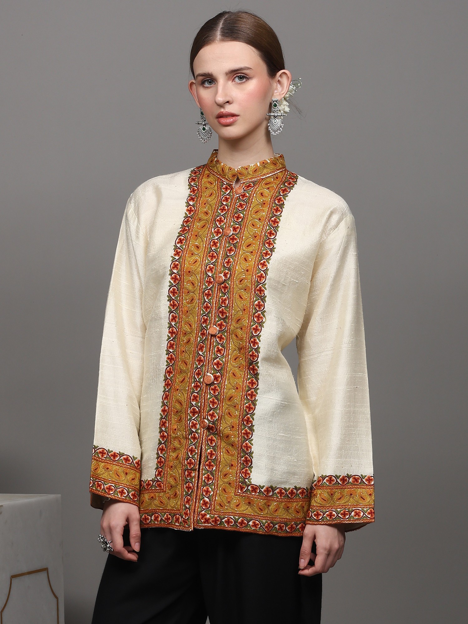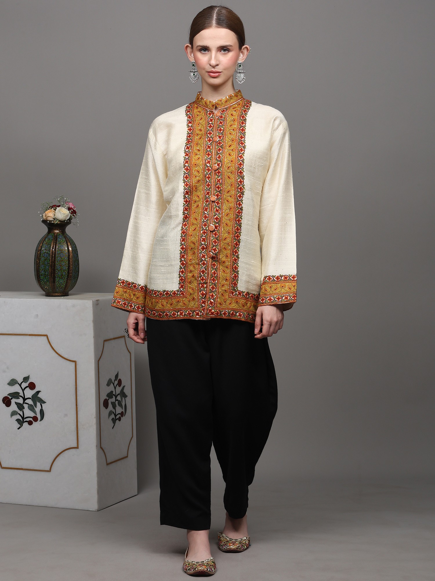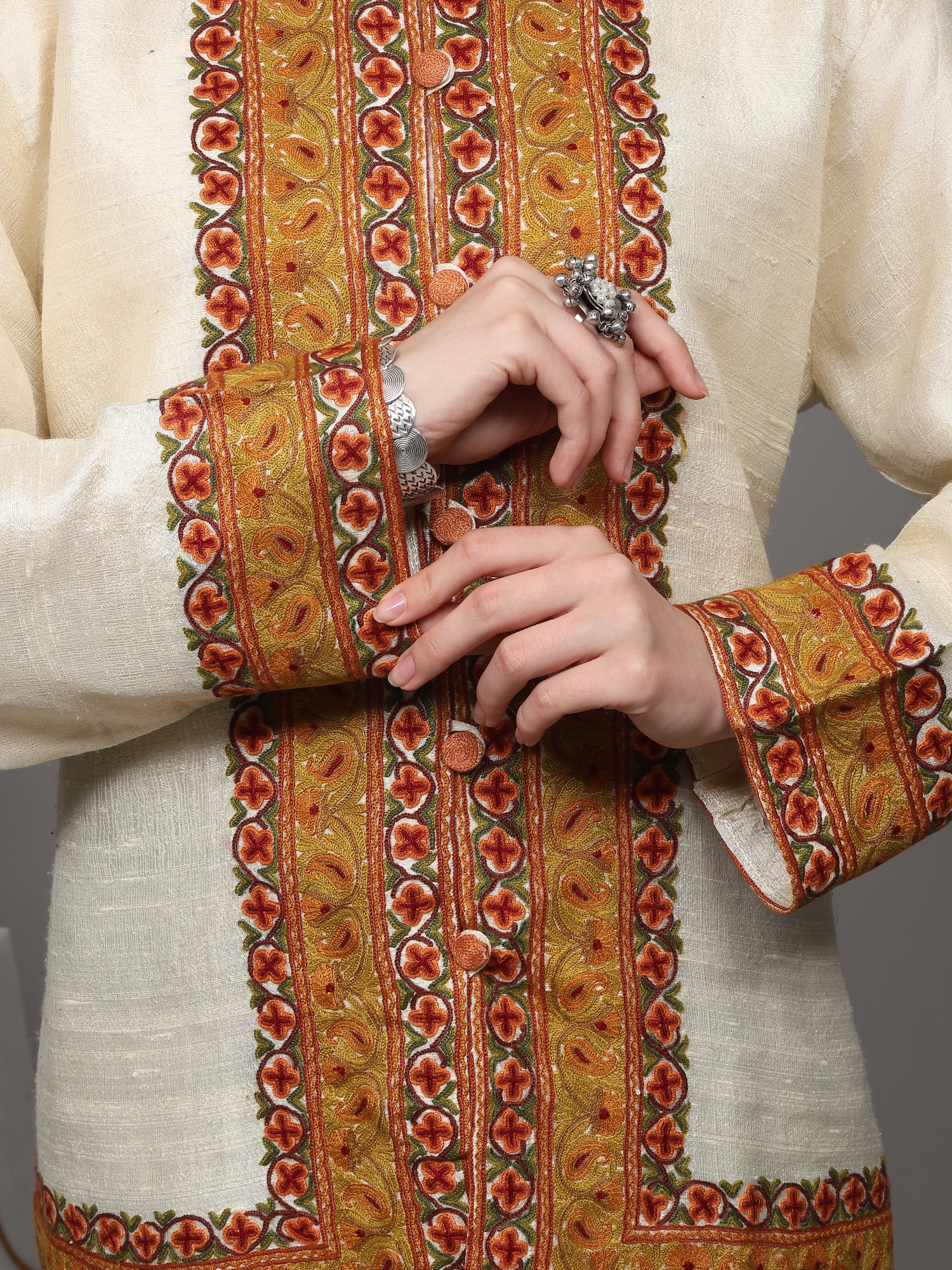 The Kashmiri Jacket adorned with Hand Aari Embroidery on its border is a masterpiece that encapsulates the heritage and exquisite craftsmanship of Kashmir. The Hand Aari Embroidery, meticulously crafted along the border, showcases intricate patterns and motifs, each telling a story of cultural opulence and artistic legacy. It captures the essence of grace and tradition, making a statement of cultural richness and artistic finesse.