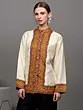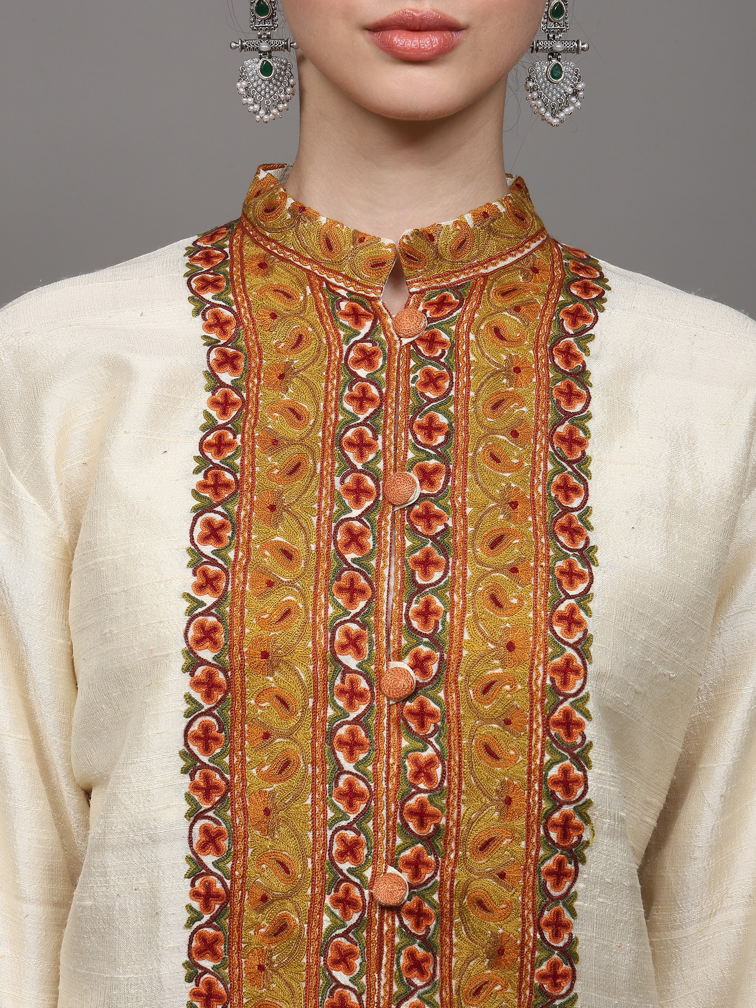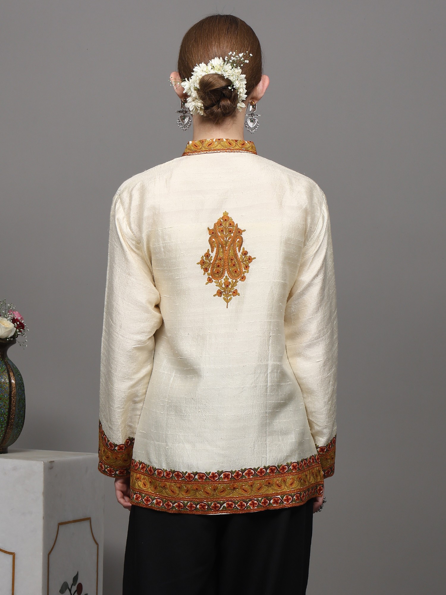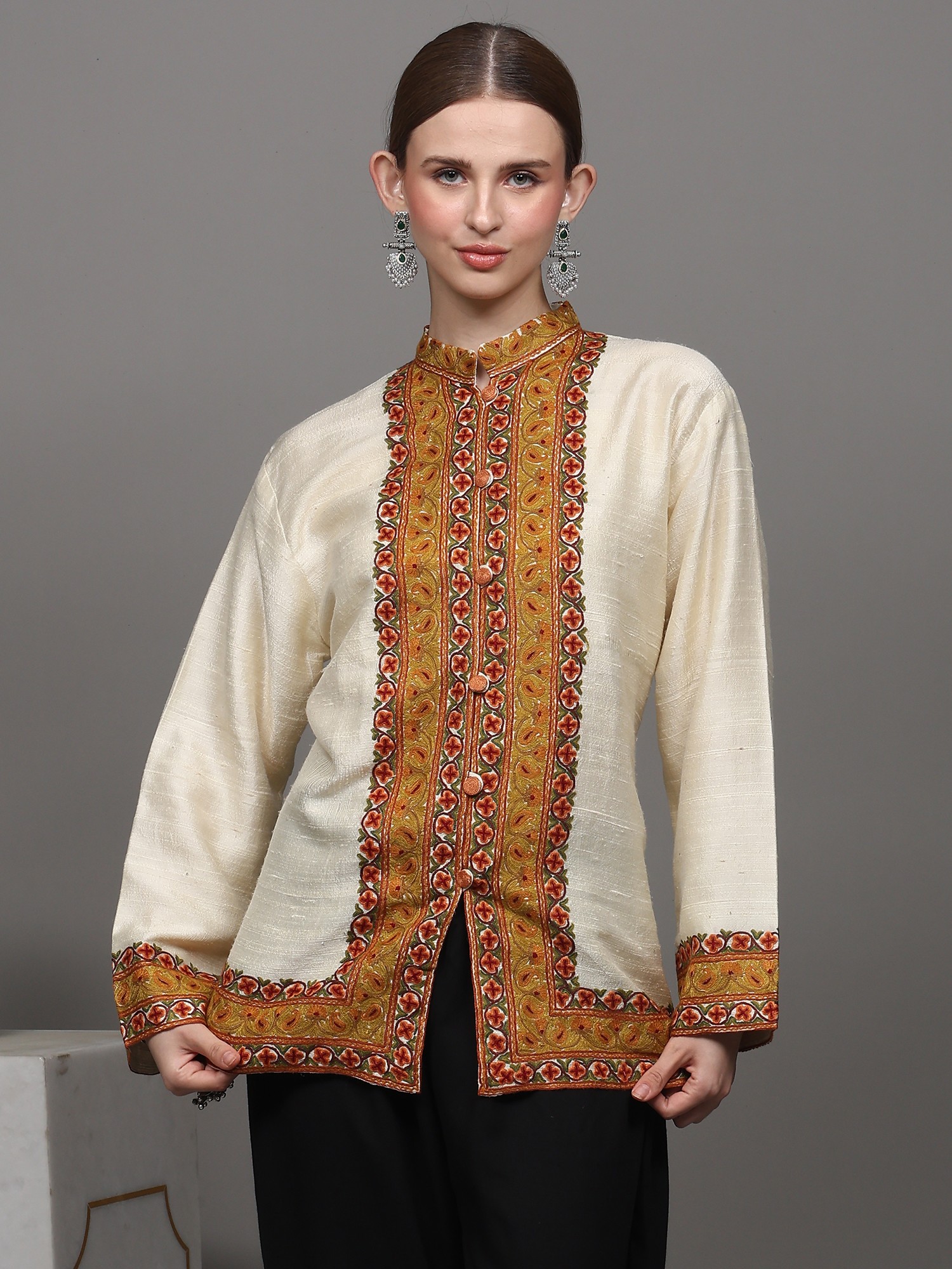 The Kashmiri Jacket adorned with Hand Aari Embroidery on its border is a masterpiece that encapsulates the heritage and exquisite craftsmanship of Kashmir. The Hand Aari Embroidery, meticulously crafted along the border, showcases intricate patterns and motifs, each telling a story of cultural opulence and artistic legacy. It captures the essence of grace and tradition, making a statement of cultural richness and artistic finesse.