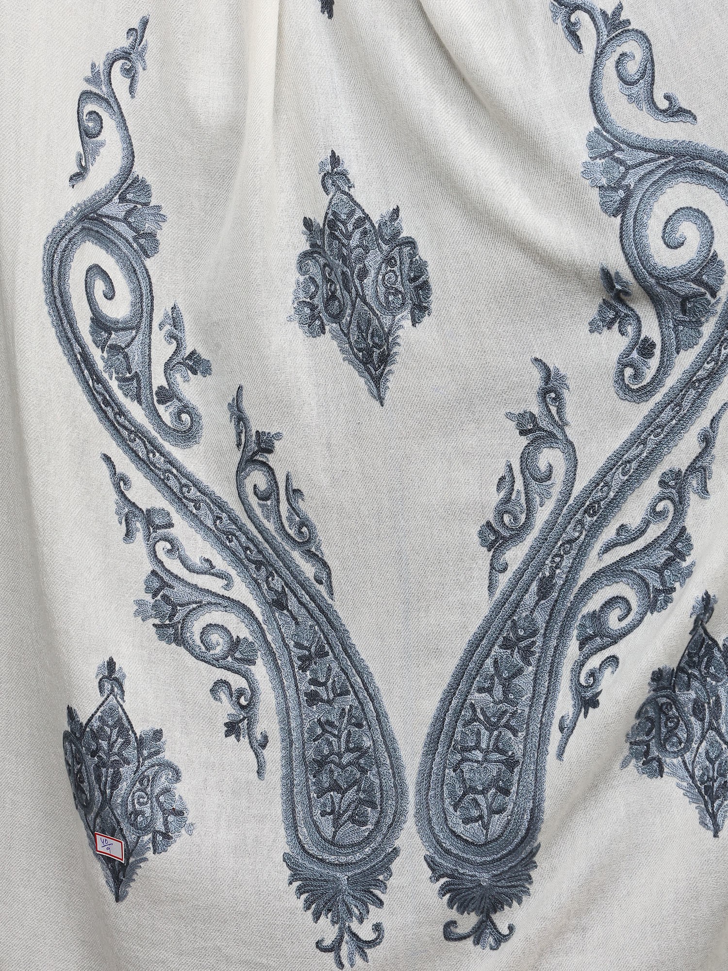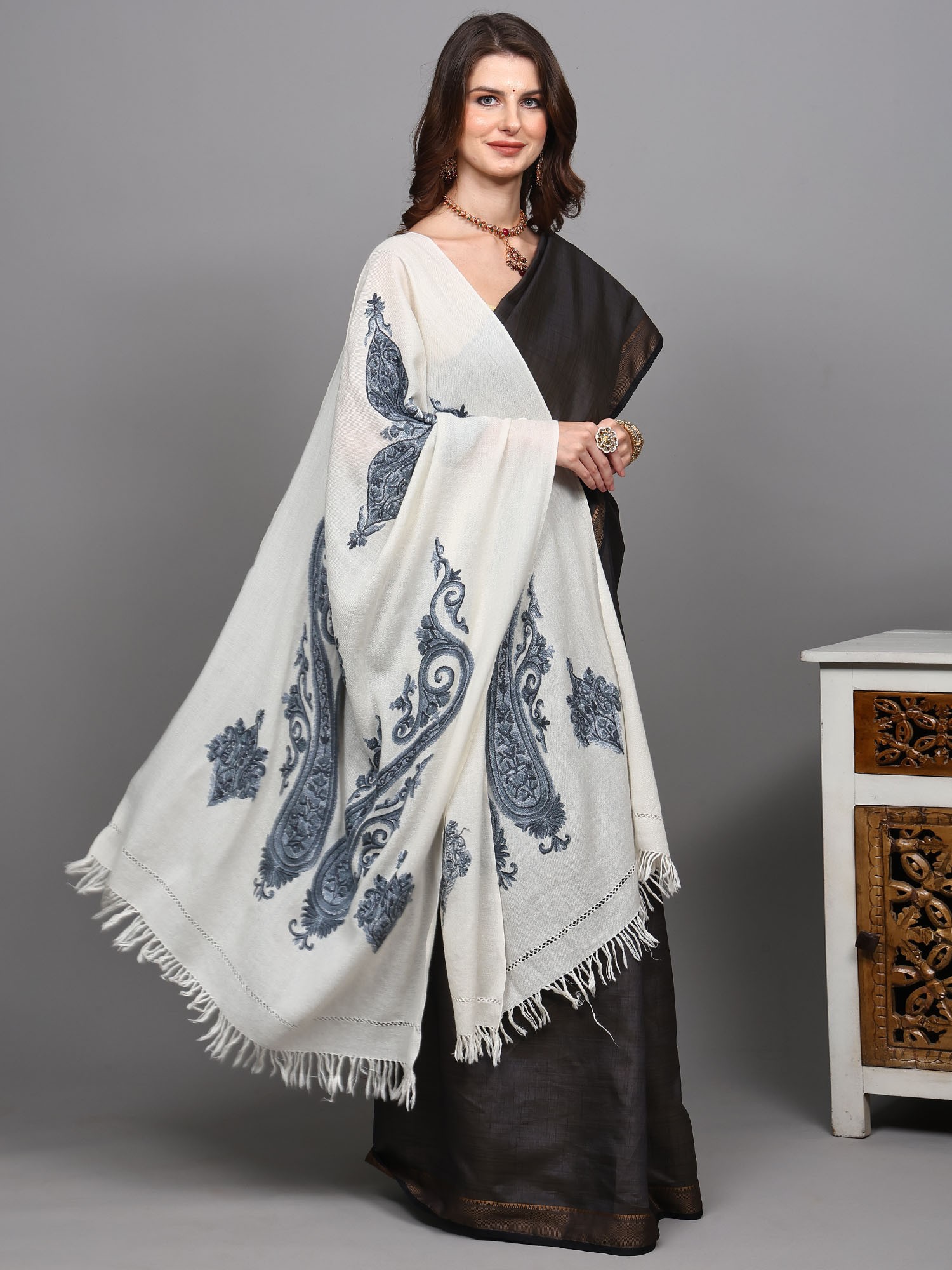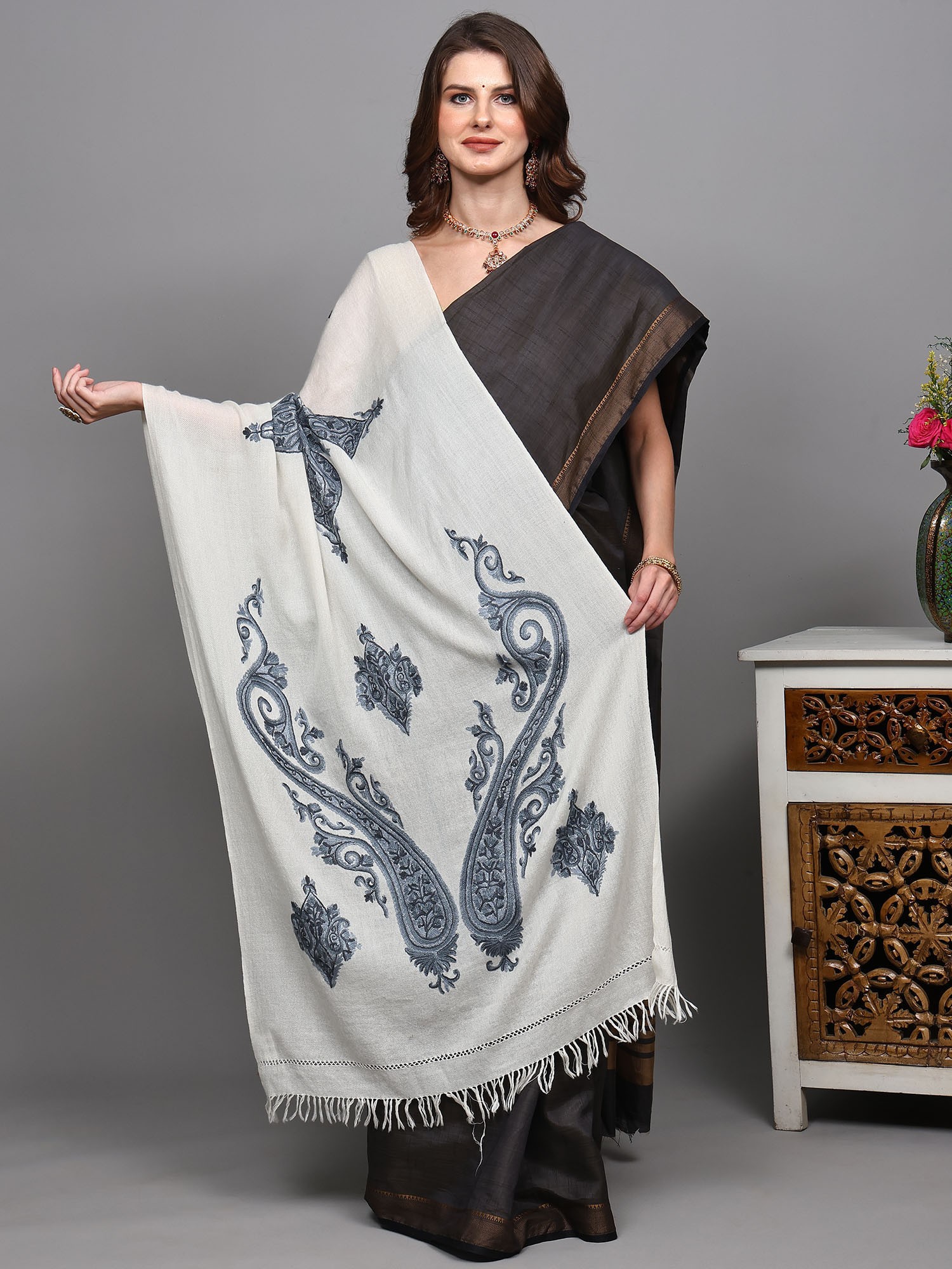 This pure wool Kashmiri stole is a must-have for any warm-weather wardrobe. This stole with Aari embroidery interwoven with golden thread paisleys, and pure wool is a piece of art to be cherished. It is a traditional handicraft from the house of Kashmiri Stole. The paisleys are embroidered by hand, and the design is very intricate. It can be worn at any time, day or night, on formal or informal occasions. The highlight of this conventional stole is its fine quality woollen fabric and exquisite craftsmanship, making it an excellent accessory for all seasons. This hand-embroidered shawl can be worn as a wrap or draped around the shoulders, creating a warm feeling. This stunning piece from our exclusive collection of fine Indian shawls and stoles features an intricately hand-embroidered paisley design with golden thread interwoven with aari embroidery. The paisley pattern has been used in India since the Mughal era, and its geometric shapes have come to symbolize life, love, and prosperity.