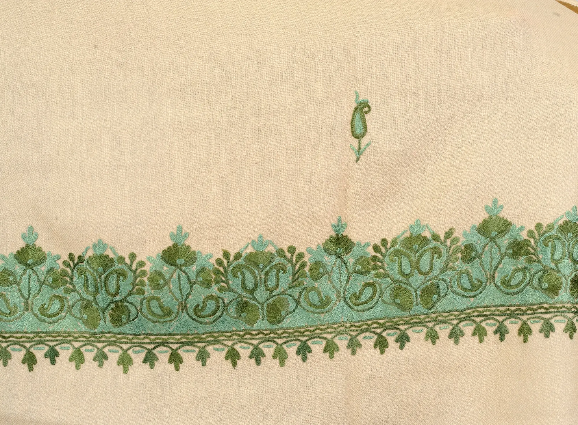 Our Kashmiri stole marries tradition and luxury seamlessly crafted from the world-renowned Pashmina wool, this stole showcases delicate crewel embroidered booties, meticulously created by Kashmiri artisans. The art of crewel embroidery dates back to the 17th century, introduced by the Mughals, and continues to be a hallmark of Kashmiri craftsmanship. The timeless design is as relevant today as it was in its inception. The stole's rich, earthy colors and soft feel will elevate your fashion ensemble with a touch of regal charm, connecting you to centuries of artistry.
