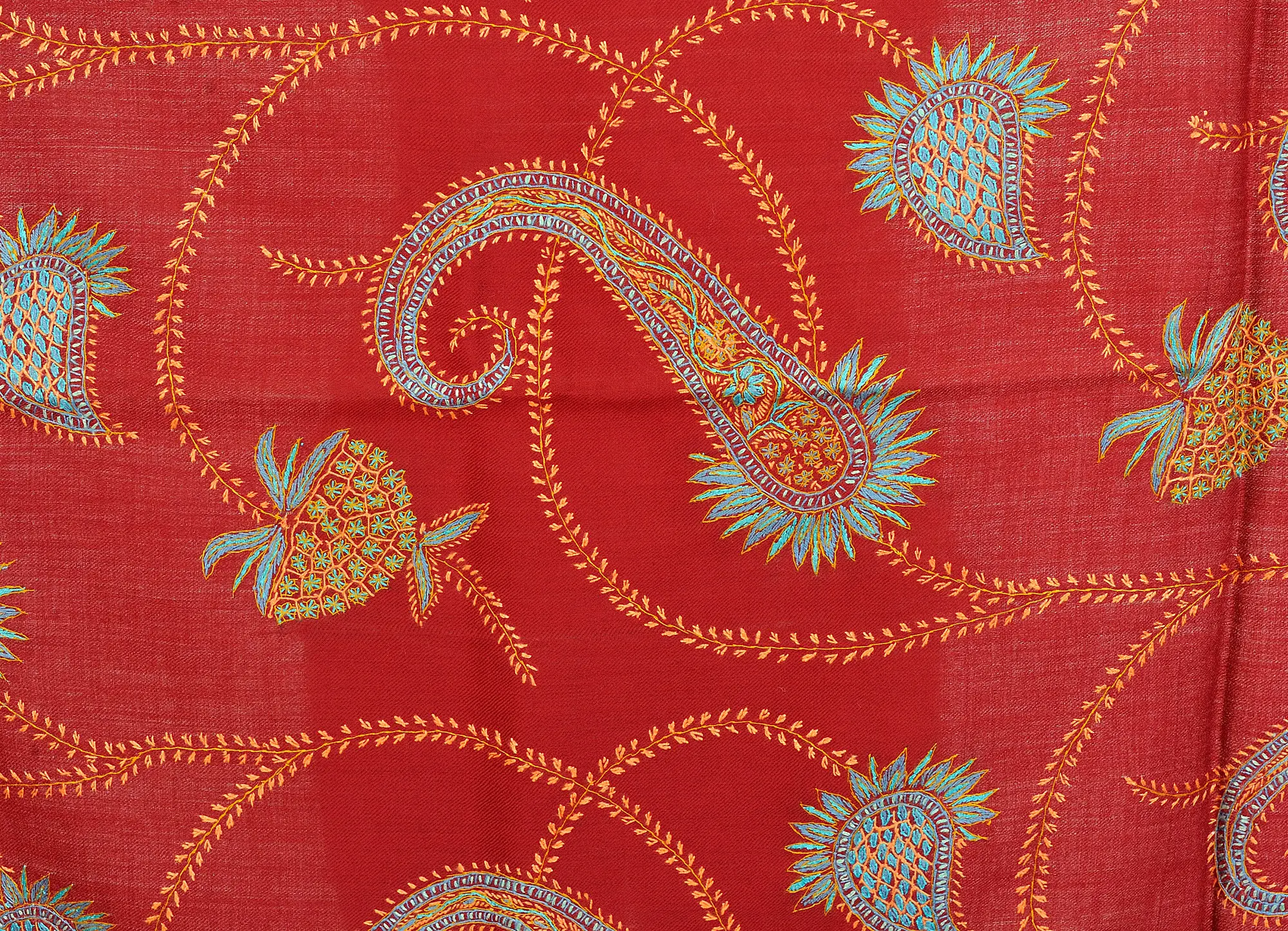 Garnet-Red Tusha Salwar Kameez Fabric from Kashmir with Sozni Hand-Embroidery All-Over