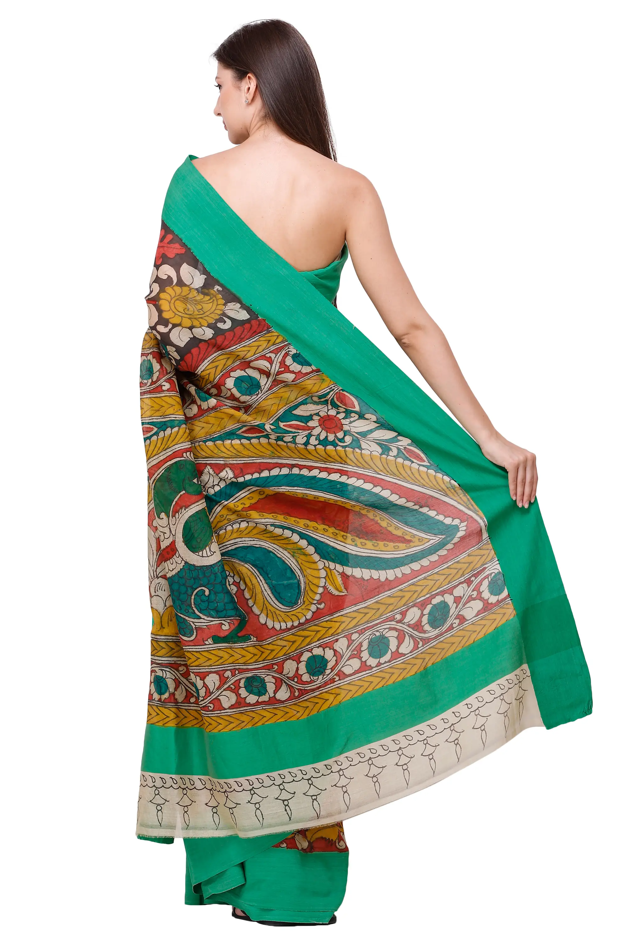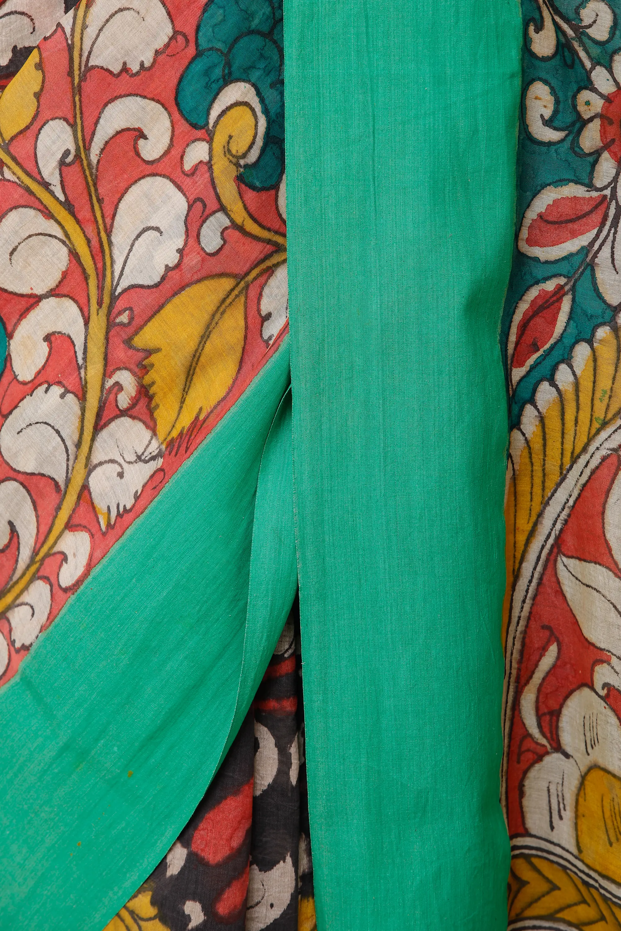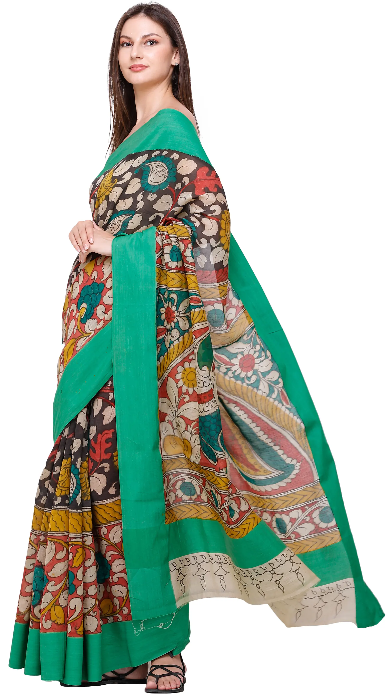 Immerse yourself in the rich heritage of Indian textile artistry with this captivating Kalamkari sari. Crafted from pure cotton, this exquisite piece drapes elegantly, offering both comfort and timeless style. The vibrant kelly green border provides a striking frame for the intricate hand-painted motifs that tell a story of tradition and beauty.