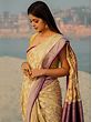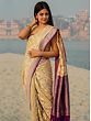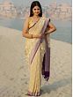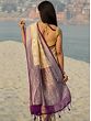 The softness of the beige body of the sari is enhanced by the floral patterns, while a hint of vibrancy is brought with the contrasting purple border, which adds a sudden and beautiful hue to the attire.