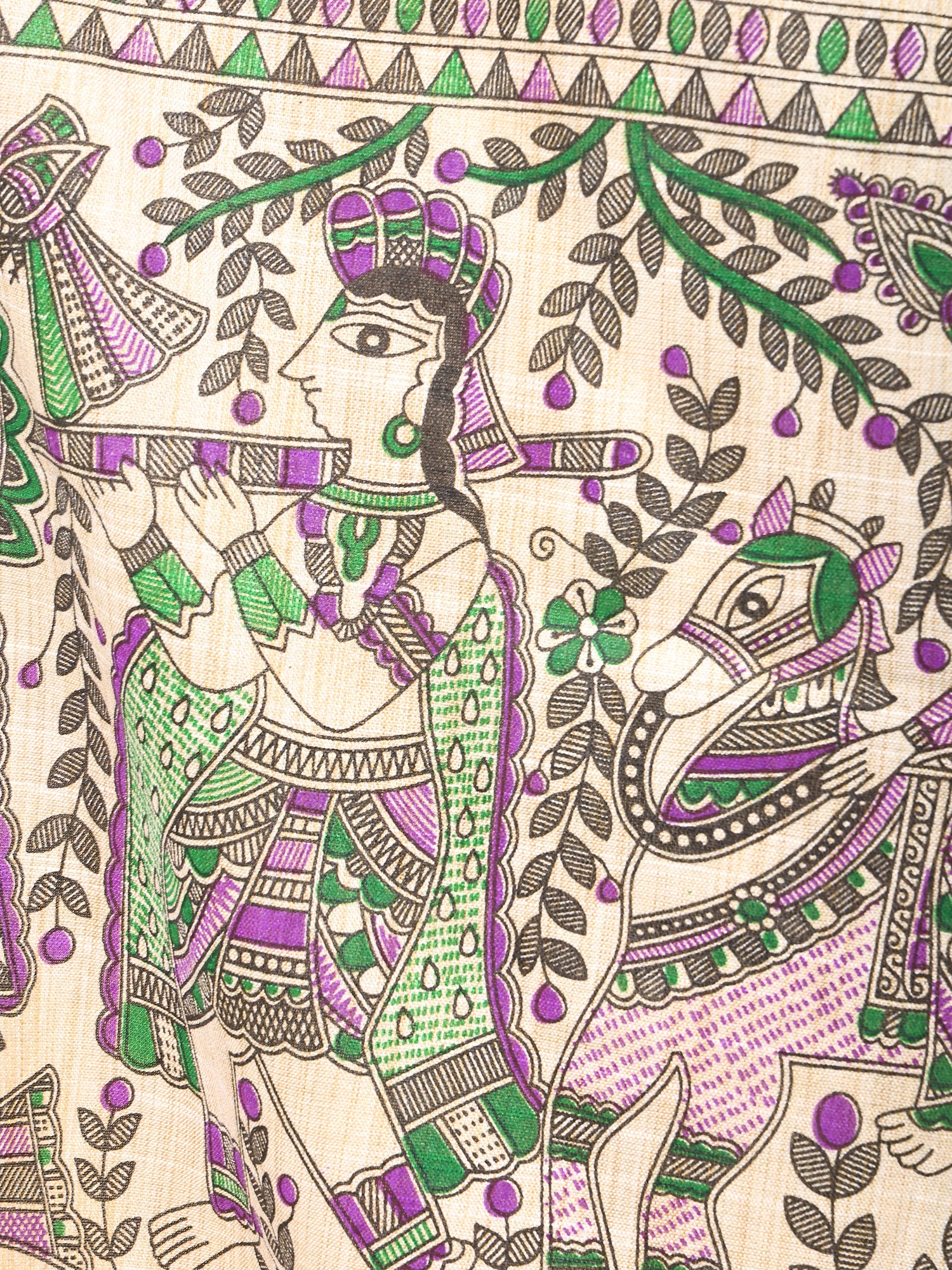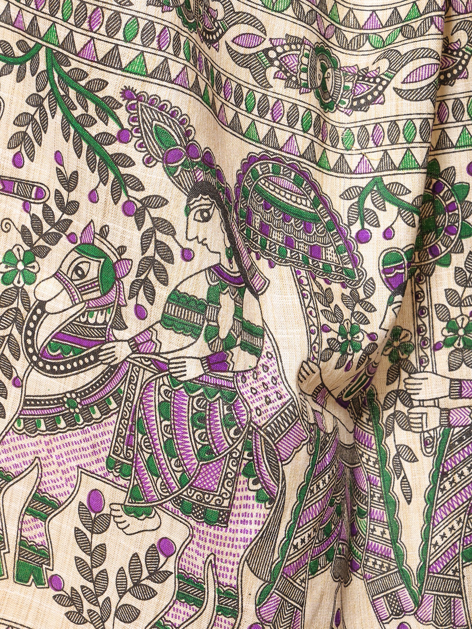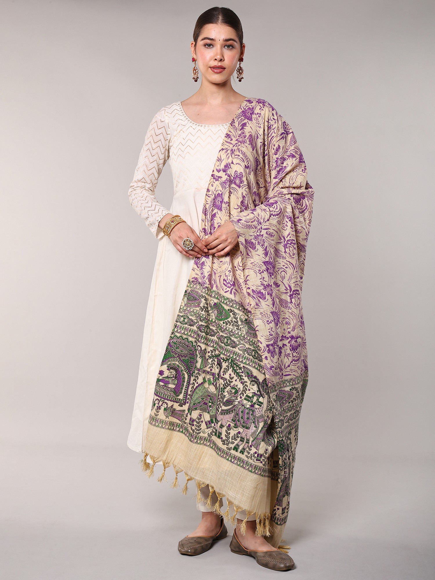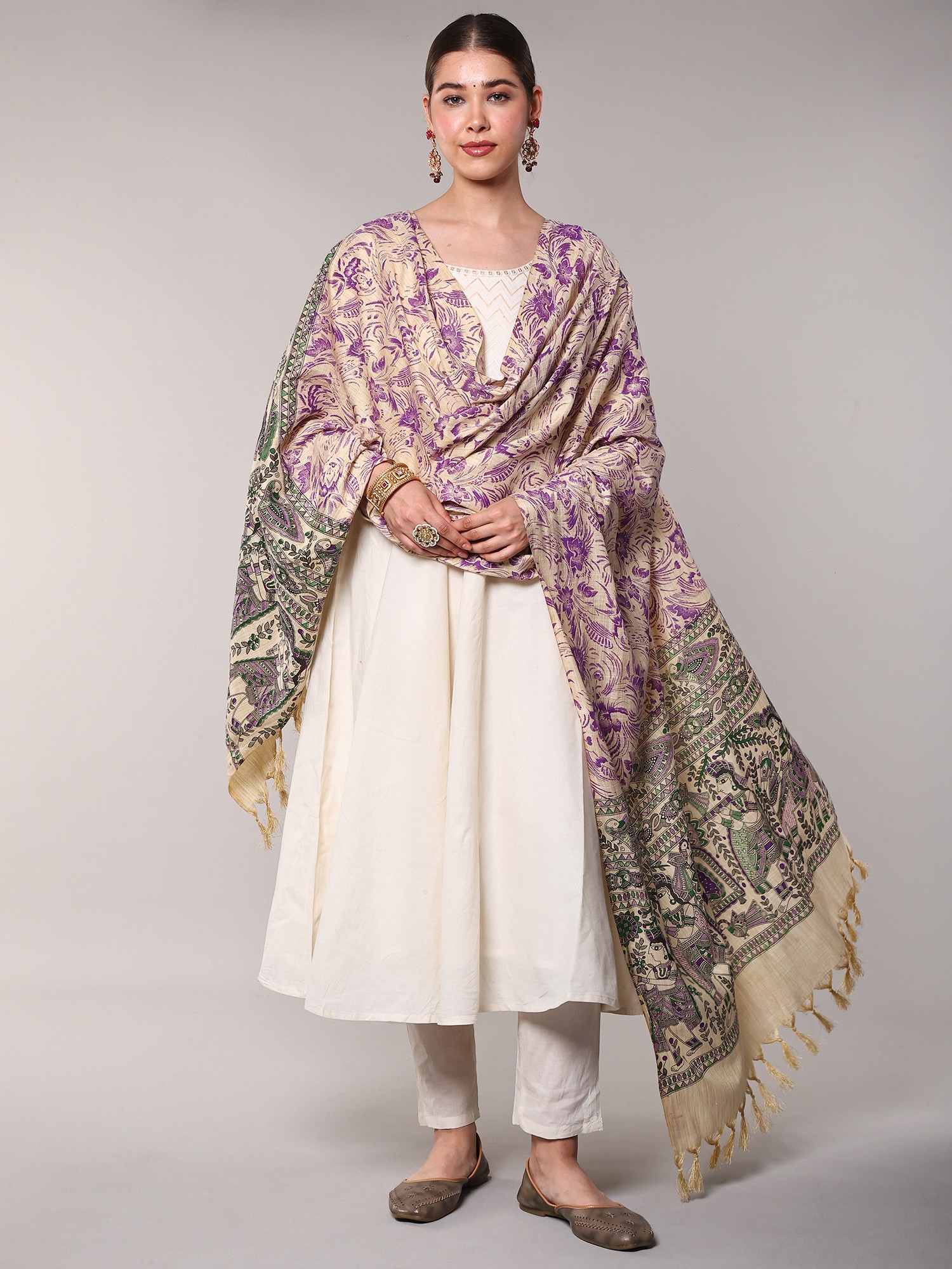 Carry an essence of India in your everyday looks, with this Khadi cotton beige dupatta, adorned with beautiful Madhubani motifs- the eternal symbol of the culture of Bihar. The soft hue of the fabric enhances its delicate feel. Traditional Madhubani patterns such as peacocks, fishes, and images from the legends of the region, decorate the hem of the dupatta, while the field is covered in charming leaf patterns.