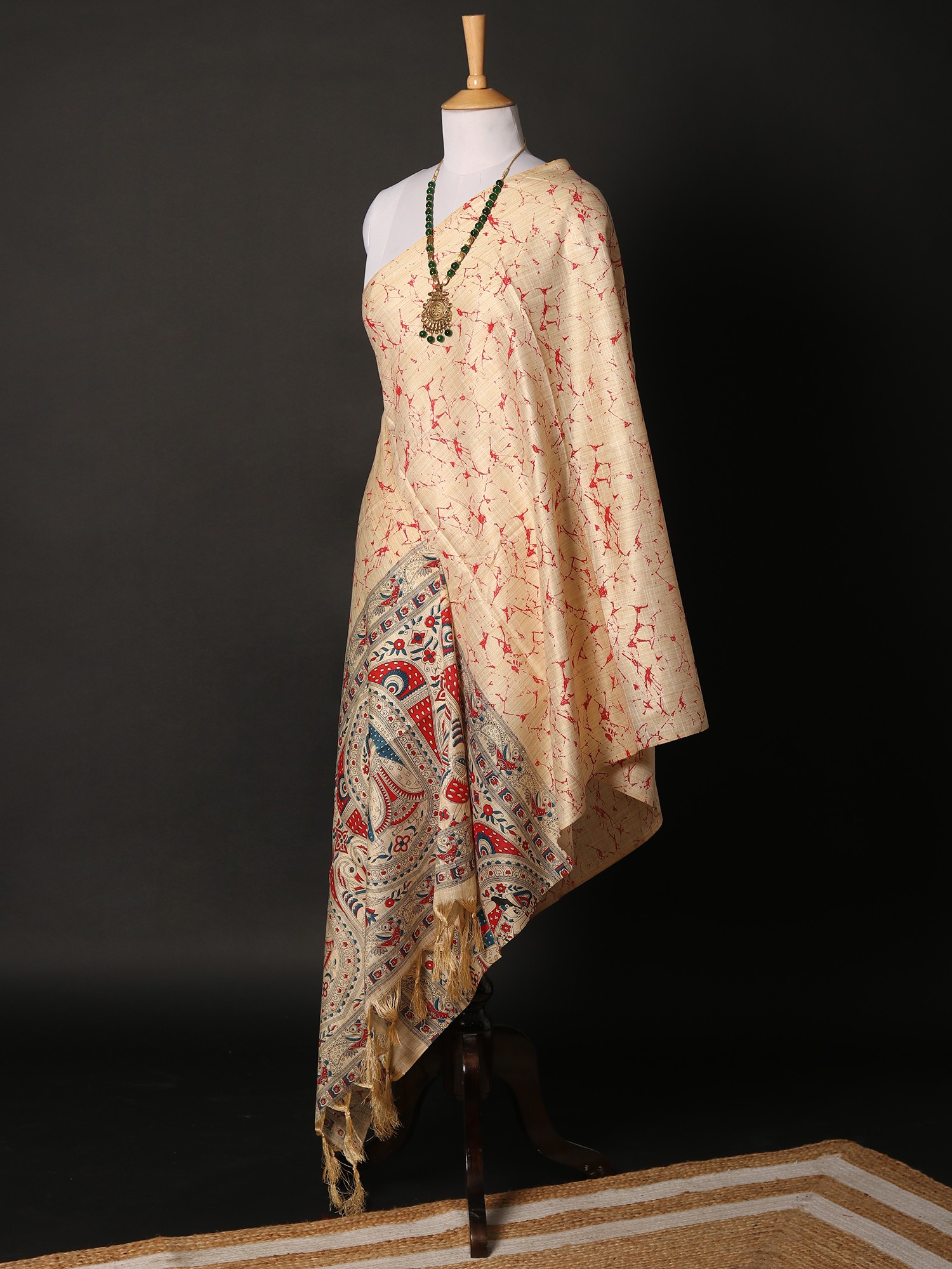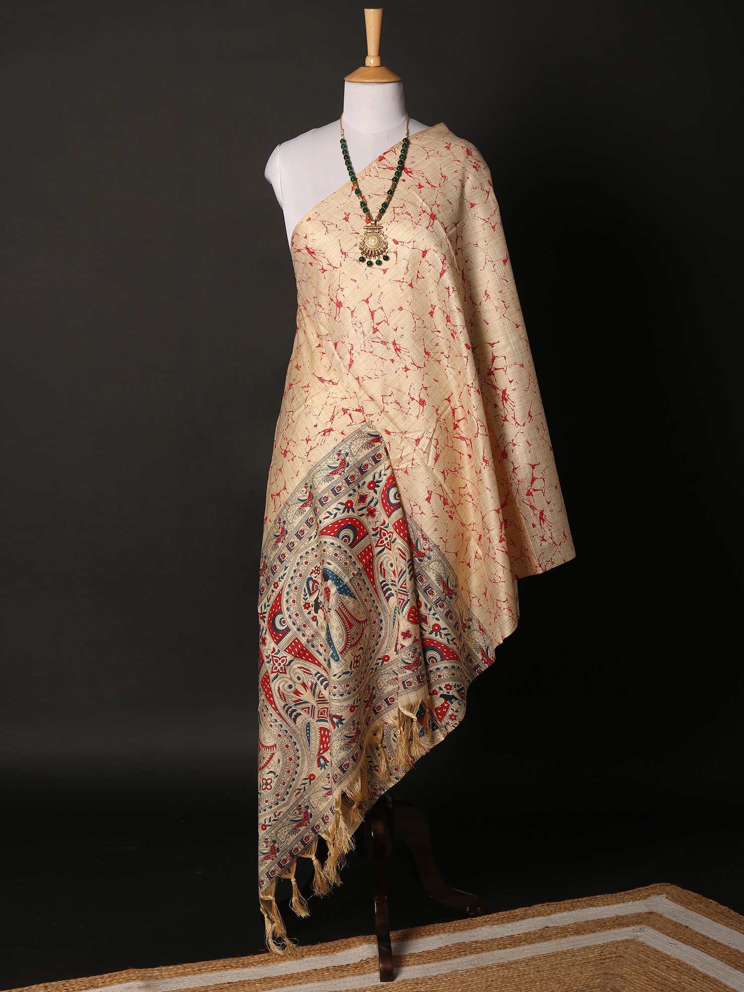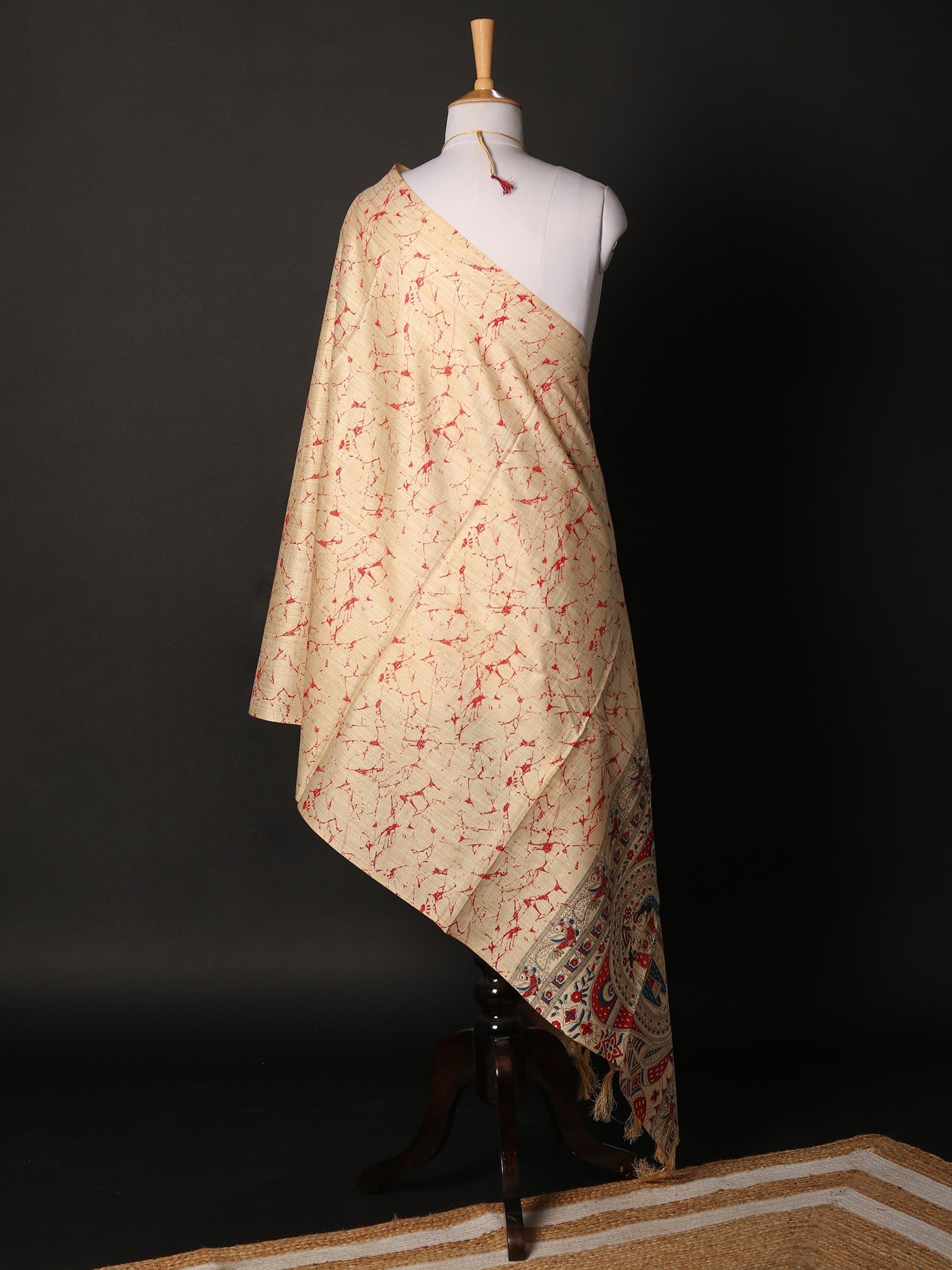 Carry an essence of India in your everyday looks, with this Khadi cotton beige dupatta, adorned with beautiful Madhubani motifs- the eternal symbol of the culture of Bihar. The soft hue of the fabric enhances its delicate feel. Traditional Madhubani patterns such as peacocks, fishes, and images from the legends of the region, decorate the hem of the dupatta, while the field is covered in charming leaf patterns.