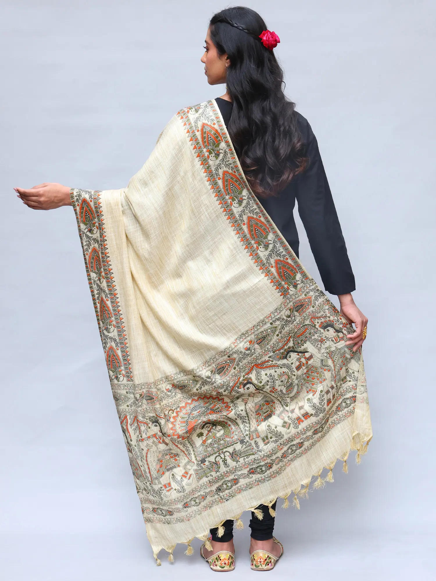 This generously sized shawl is designed to be your go-to accessory for a variety of occasions. Drape it over a simple black kurta for an effortlessly chic ethnic look, or layer it over a western outfit to add a touch of bohemian flair. Its substantial length ensures it can be styled in numerous ways – as a traditional wrap, a chic scarf, or even as a statement piece over a jacket. The neutral base of the Khadi cotton allows the vibrant Madhubani motifs to truly stand out, making it a conversation starter and a testament to your discerning taste. Whether you are attending a festive gathering, a casual outing, or simply wish to elevate your everyday style with a touch of artistry, this Madhubani shawl promises to be a cherished addition to your wardrobe.