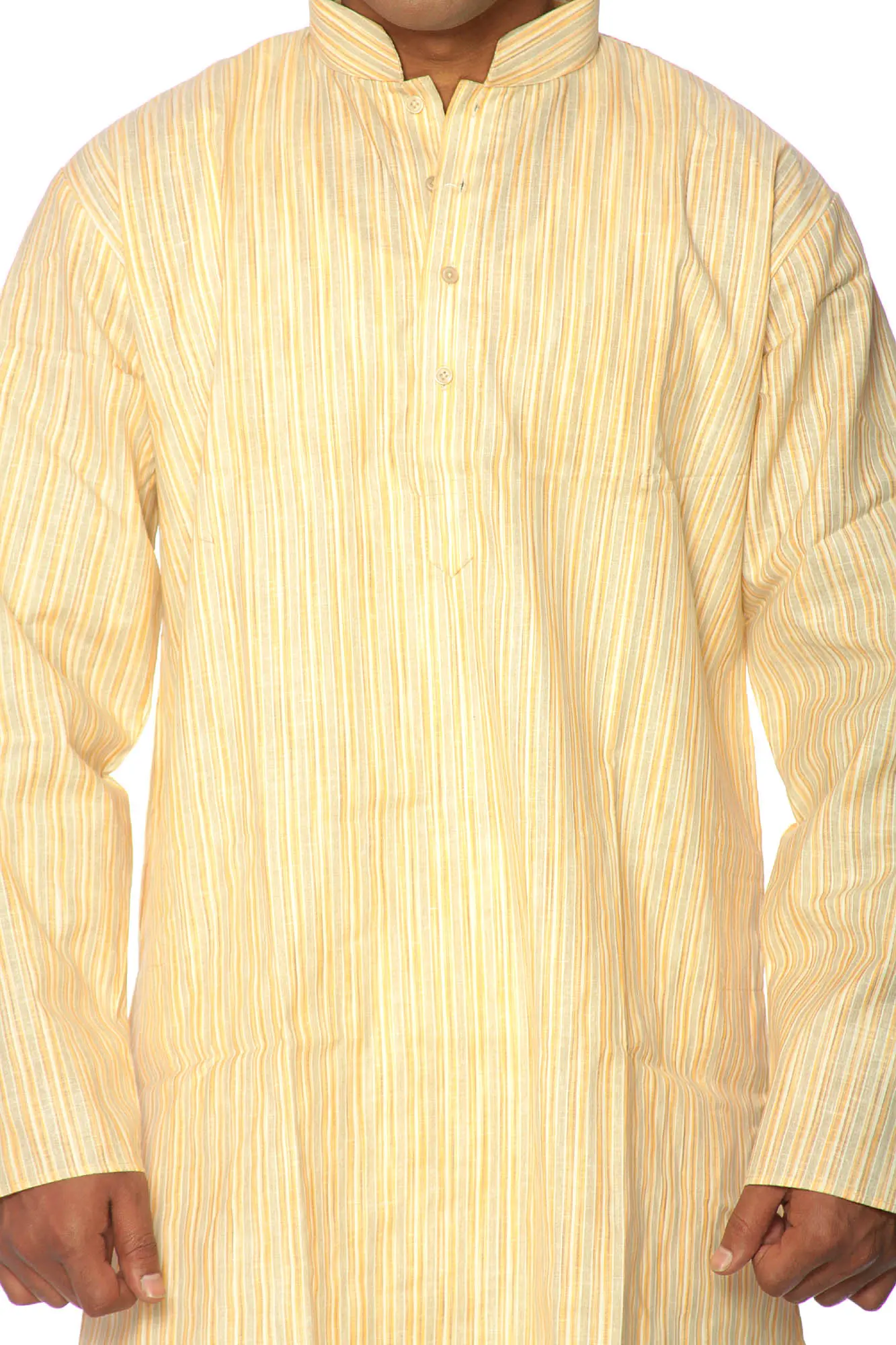 Discover the perfect blend of traditional charm and contemporary style with this exquisite Khadi Kurta Pajama set. Crafted from pure cotton, this ensemble offers unparalleled comfort and a light, breathable feel, making it an ideal choice for any occasion, from festive gatherings to casual outings. The fabric's natural texture lends an authentic, artisanal touch, ensuring you look and feel your best. The kurta features a classic mandarin collar, a hallmark of traditional Indian menswear, paired with a simple buttoned placket that adds a touch of understated sophistication. The long sleeves provide a clean silhouette, while the side slits offer ease of movement, ensuring comfort throughout the day. What truly sets this kurta apart is its captivating woven stripe pattern. Delicate vertical stripes in varying shades of yellow and subtle hints of other complementary colors create a visually appealing texture that is both modern and timeless. These subtle yet striking stripes add depth and character to the garment, making it a standout piece in any wardrobe. This kurta pajama set is designed to be versatile. The neutral, off-white pajama bottoms offer a clean canvas that complements the patterned kurta perfectly. They are cut for a comfortable, relaxed fit, allowing for maximum freedom of movement. This ensemble can be effortlessly styled for various events. Dress it up with traditional juttis or sandals for a wedding or religious ceremony. For a more casual look, pair it with simple loafers or even stylish sneakers for a modern twist. Accessorize with a complementary stole or a subtle piece of jewelry to complete your ensemble. The pure cotton fabric ensures that this kurta pajama remains a comfortable and breathable option even in warmer weather. The natural fibers are gentle on the skin and offer excellent durability, meaning this piece will be a staple in your wardrobe for years to come. The meticulous stitching and attention to detail reflect a commitment to quality craftsmanship, ensuring that every aspect of this garment is designed for both style and longevity. Embrace the elegance of tradition with this beautifully crafted Khadi Kurta Pajama, a testament to refined taste and comfortable sophistication.