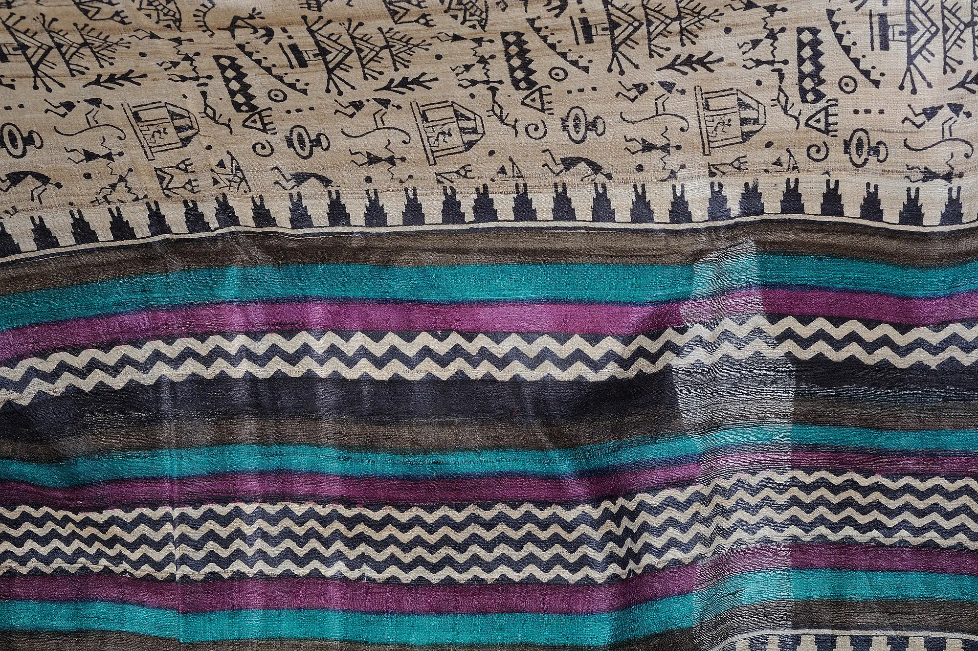 Adding a touch of contemporary flair and visual dynamism to the traditional artwork is the sari's border. This captivating border features a series of bold, horizontal stripes in a harmonious blend of colors. Rich shades of deep purple and vibrant teal are interspersed with classic black and earthy brown, separated by characteristic zig-zag patterns. This modern interpretation of a traditional border elevates the sari, offering a delightful contrast to the intricate Warli prints and lending an air of modern elegance. The interplay of colors and geometric patterns in the border creates a striking visual appeal, ensuring the sari catches the eye and sparks conversation.