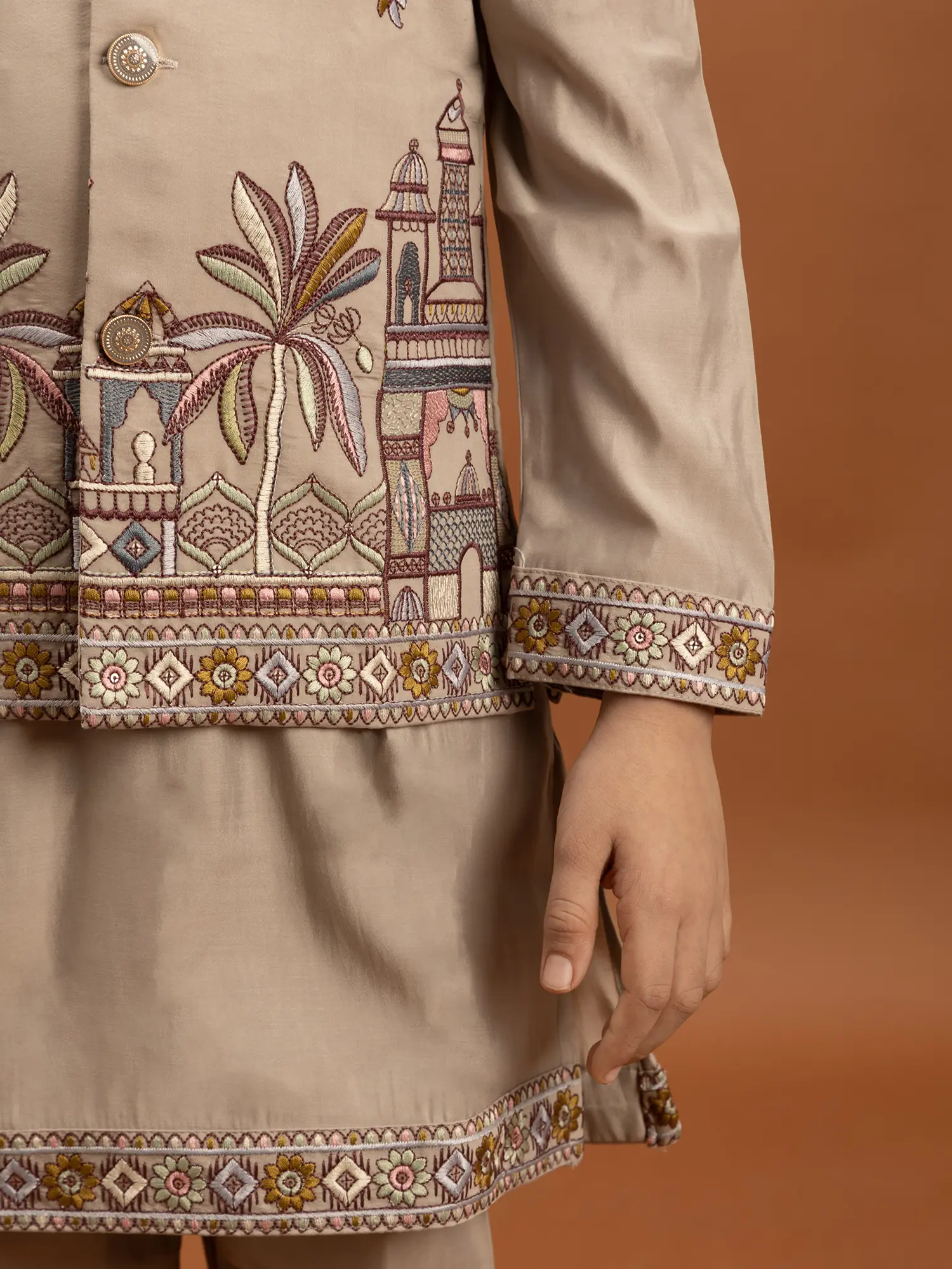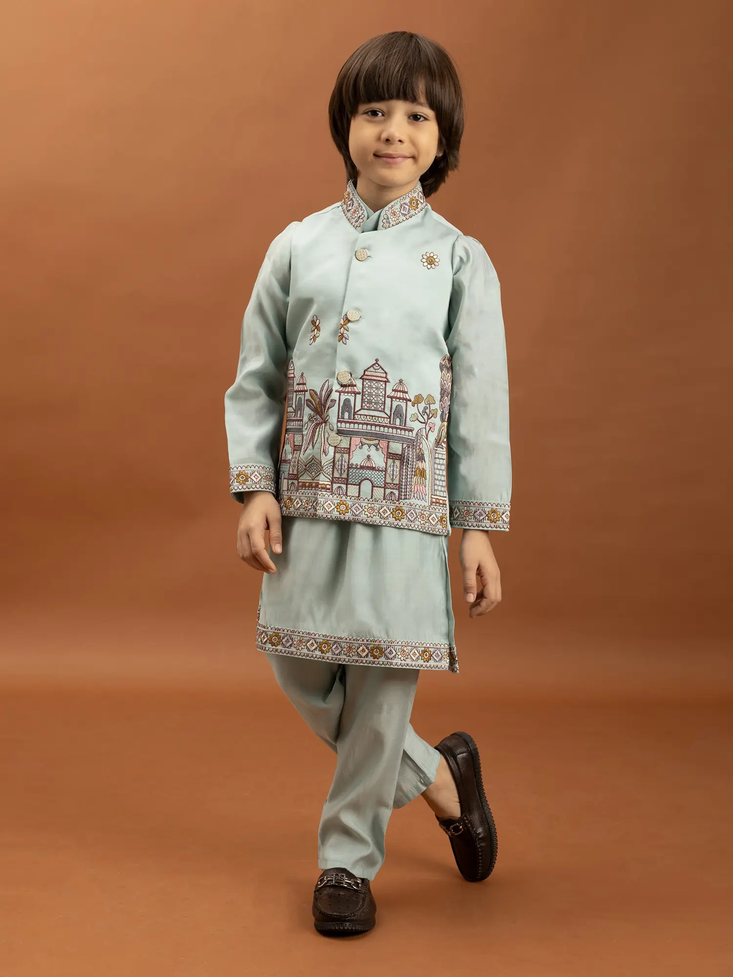 Robin-Egg Blue Bandgala Kurta Set with All-Over Weave and Threadwork