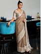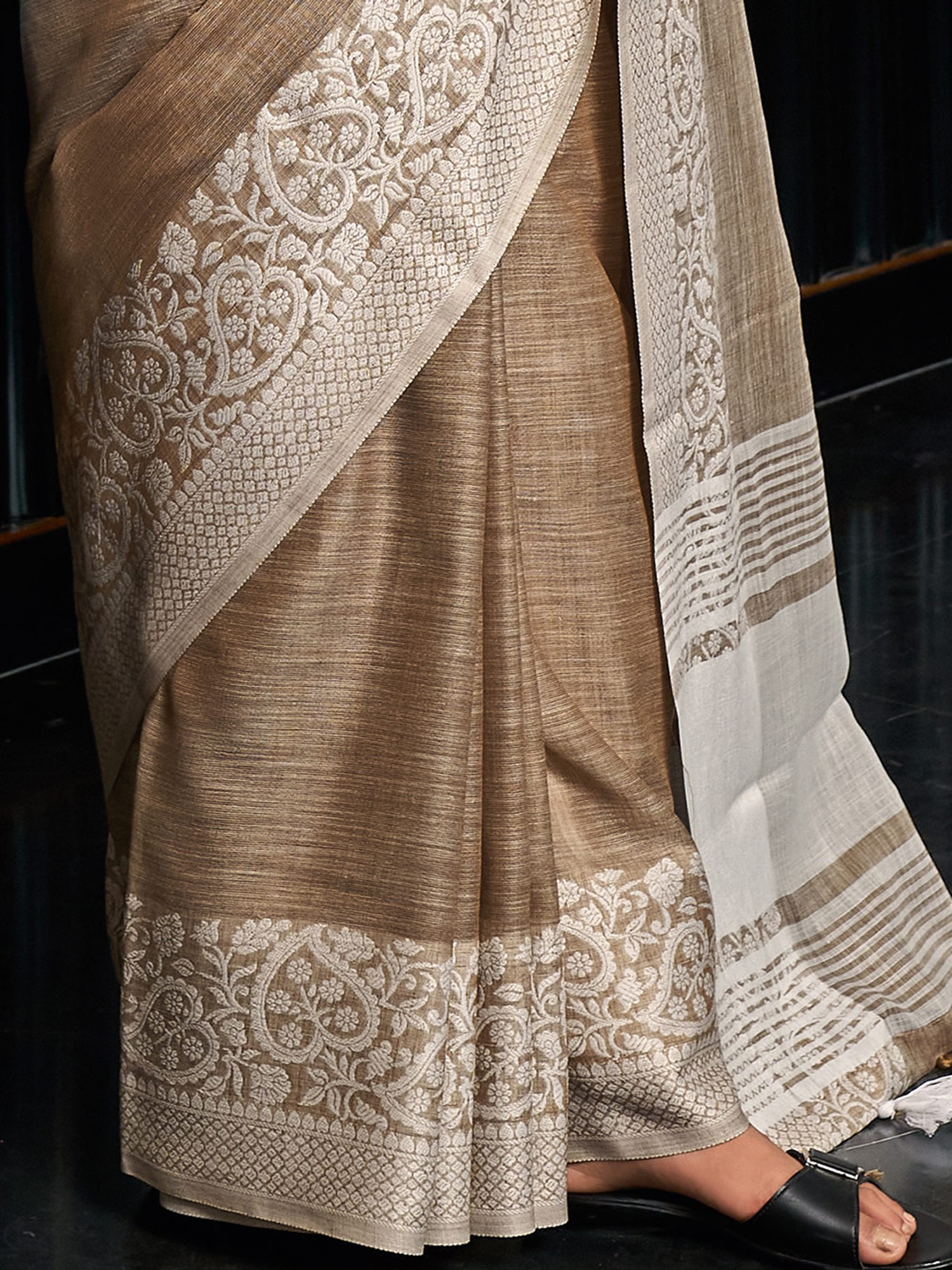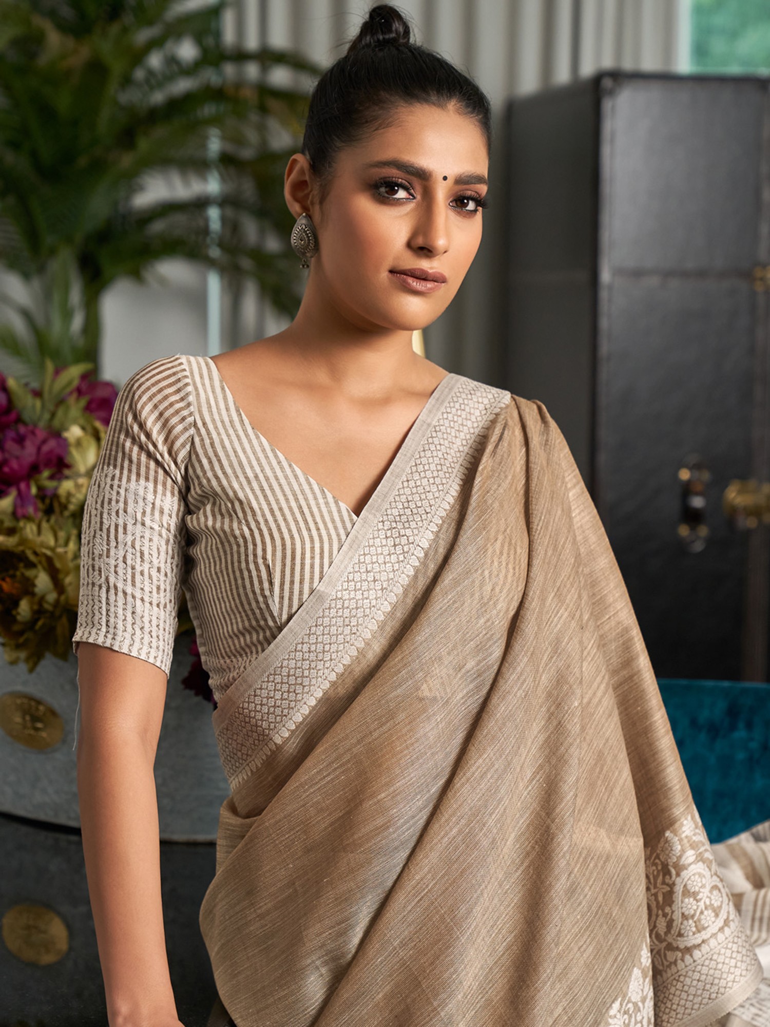 Experience an understated regalia in this Kota cotton saree, where simplicity becomes a fashion statement. The plain drape of Kota cotton is beautifully decorated with Paan leaf vines on the border, with miniature floral motifs and intricate ethnic patterns creating a rich detail. Paired with a beautiful blouse that complements the look, this saree is for the queen in you, who believes in the luxury of minimalism.