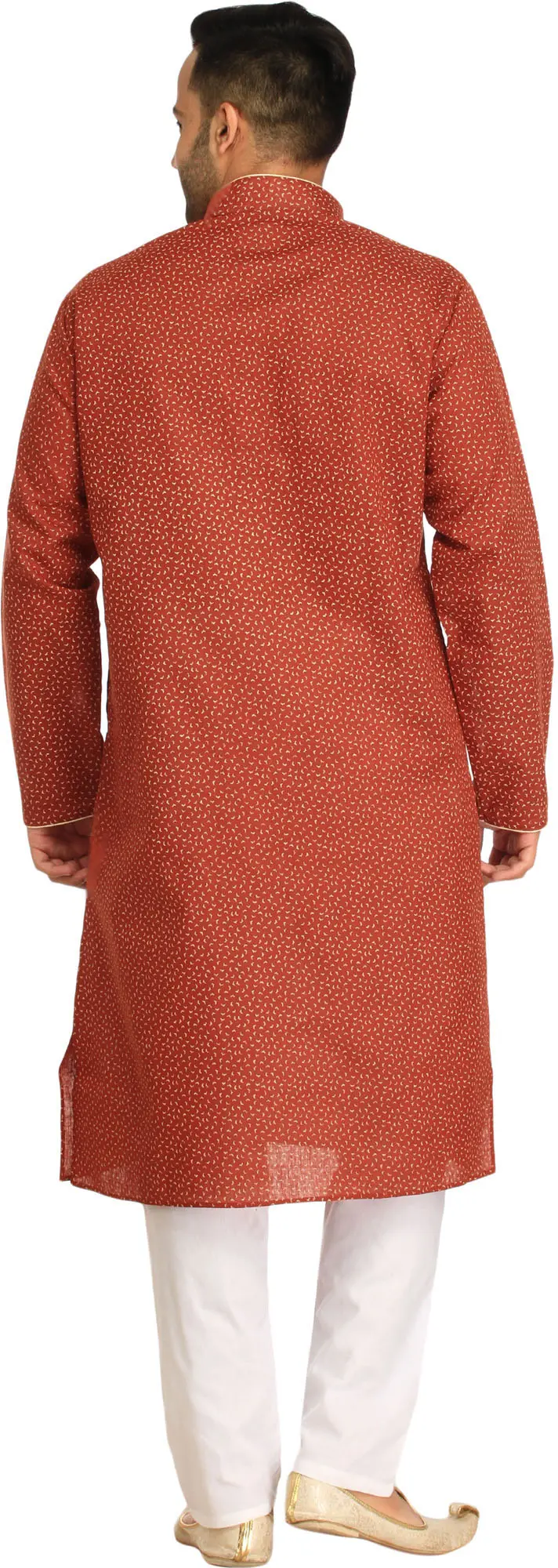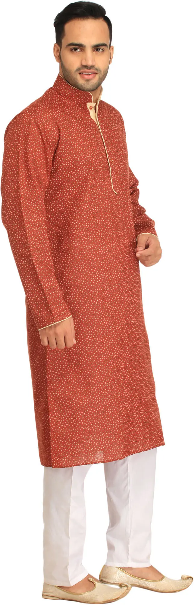 Crafted from Pure cotton, this “Kurta Pajama” with “Printed Small Bootis” and “Piping” offers superior comfort and breathability, making it perfect for auspicious occasions. It is a classic attire, which combines tradition with style. The small Booti print gives an elegant touch to the ensemble, while the contrasting piping highlights the meticulous craftsmanship. Whether you are attending a wedding or a casual get-together, this outfit is a cherished choice that exudes sophistication and showcases the beauty of pure cotton fabric.
