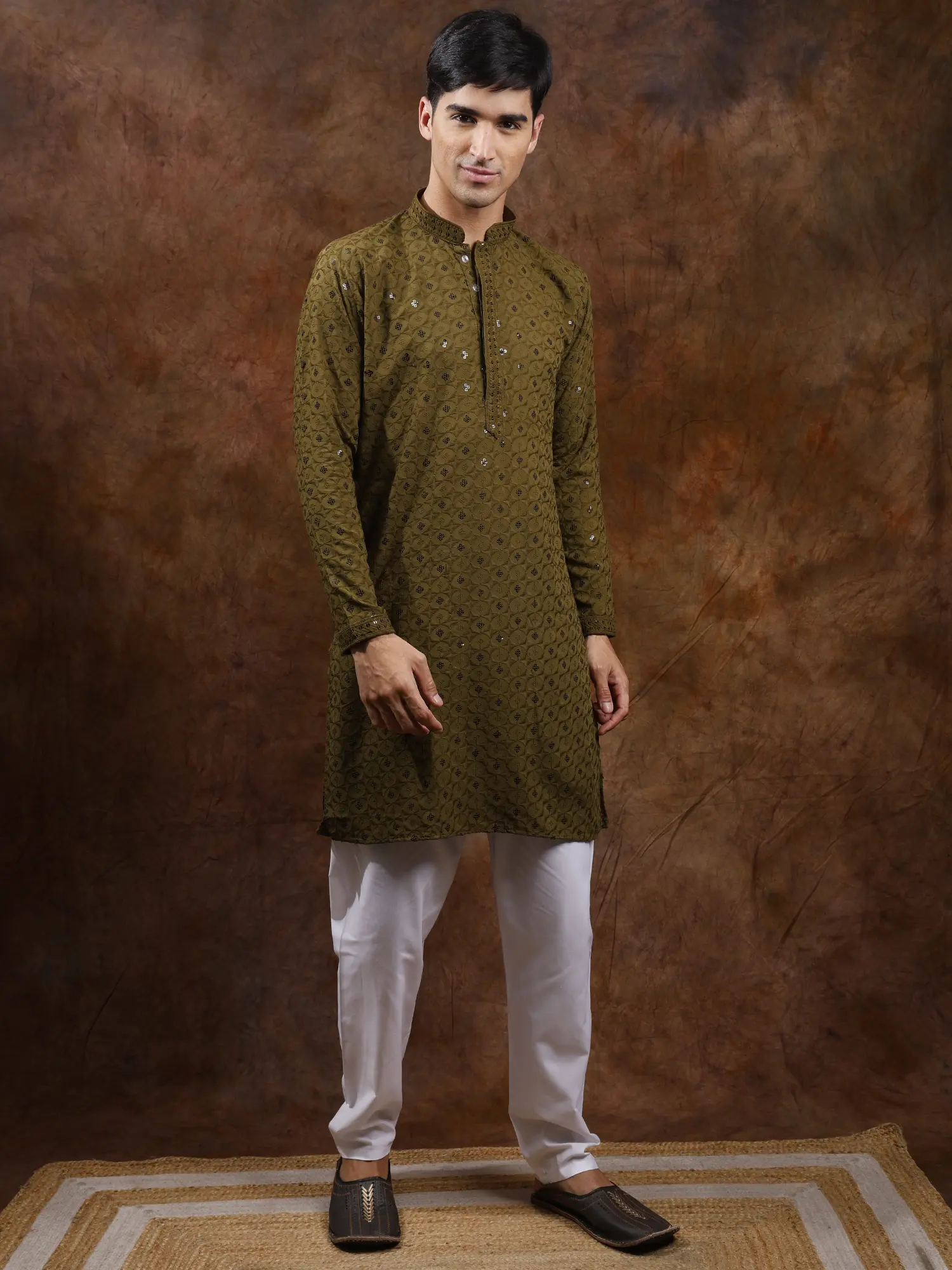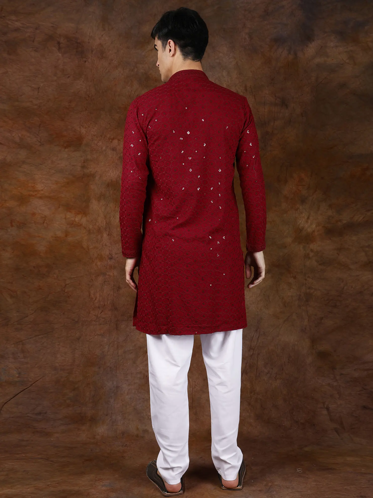 Cotton Sequins & Thread Embroidered Kurta with Plain Pajama