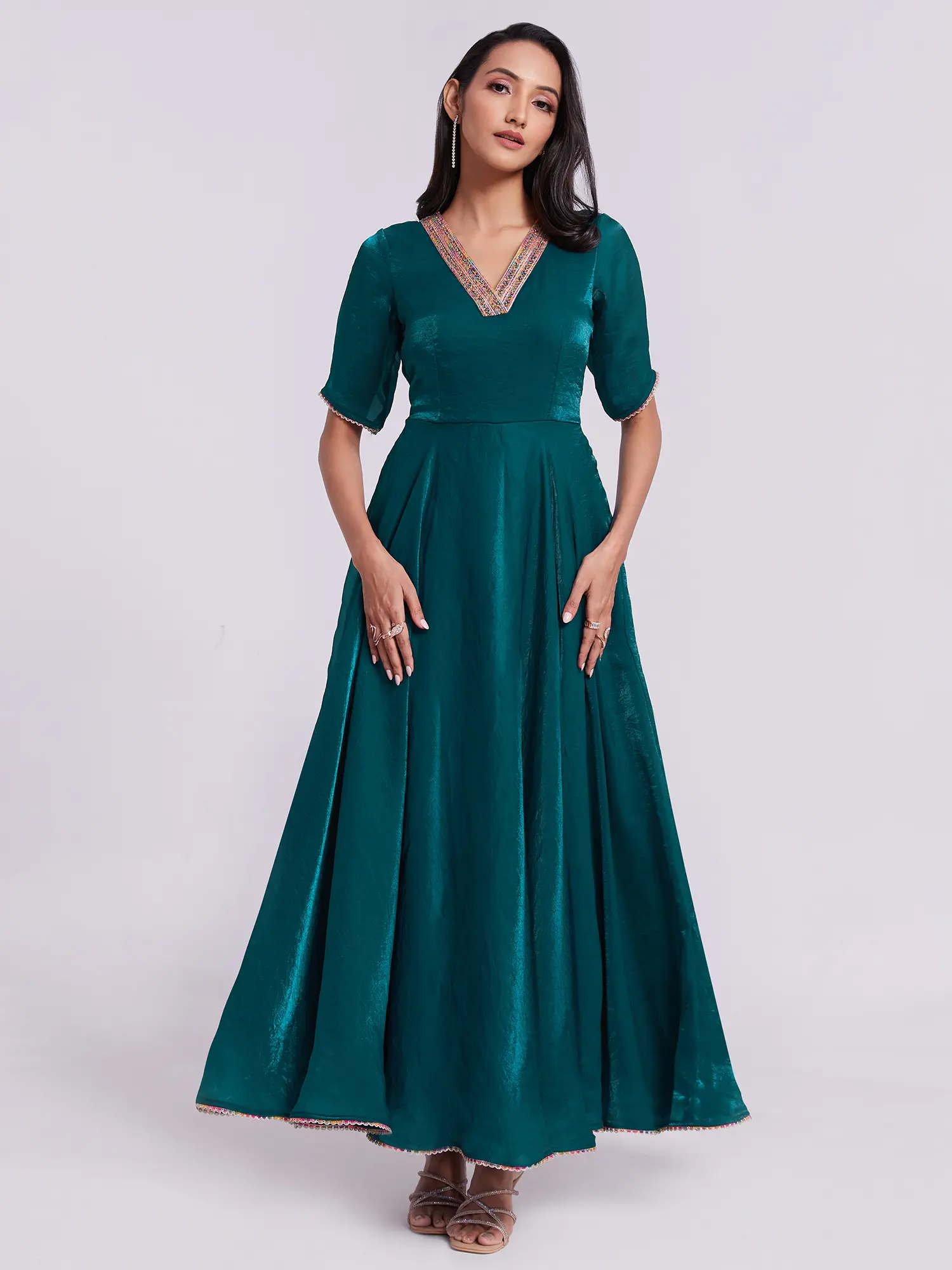 Step into a realm of elegance and sophistication with this breathtaking pure organza gown. Crafted from the finest organza fabric, this piece offers a luxurious feel and a graceful drape that will make you the center of attention at any party or special event. The rich, deep teal hue exudes a sense of regal charm, while the subtle textured weave of the organza adds depth and visual interest.