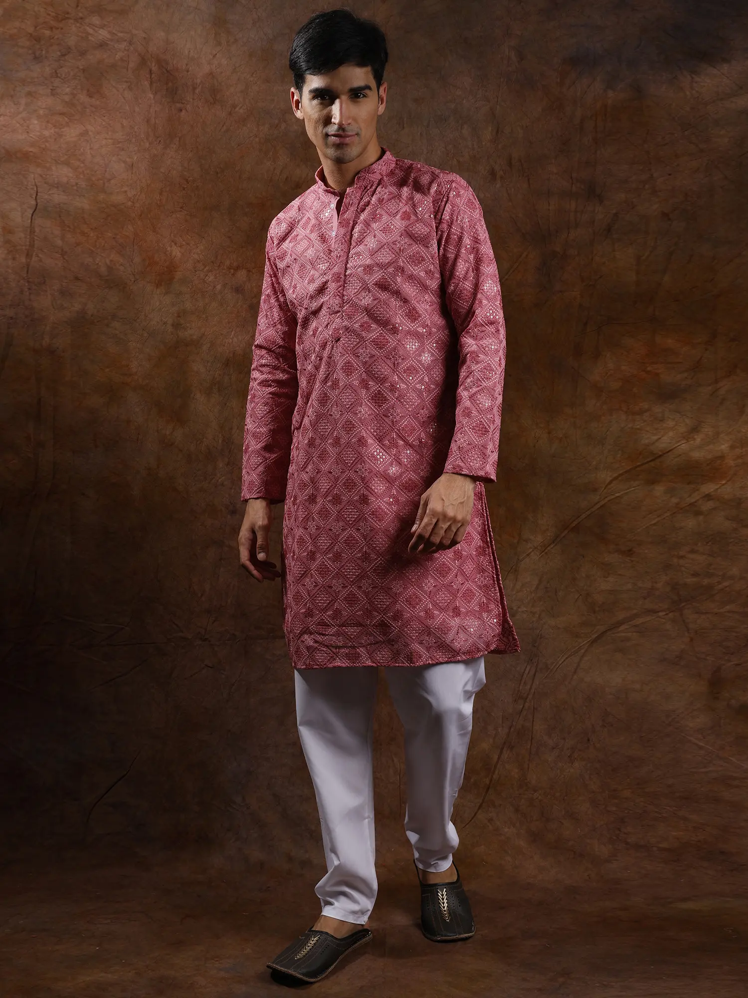 This kurta pajama set is a celebration of subtle luxury and traditional design. The muted yet rich color palette, combined with the sophisticated metallic embroidery, makes it suitable for a variety of occasions. It’s perfect for casual celebrations, cultural events, or even as elevated everyday wear when you desire a touch of understated opulence. Pair it with traditional mojaris or even smart loafers for a contemporary twist. This set embodies the spirit of effortless style, offering a sophisticated look that is both comfortable and culturally resonant. Experience the allure of traditional embroidery brought to life with modern sensibilities in this beautifully crafted ensemble.