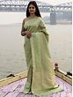 A refreshing pick from the tradition of hand-crafted pure silk Banarasi sarees, this Katan Patola silk sari is alluring in its muted shades and rich Zari work done against the light green silk. The body of the saree is covered in parallelly running lines created with shimmering Zari, giving it a symmetrical beauty, while triangular patterns parallel to the border bring a variety to the designs which enrich the sari. Adorning the modernity of the field of the sari, the border is kept pristinely traditional where lines of flowering vine bloom majestically.