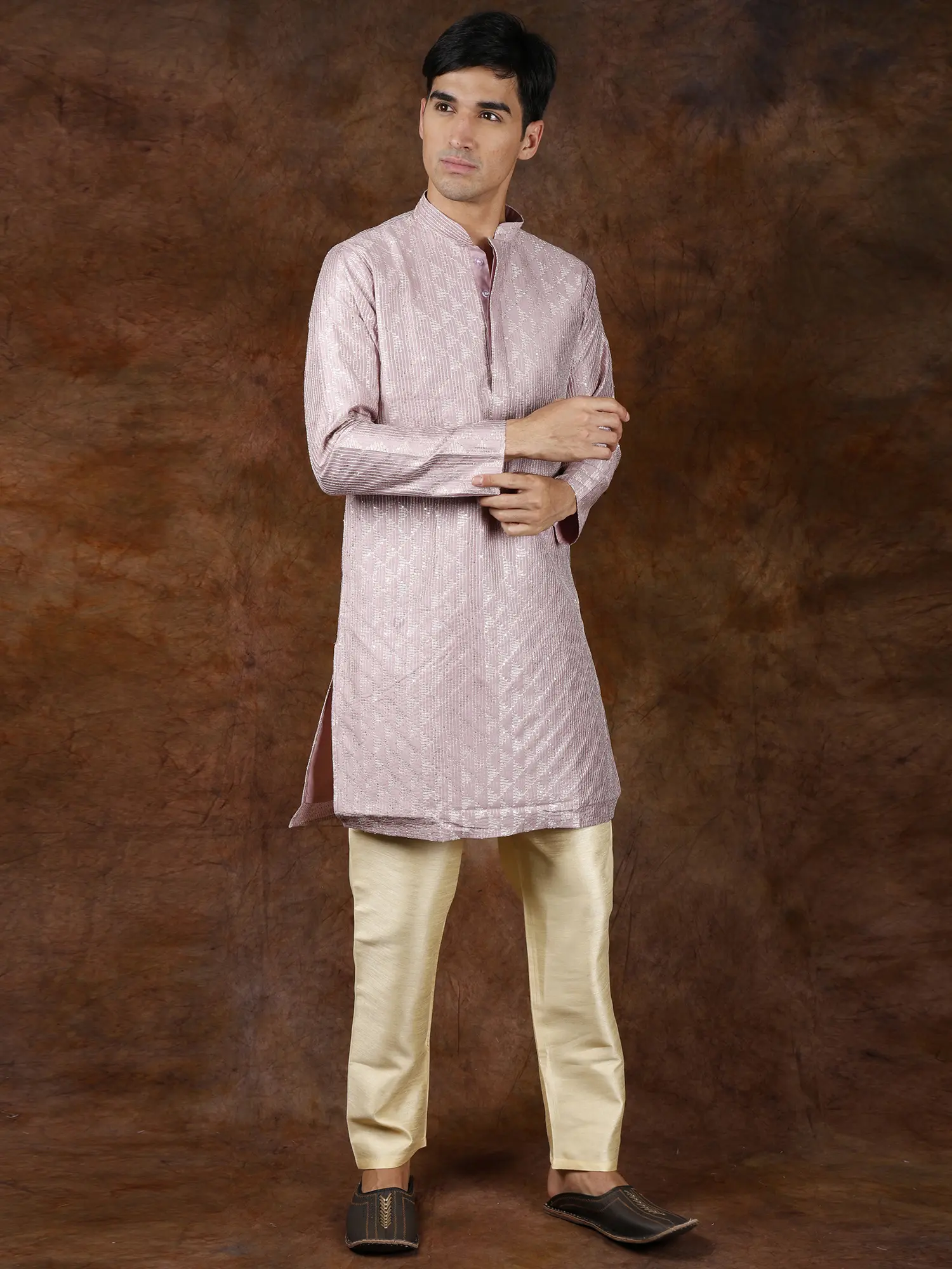 The kurta is perfectly paired with a luxurious cream-colored pajama. Crafted from art silk, this pajama offers a smooth, lustrous finish that complements the embroidered kurta with understated elegance. The cream shade provides a classic and versatile base, allowing the intricate details of the kurta to take center stage. The relaxed fit of the pajama ensures comfort, making it ideal for extended wear during events. Together, the kurta and pajama create a harmonious and sophisticated silhouette, embodying the spirit of traditional Indian wedding attire while offering a modern sensibility. This ensemble is an investment in enduring style, perfect for making cherished memories on significant occasions.