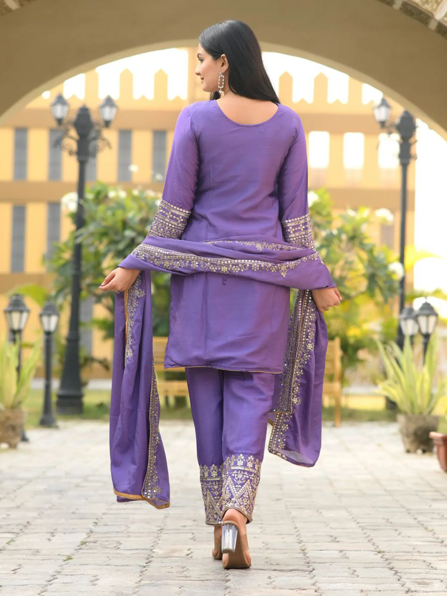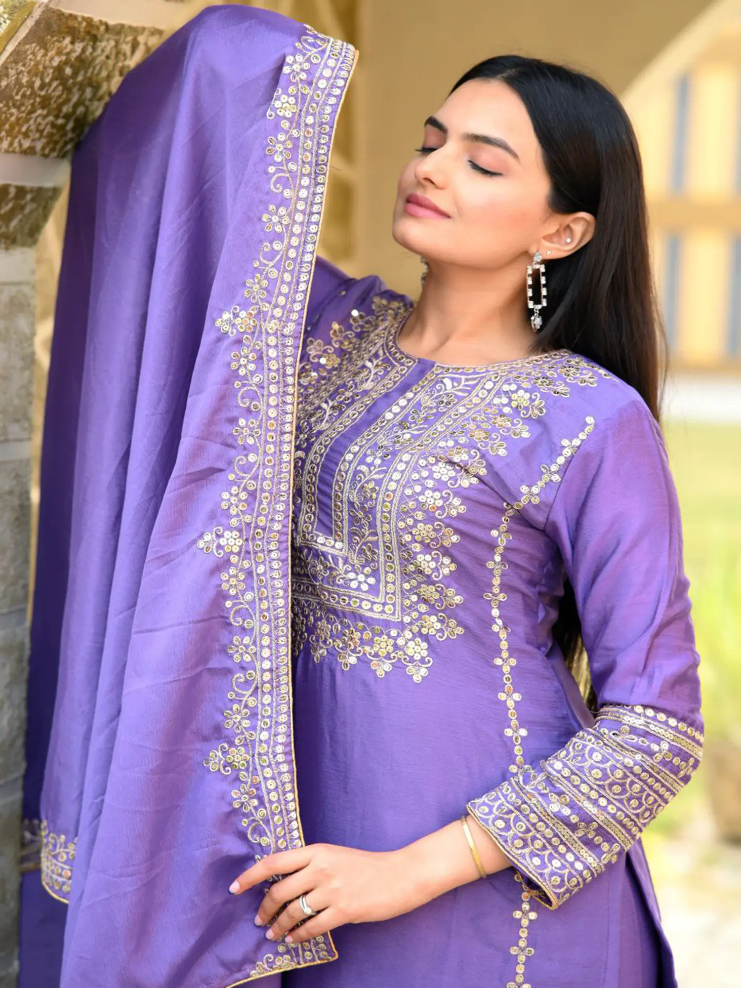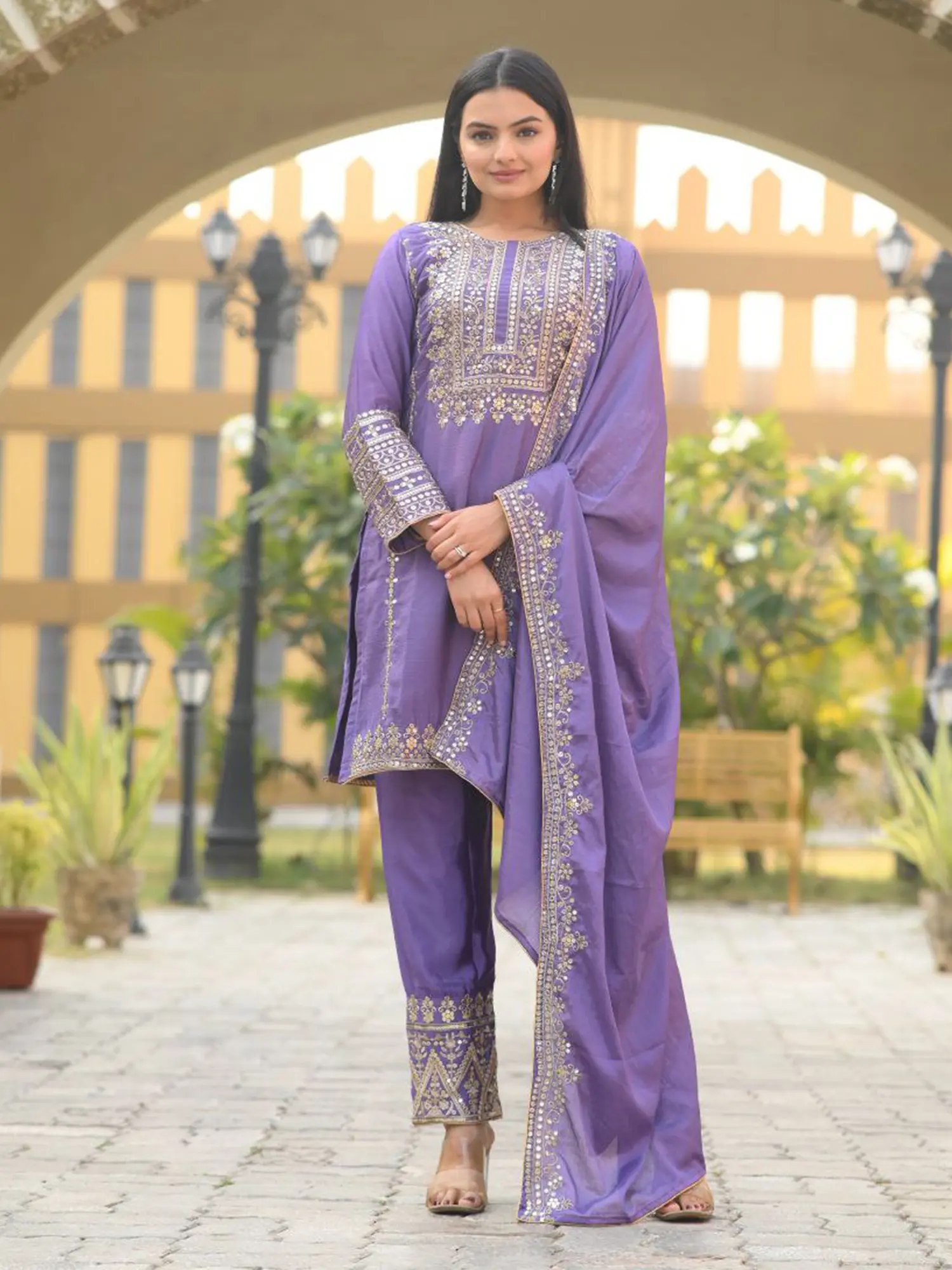 Chinon Heavy Embroidered Work Round Neck Kurta With Palazzo And Matching Dupatta