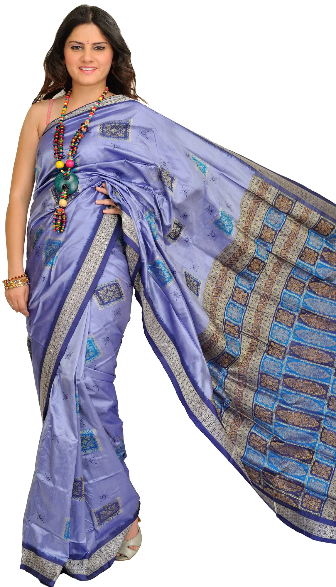 The luxurious feel of pure silk elevates this Bomkai sari to a realm of unparalleled elegance. The natural sheen of the silk catches the light beautifully, enhancing the depth of the lavender-violet color and the shimmer of the woven patterns. Its smooth texture drapes effortlessly, creating a flattering silhouette that is both comfortable and regal. This silk sari is ideal for special occasions, celebrations, and events where you wish to make a statement of refined taste and cultural appreciation.