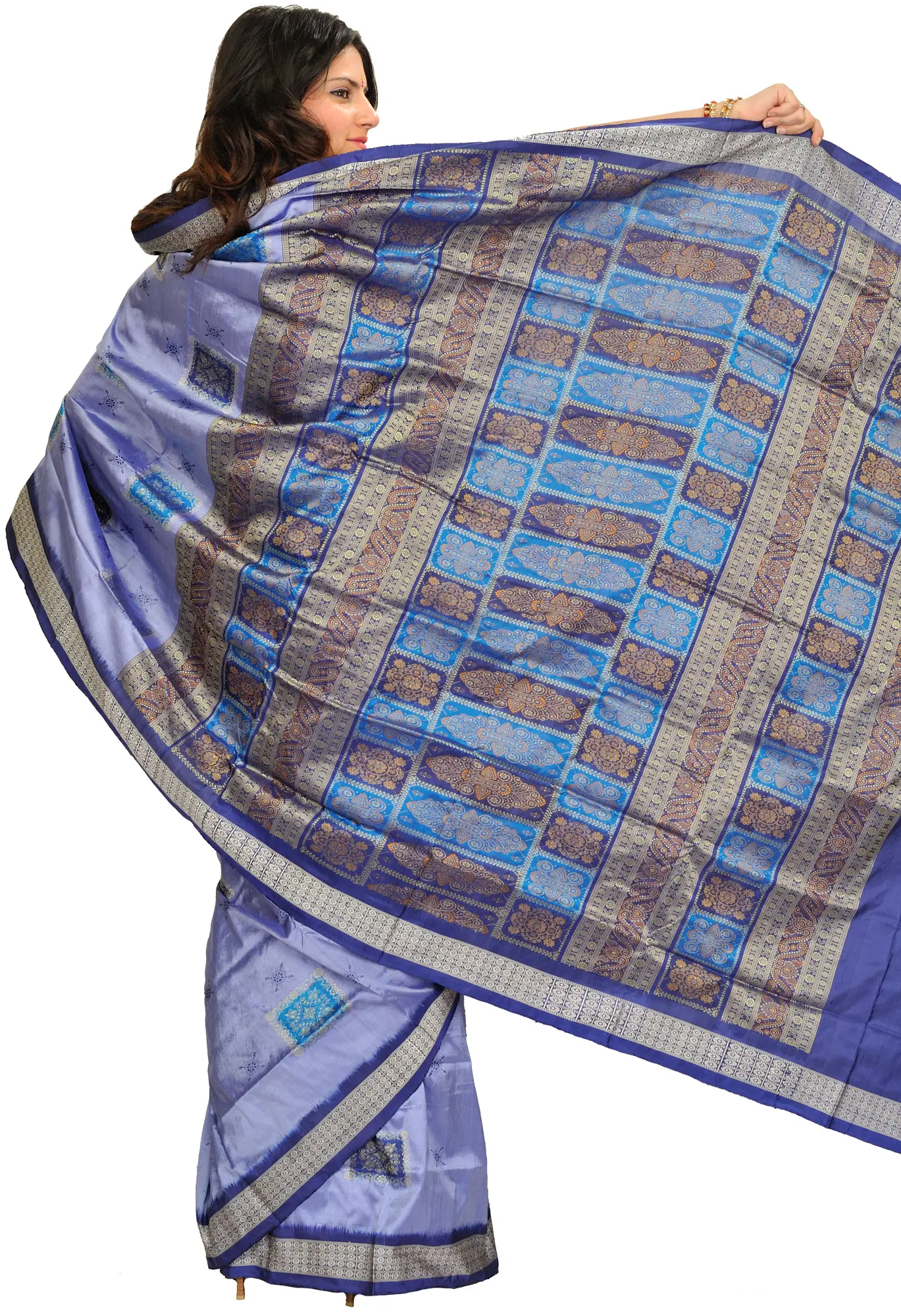 To ensure you are ready to dazzle from the moment it arrives, this stunning sari comes complete with a blouse and underskirt, tailored to your precise size. This thoughtful inclusion means you can experience the beauty and elegance of this traditional Indian attire without any further preparation. Drape yourself in the timeless charm of Odisha's Bomkai silk and let the exquisite craftsmanship and the serene lavender-violet hue illuminate your presence.