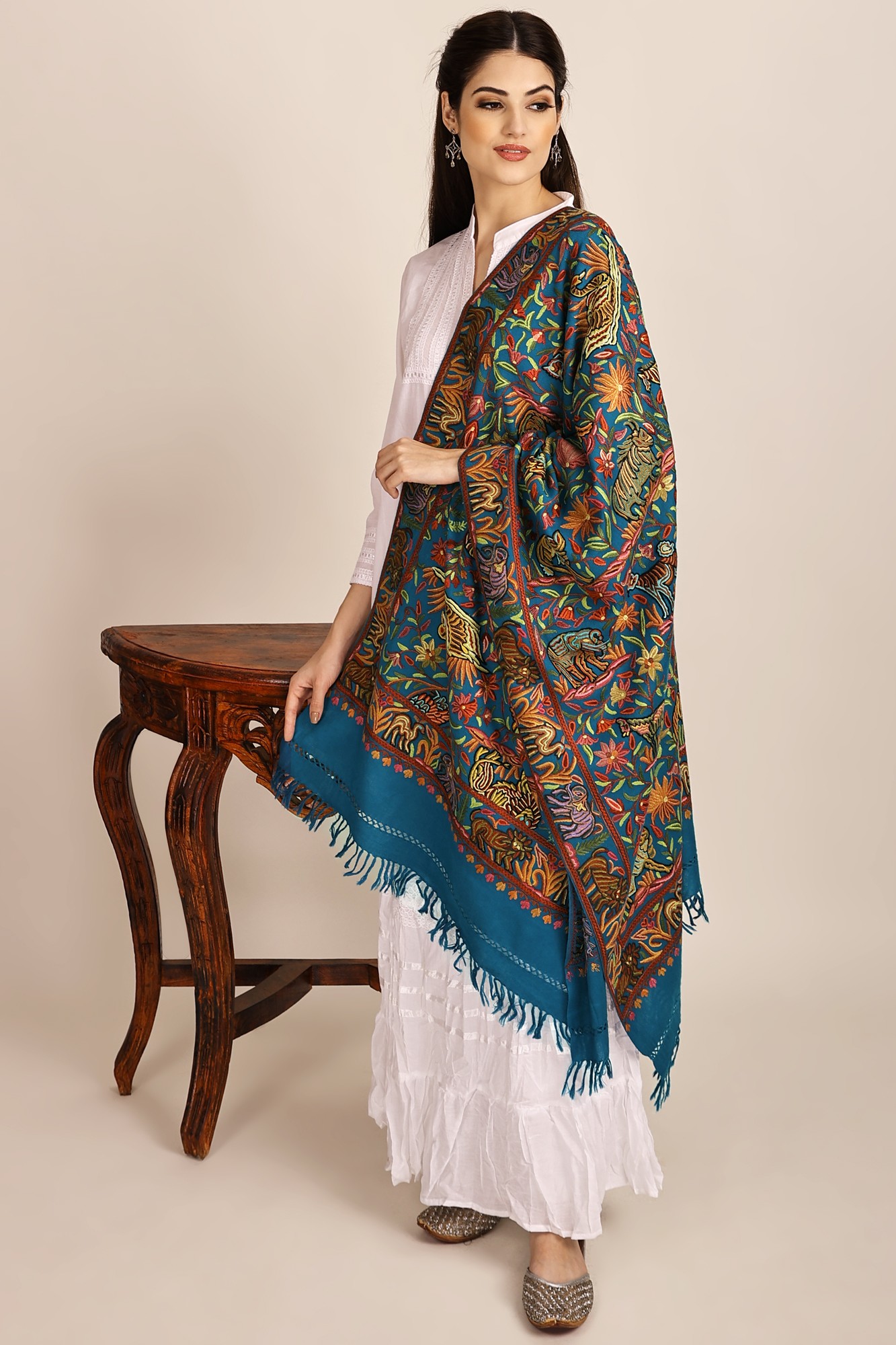 Stoles from Kashmir have been a status of fame, charm, and luxury over the last many decades. Embracing a hand-curated stole itself shouts unmatched luxury out loud. A pure wool stole is heavy on beauty and sophistication which is why it’s worth every penny you ever invest in it. The one your eyes rests on at the moment is just an example of a pinnacle of style and unmatched elegance that an authentic stole from Kashmir can spin you in. A must-have for the winter, this blue woolen stole embellished with ari embroidery through the hands of artisans showcasing captivating animals that speak through the design.