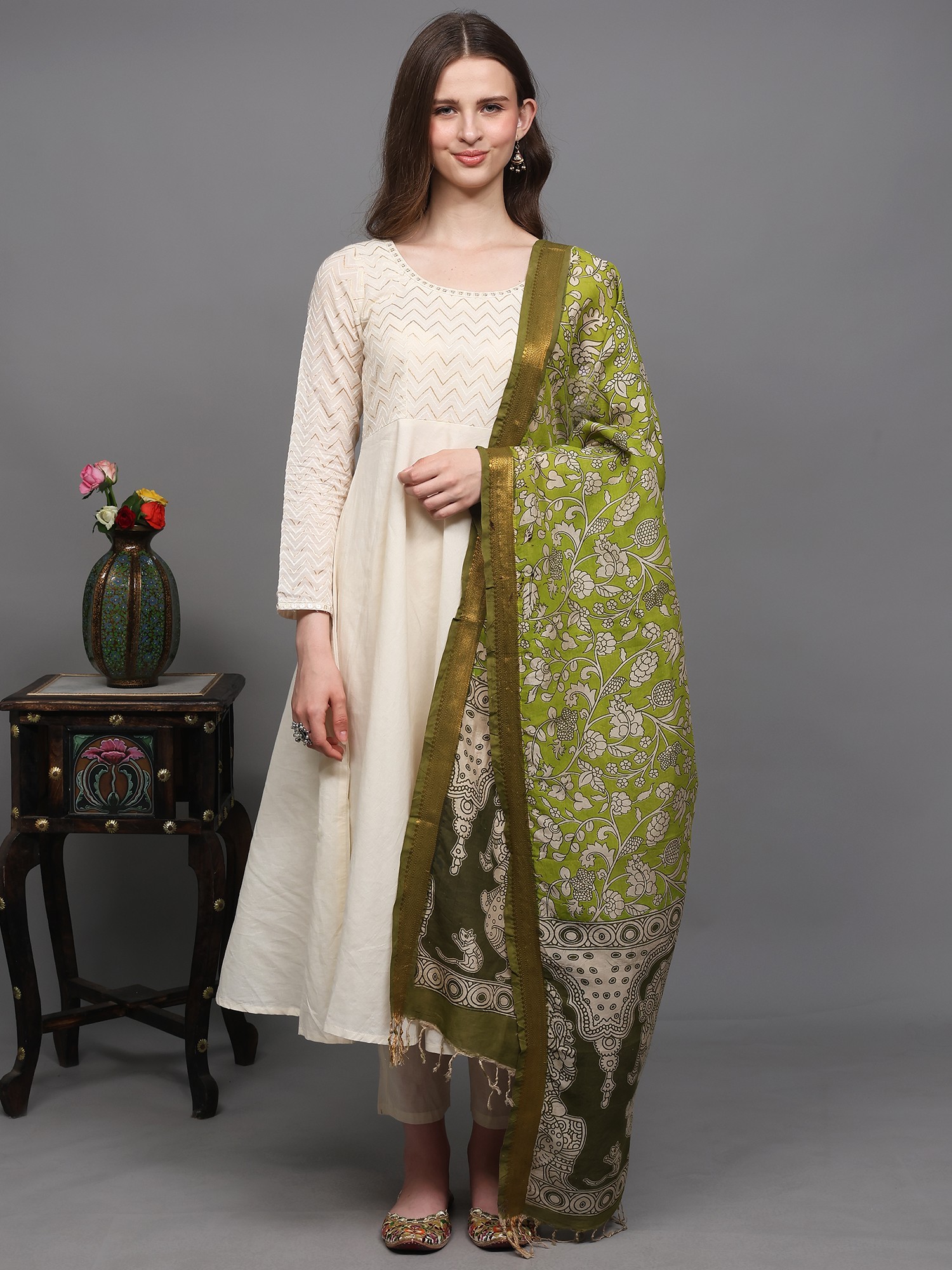 Solitary-Star Kalamkari Dupatta with Floral & Peacock Print from Telangana and Zari work Border