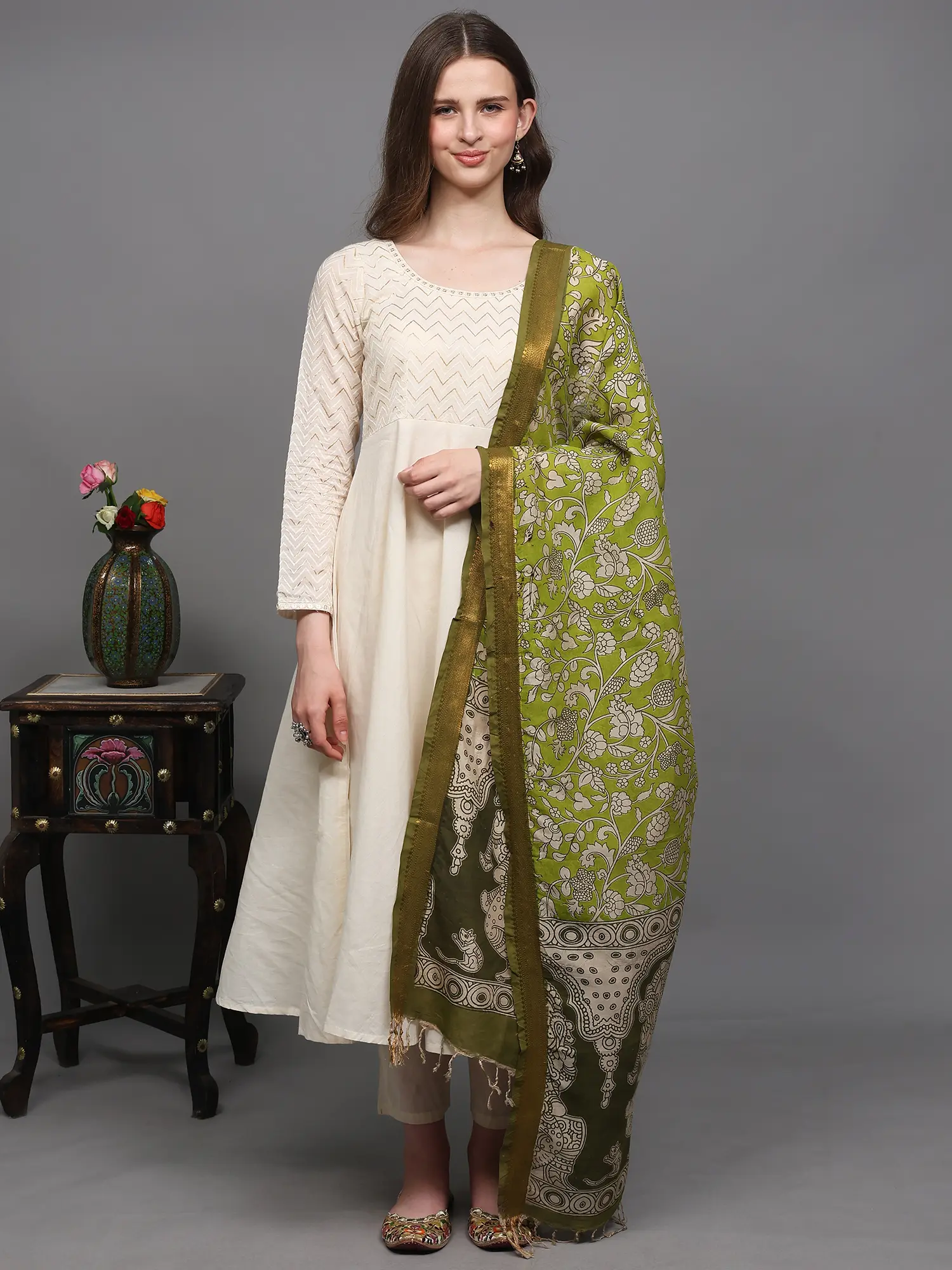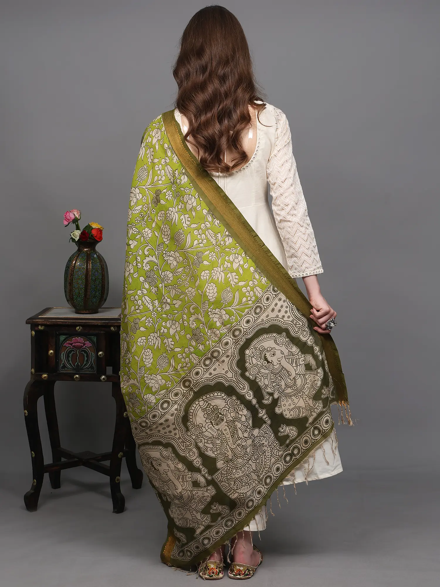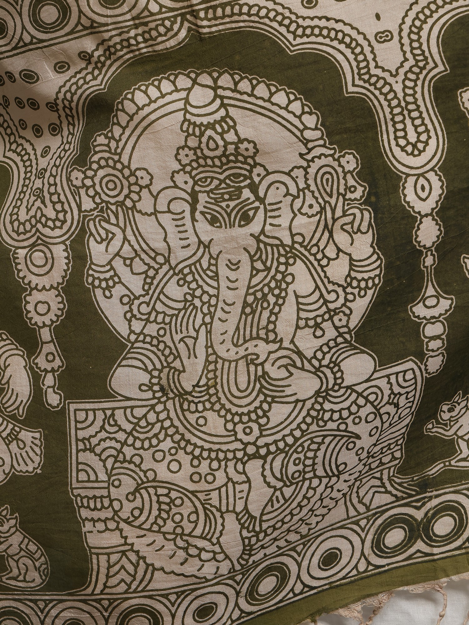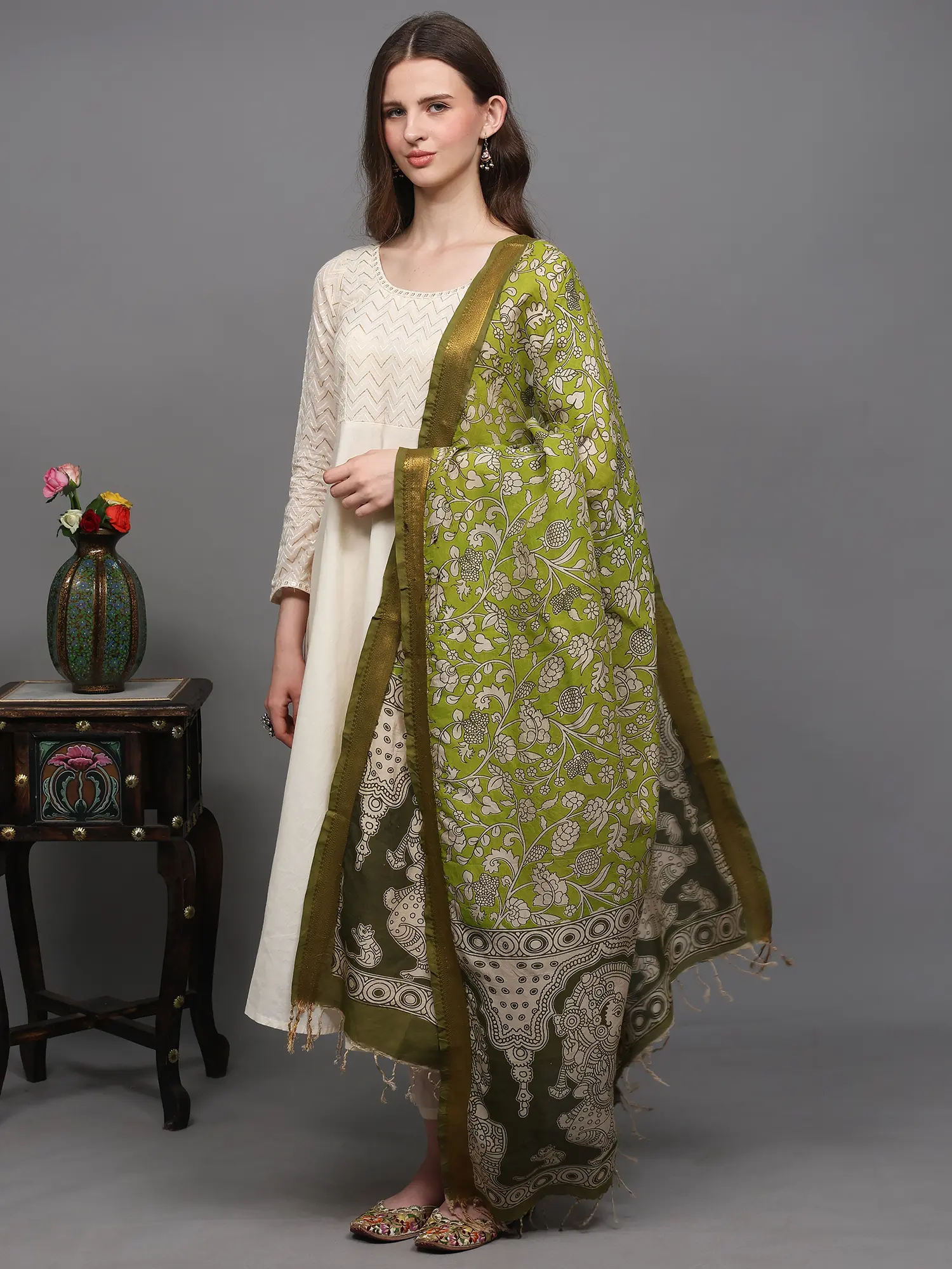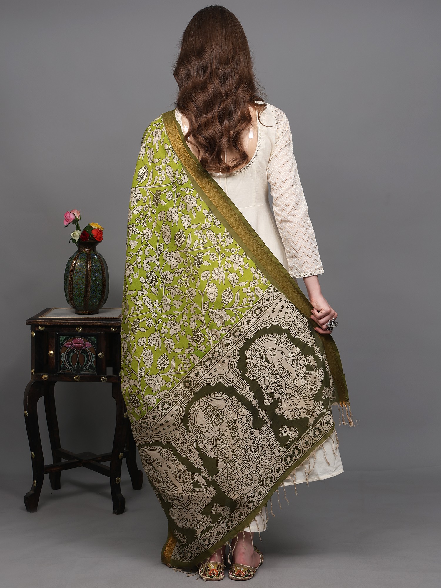 Pistachio-Shell Kalamkari Dupatta with Pen Art Hand-Painted Kathakali Dancing Ladies from Telangana