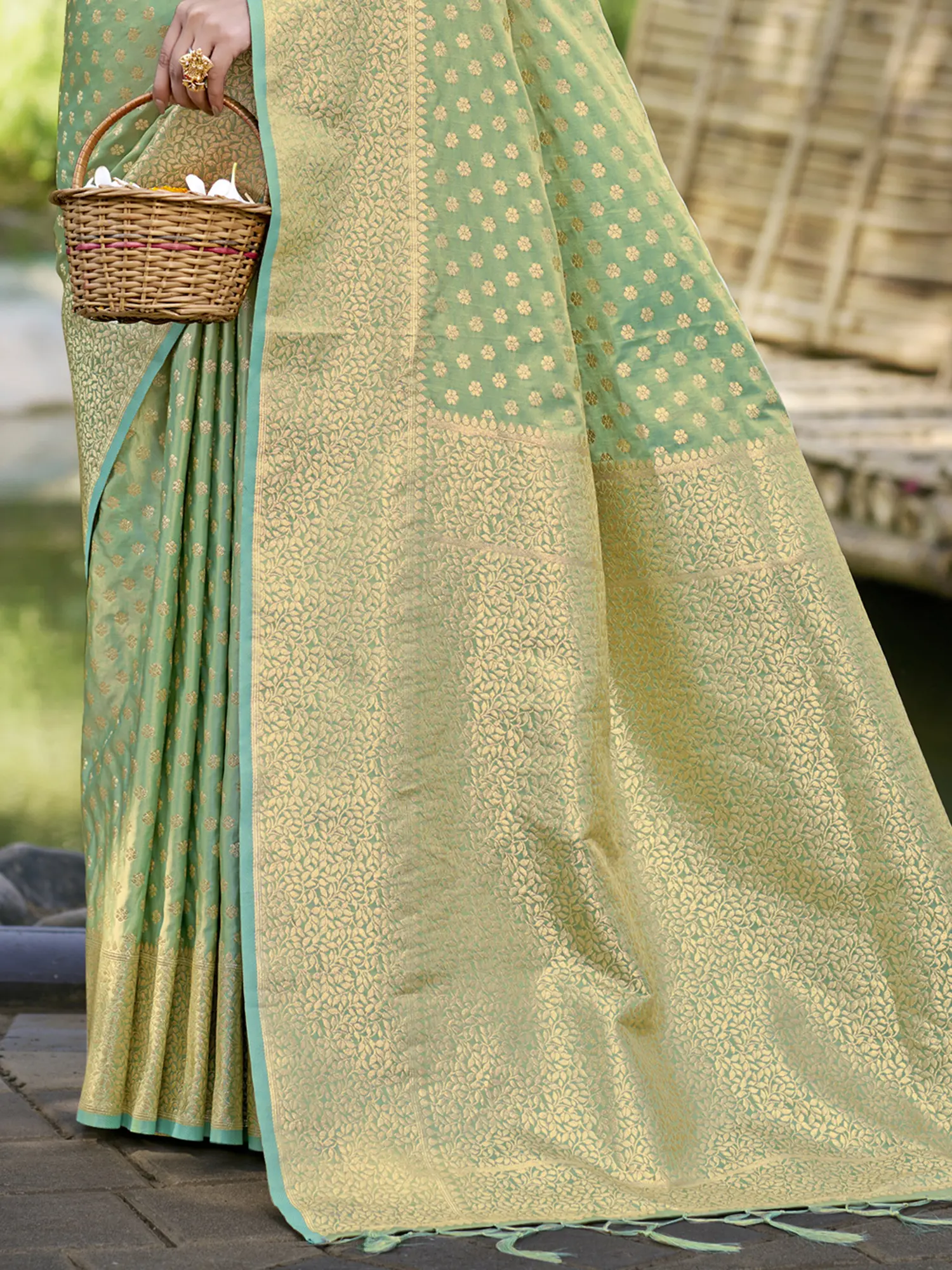 Moonlight-Jade Floral Leaf woven Pure Silk Saree and Golden Thread work Border with Paisley Motifs from Bangalore