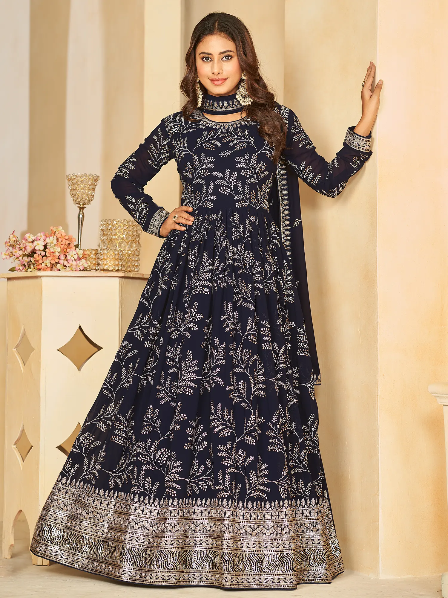 Step into a realm of refined sophistication with this exquisite Anarkali suit, a true masterpiece designed to captivate. Crafted from a luxurious faux georgette fabric, this ensemble drapes beautifully, offering a fluid silhouette that is both flattering and comfortable. The rich, deep navy hue serves as a stunning canvas for the intricate silver embroidery, depicting delicate leaves and swirling vines that ascend the length of the garment. This meticulous detailing creates a visually arresting pattern that is both classic and contemporary, perfect for making a memorable statement.