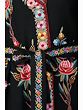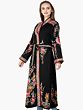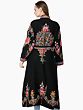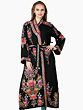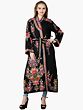 Experience the unbounded regalia of Kashmir’s Aari embroidery, in this licorice black Kashmiri robe. The dark canvas of pure wool is covered by the craftsmen with rich Aari floral patterns, vertically on the robe and its belt. Large and eye-catching floral motifs are stitched on the torso and the hem of the robe, adding a vibrant splash of colors to it. The mesmeric Aari work continues on the back of the robe, with bold flowers amplifying the exquisite feel of the robe, whose woolen warmth and opulent embroidery give you a charming overall.