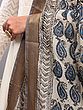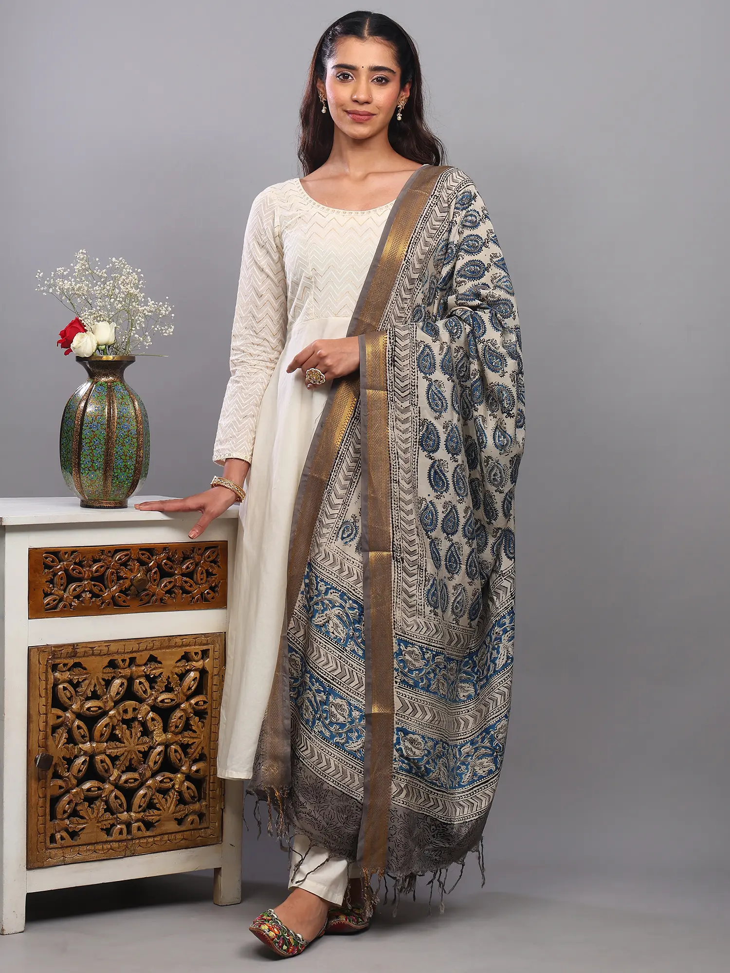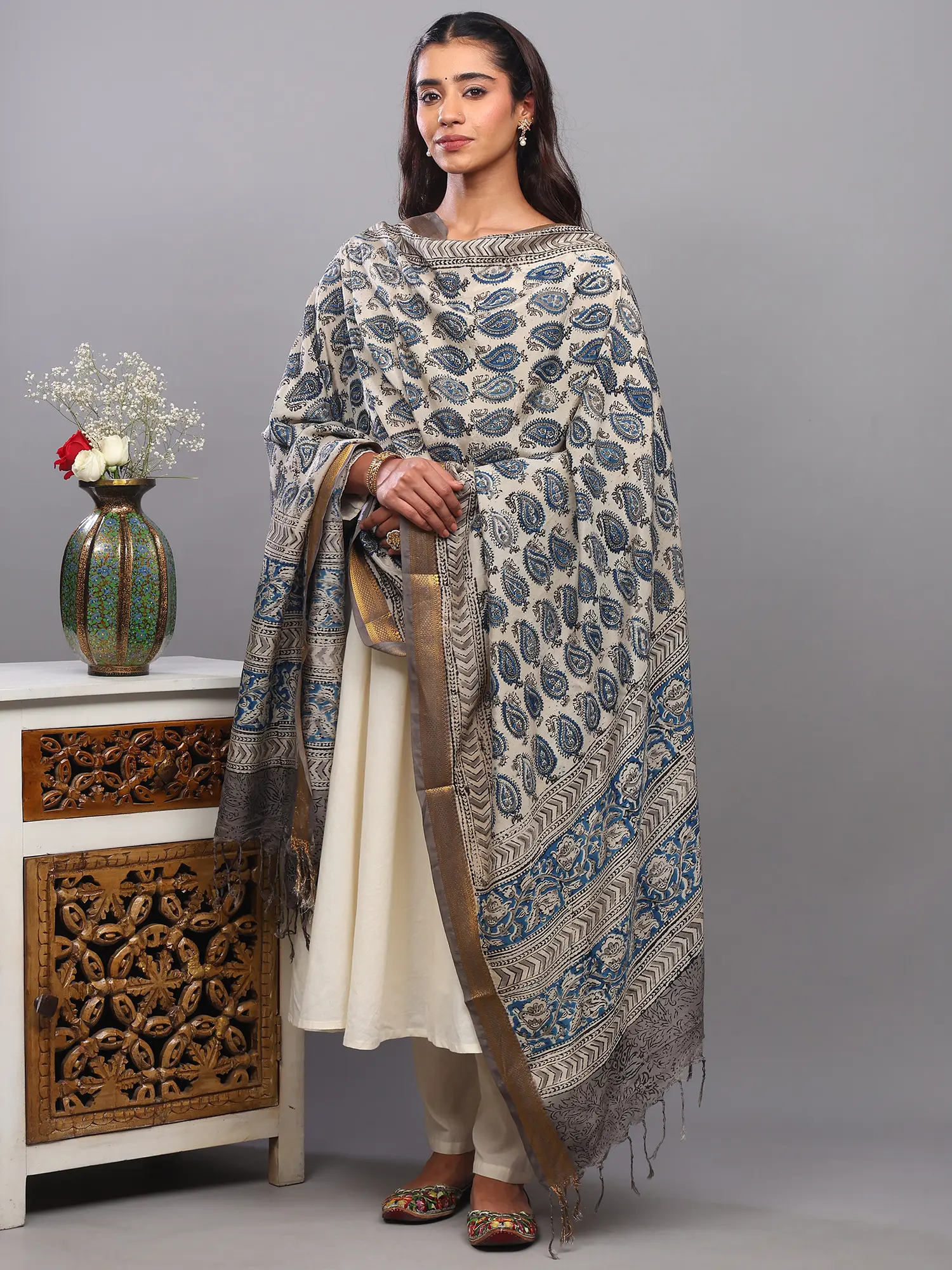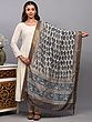 The surface of the dupatta is adorned with a captivating all-over print of meticulously rendered paisleys. These iconic teardrop-shaped motifs, a symbol of fertility and prosperity, are presented in a harmonious palette of deep blues and subtle grays. Each paisley is distinct, showcasing delicate detailing and a handcrafted feel that speaks volumes about the skill of the artisan. The repetitive yet varied placement of the paisleys creates a visually engaging pattern that draws the eye and adds depth to the fabric.
