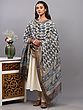 White-Swan Kalamkari Dupatta from Telangana with Block-Printed Flowers and Zari Border
