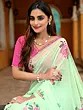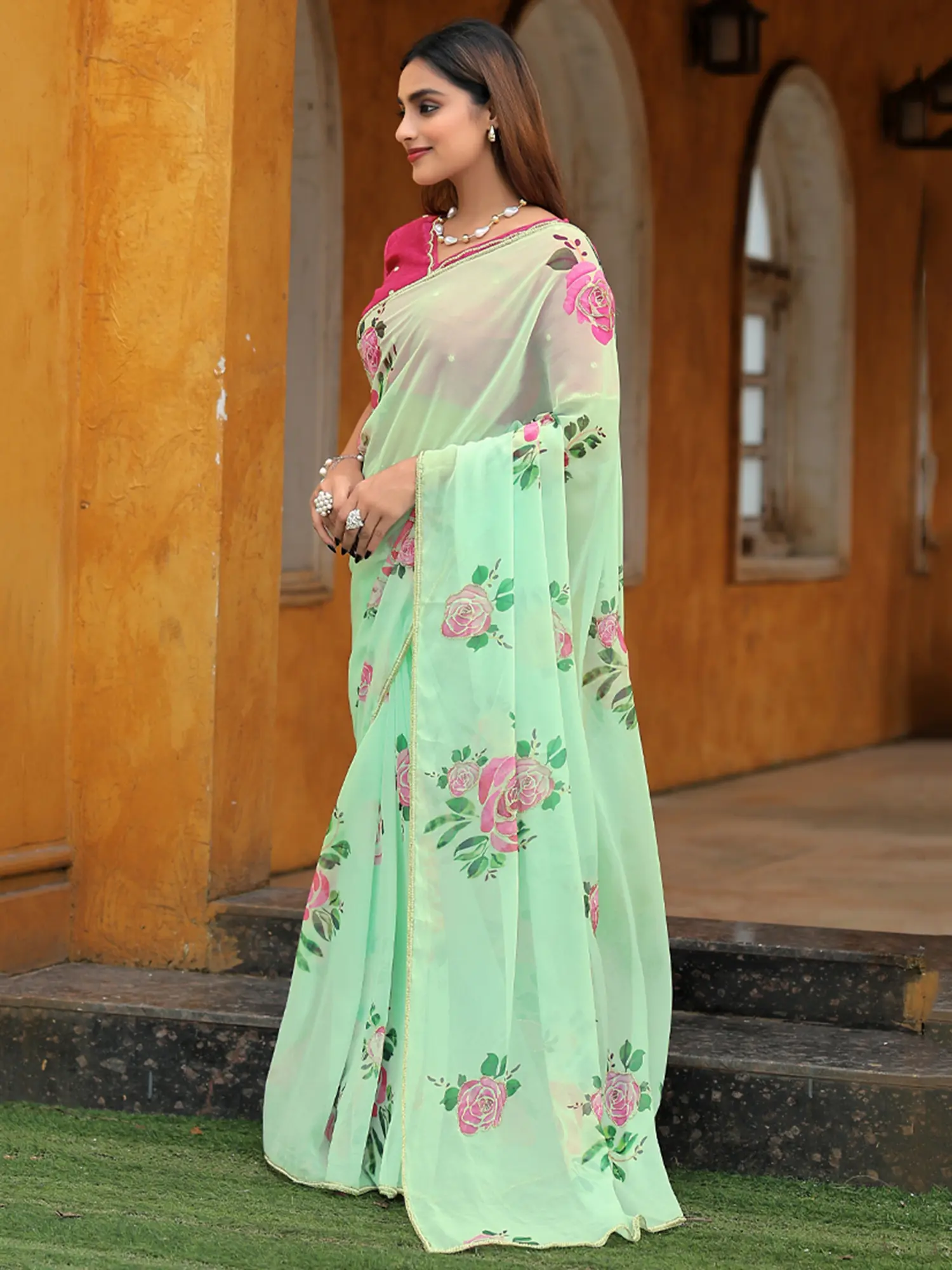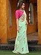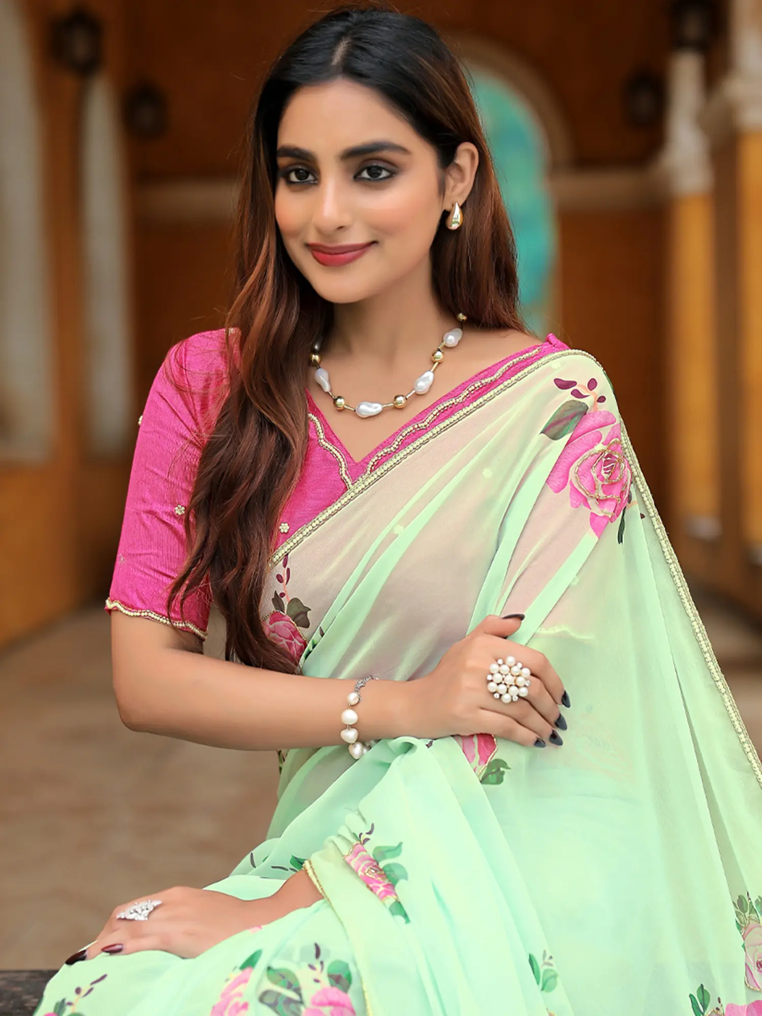 This light-green floral silk saree is more than just an garment; it's an invitation to celebrate life's special moments. Perfect for weddings, festive gatherings, parties, or even a sophisticated evening soiree, it promises to turn heads and garner compliments. The artistic floral print adds a refreshing and contemporary twist to traditional silk sarees, making it a standout choice for modern connoisseurs of ethnic wear. Pair it with a contrasting blouse, as shown, or experiment with different shades to create your unique ensemble. Accessorize with traditional jewelry to enhance its regal charm or opt for minimalist pieces to let the saree truly shine. This versatile drape ensures you are always impeccably dressed, exuding grace and captivating style.