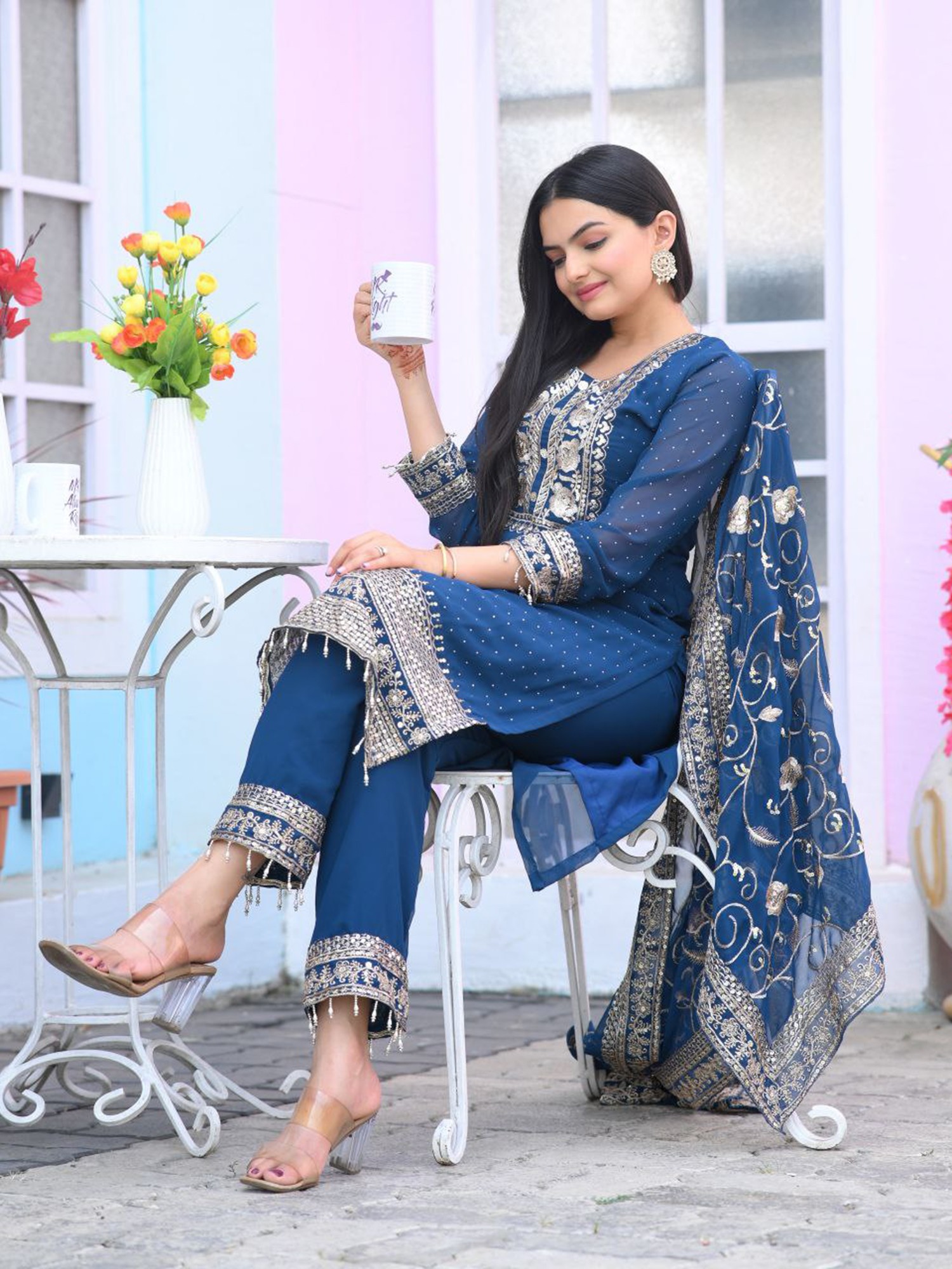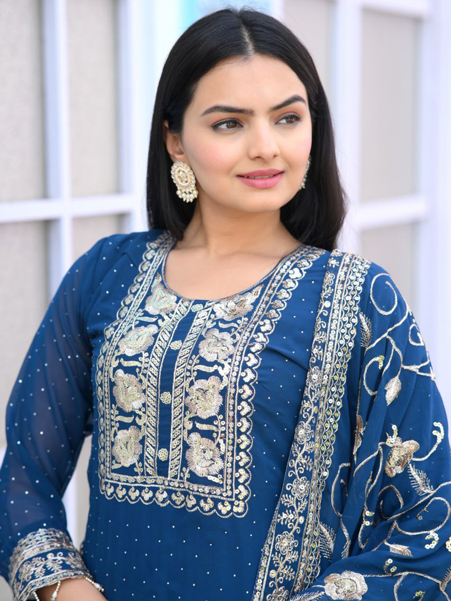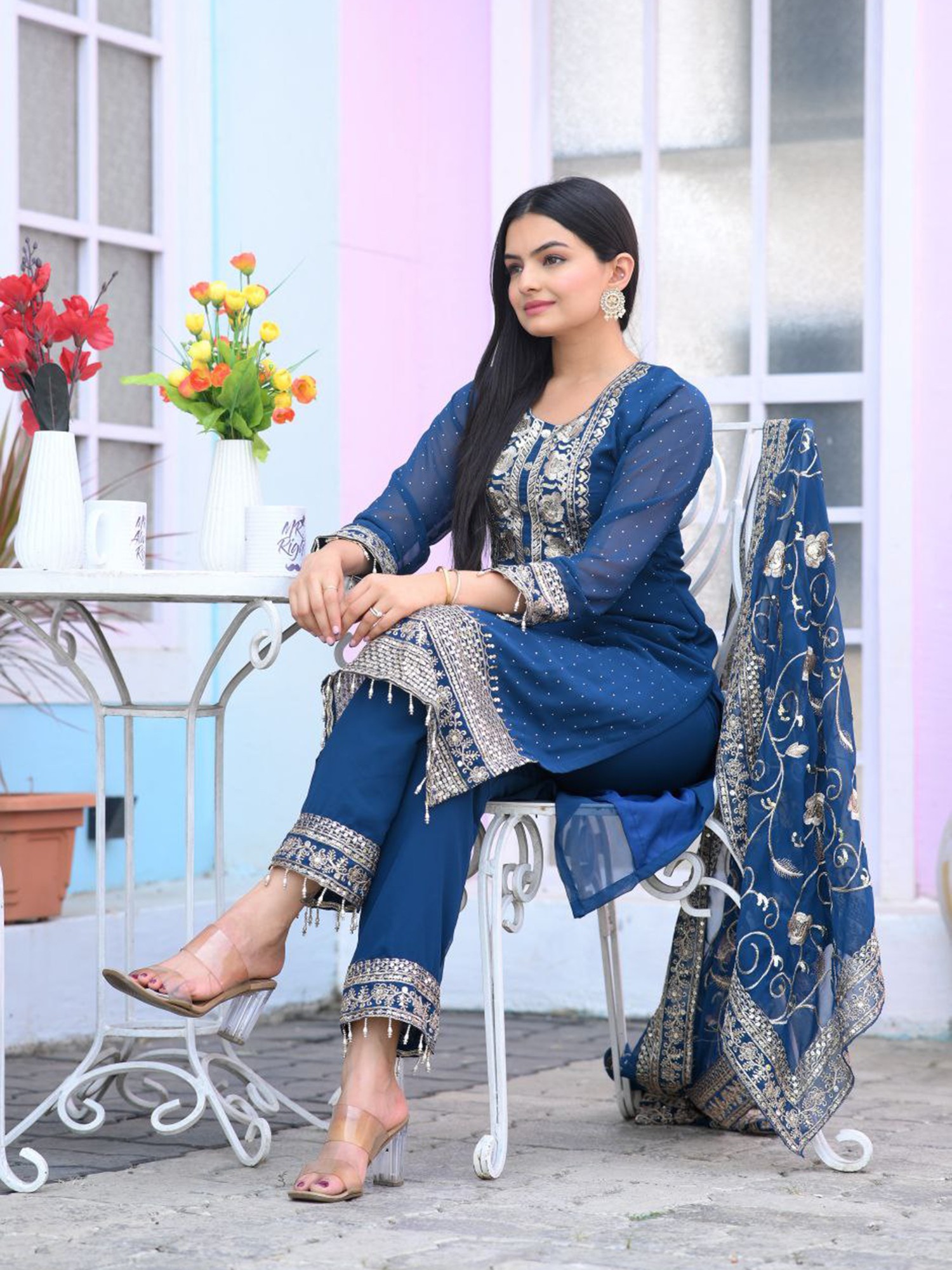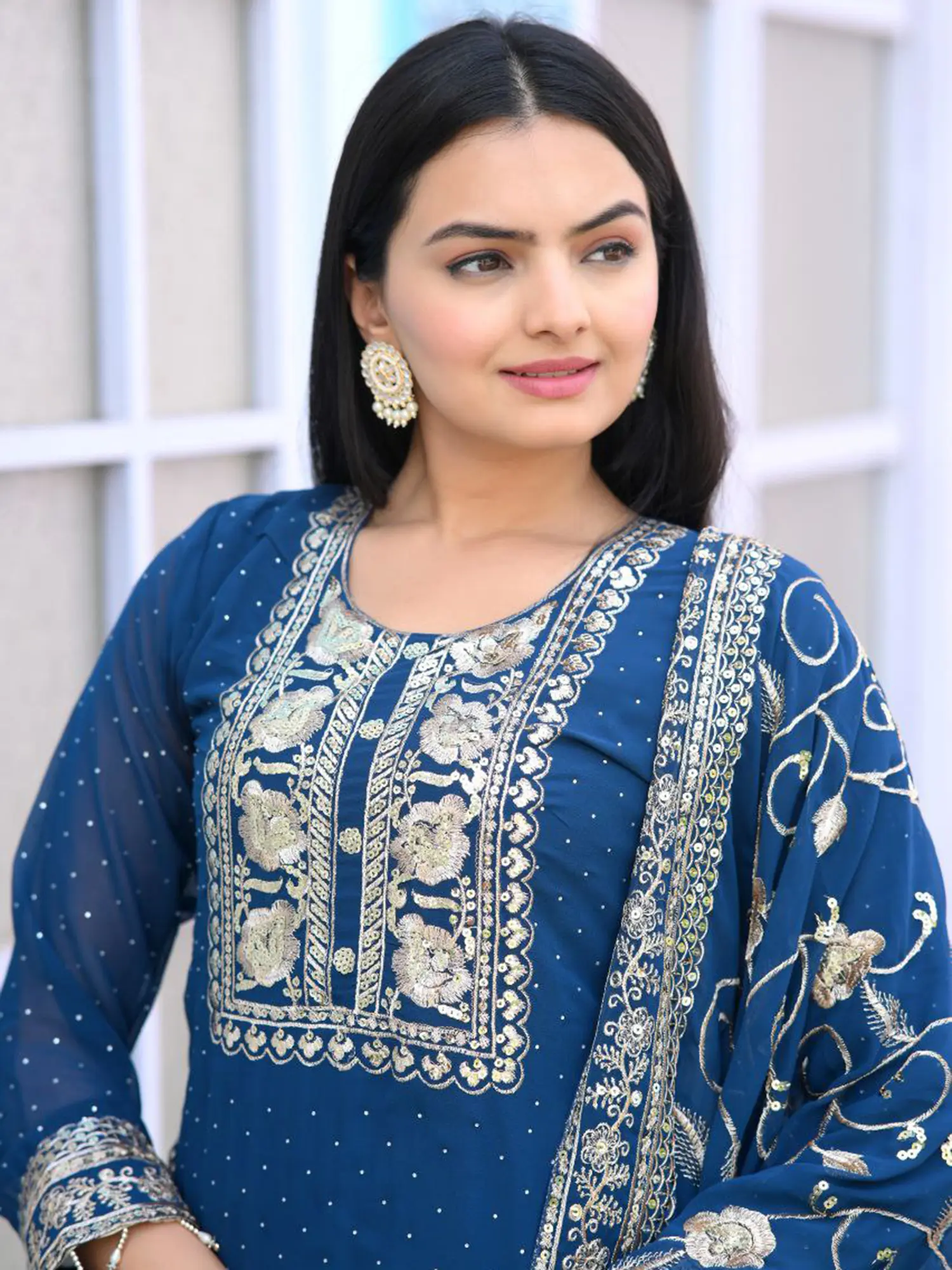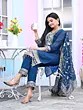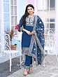 Dark-Sky-Blue Chinon Embroidery Work Attractive Kurta Set With Dupatta