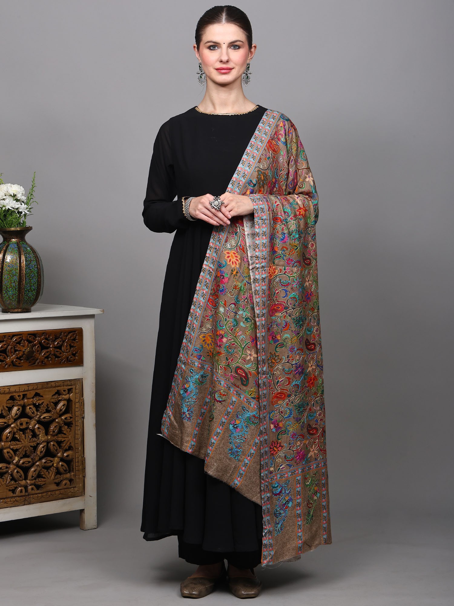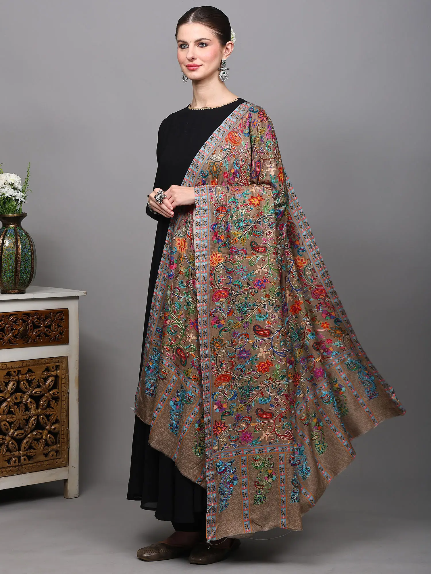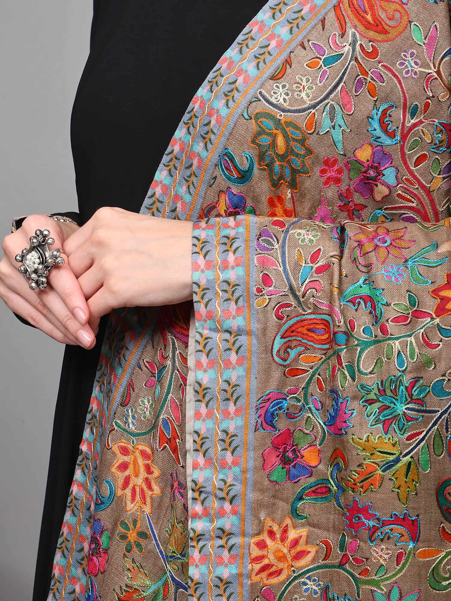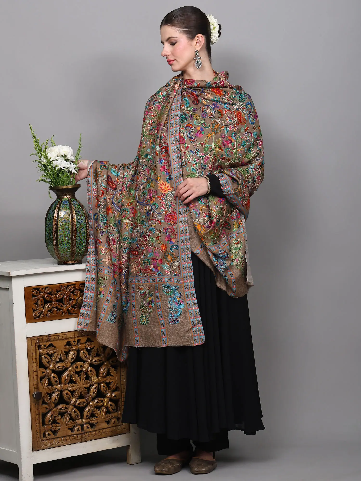 Dune-Brown Kani Pashmina Shawl From Kashmir with Kalamkari Hand Embroidery