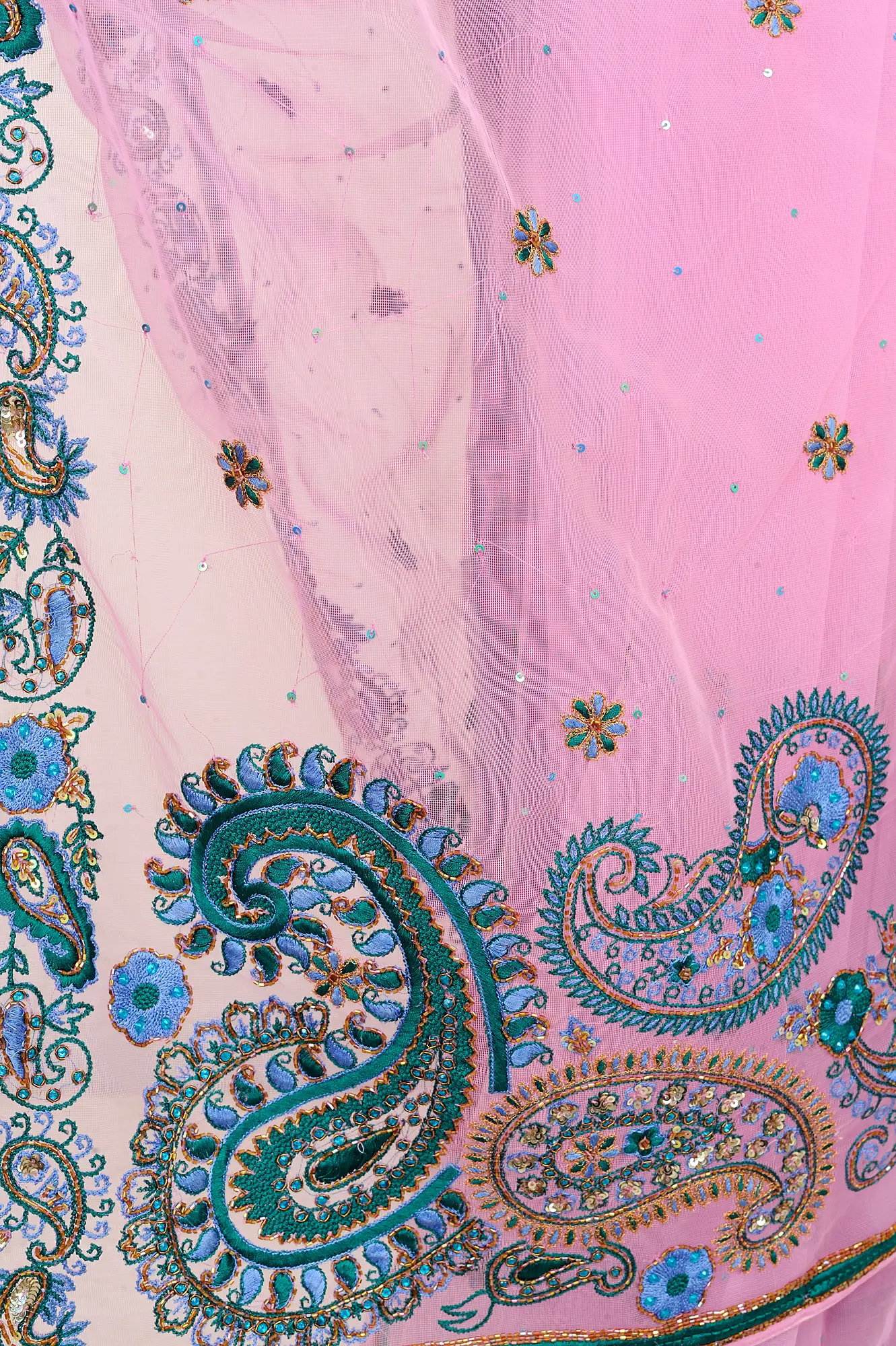 The true artistry of this sari lies in its stunning embellishments. Elaborate paisley motifs, meticulously hand-beaded and adorned with shimmering sequins, cascade across the fabric. These intricate designs catch the light with every movement, creating a mesmerizing display of sparkle and color. The vibrant teal and blue accents within the paisleys add depth and contrast to the soft lilac base, while scattered floral motifs further enhance the sari's delicate charm. The borders are equally resplendent, featuring a rich tapestry of beaded paisleys and sequenced floral patterns framed by a contrasting trim, ensuring that every inch of this sari is a testament to exquisite craftsmanship.