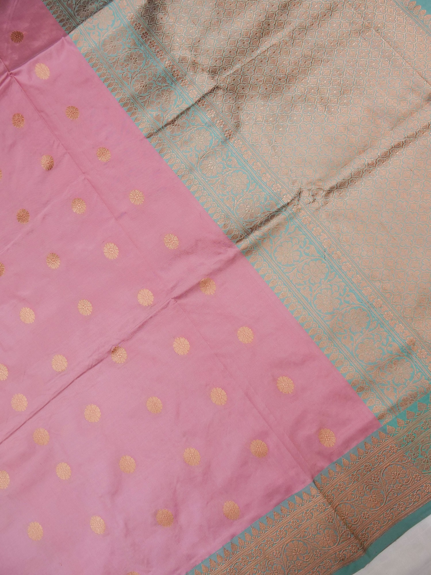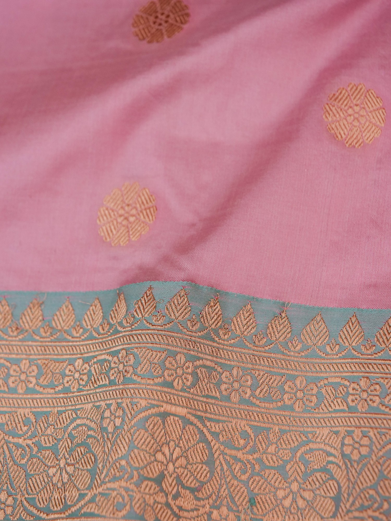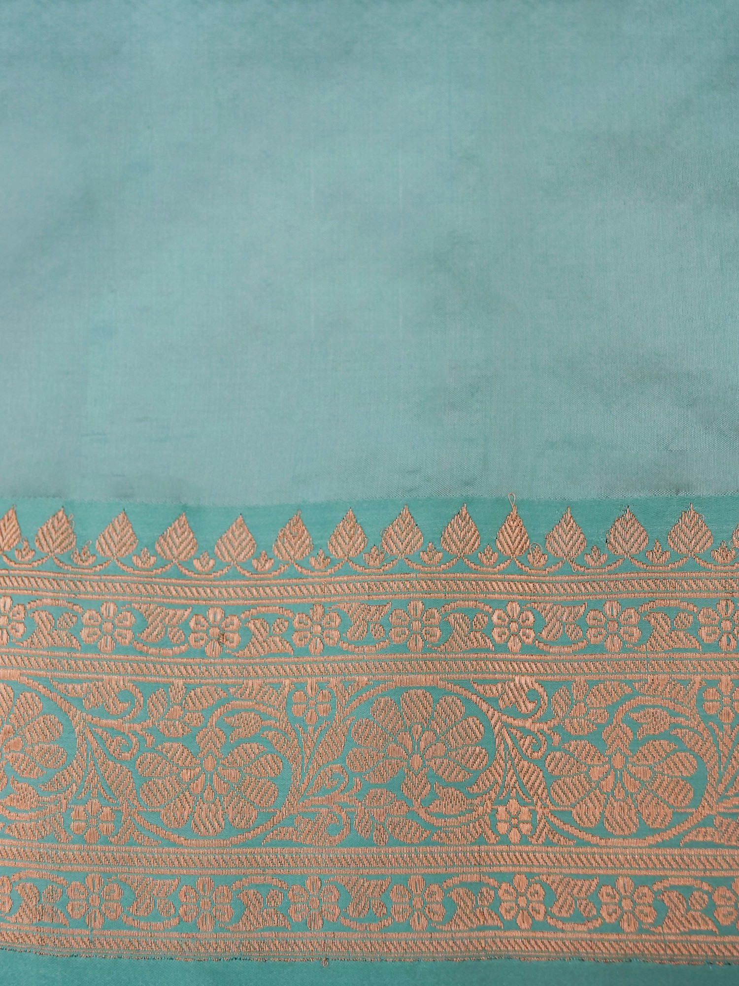 A pure silk Banarasi saree to drape and feel the luxuriousness of early Indian fashion, this lilac and blue Katan silk sari is the perfect example of dreamy traditional Indian women's wear. The delicate lilac field of the body is beautified with tiny floral patterns done with glistening Zari. The border of the sari is in a lovely blue adorned with flowering vines of different varieties that enhance the silk sari's feminine grace. Wrapped in this magical attire, you will feel no less than a regal princess.