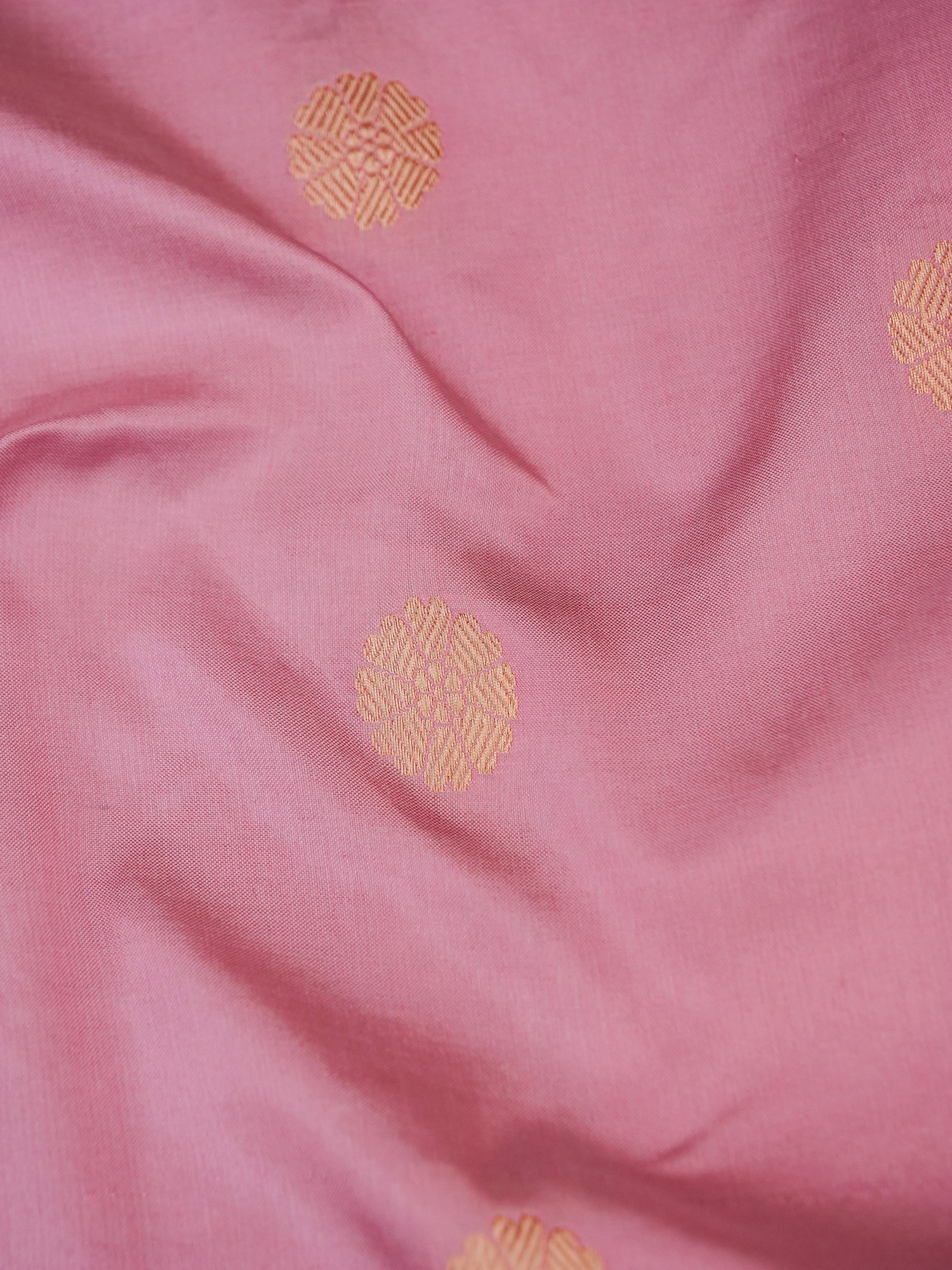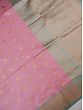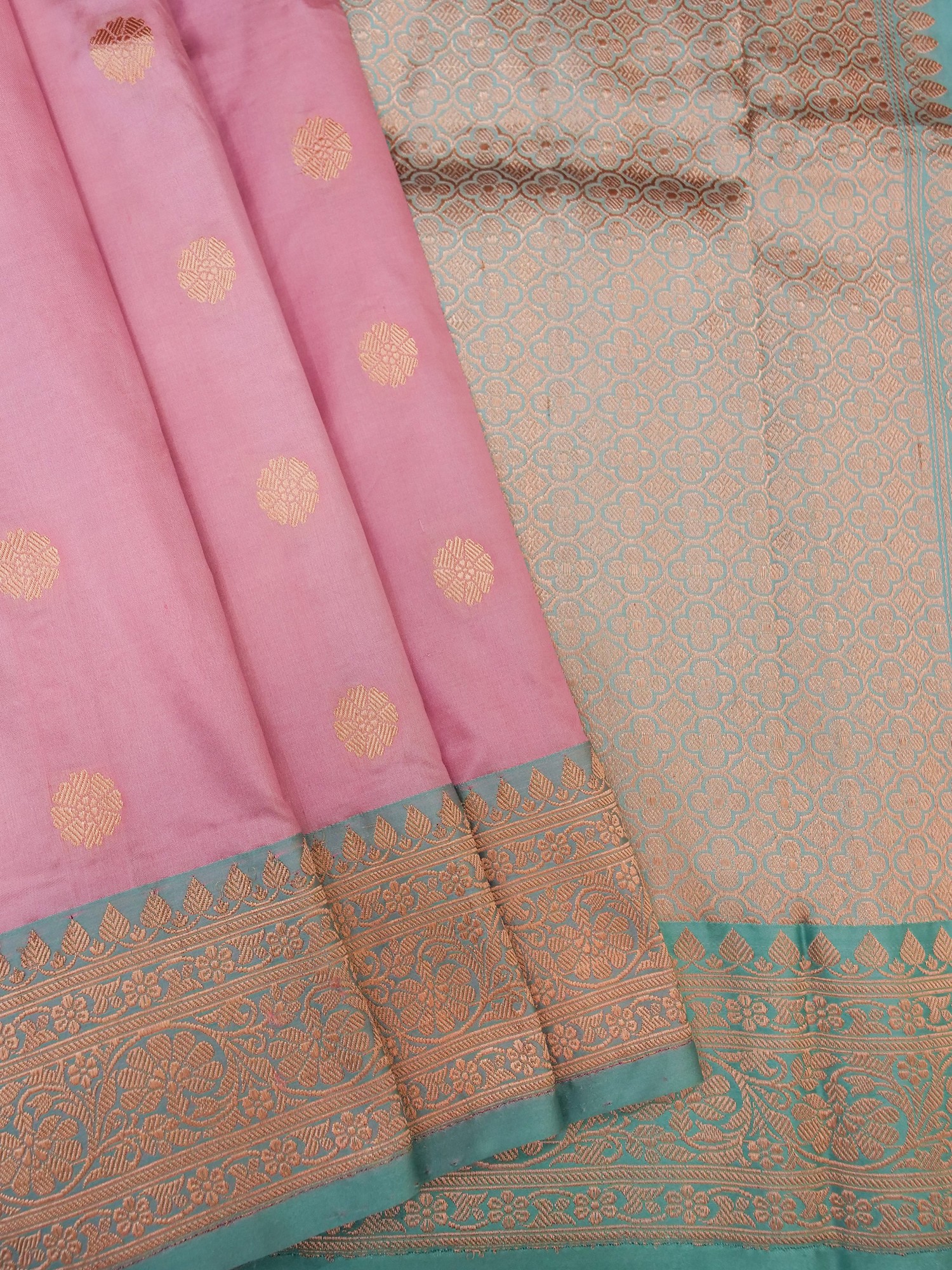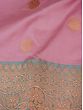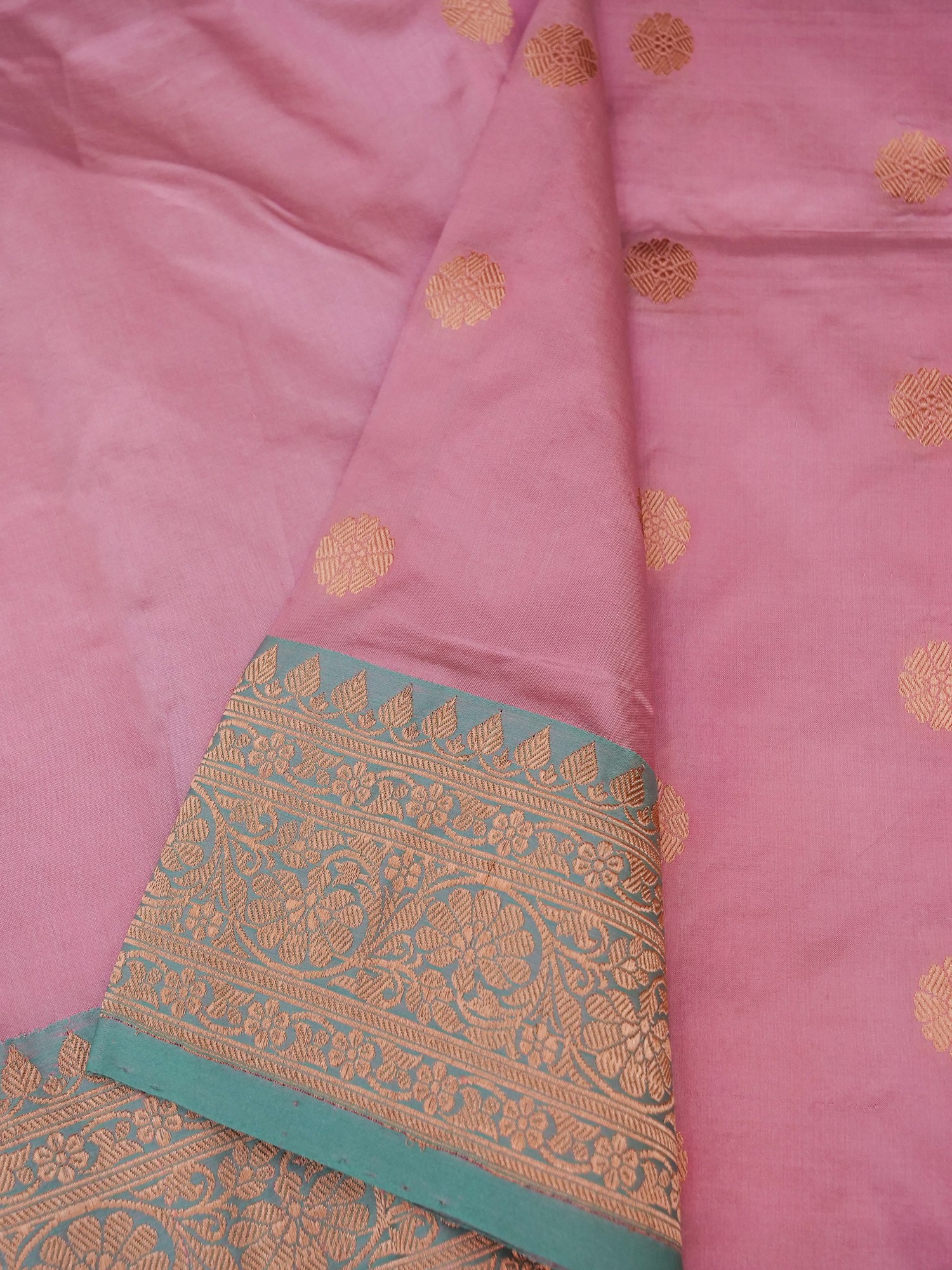 A pure silk Banarasi saree to drape and feel the luxuriousness of early Indian fashion, this lilac and blue Katan silk sari is the perfect example of dreamy traditional Indian women's wear. The delicate lilac field of the body is beautified with tiny floral patterns done with glistening Zari. The border of the sari is in a lovely blue adorned with flowering vines of different varieties that enhance the silk sari's feminine grace. Wrapped in this magical attire, you will feel no less than a regal princess.