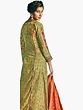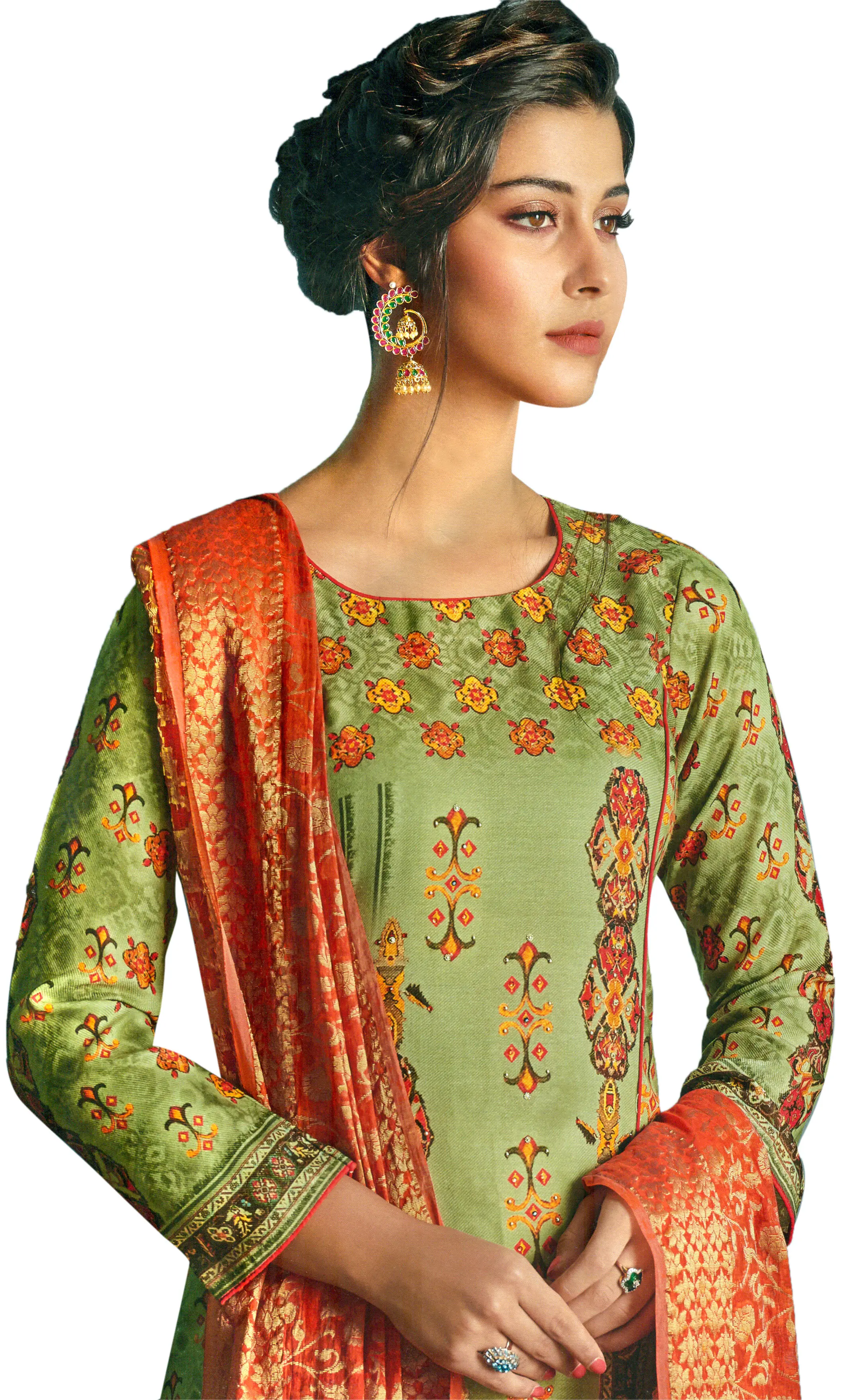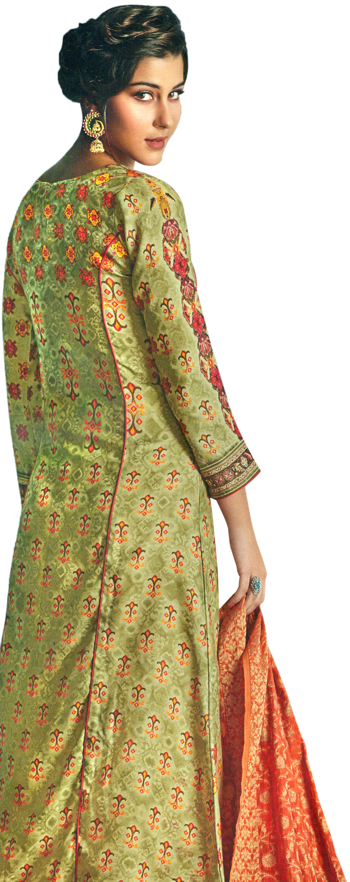 This salwar suit is a testament to versatile fashion. The calming lily-green forms a perfect canvas for the vibrant prints, making it suitable for a range of events. Dress it up with statement jewelry and heels for a festive celebration, or keep it understated with elegant flats and minimalist accessories for a daytime outing. The accompanying dupatta, with its complementary rich orange hue and intricate pattern, adds a final touch of opulence and can be draped in various styles to suit your preference. This ensemble is designed to adapt to your personal style and the demands of your social calendar.