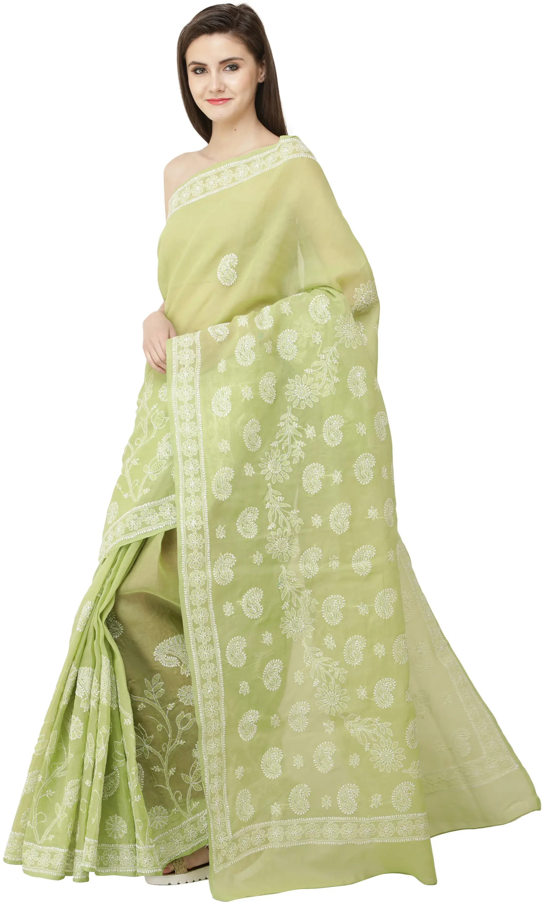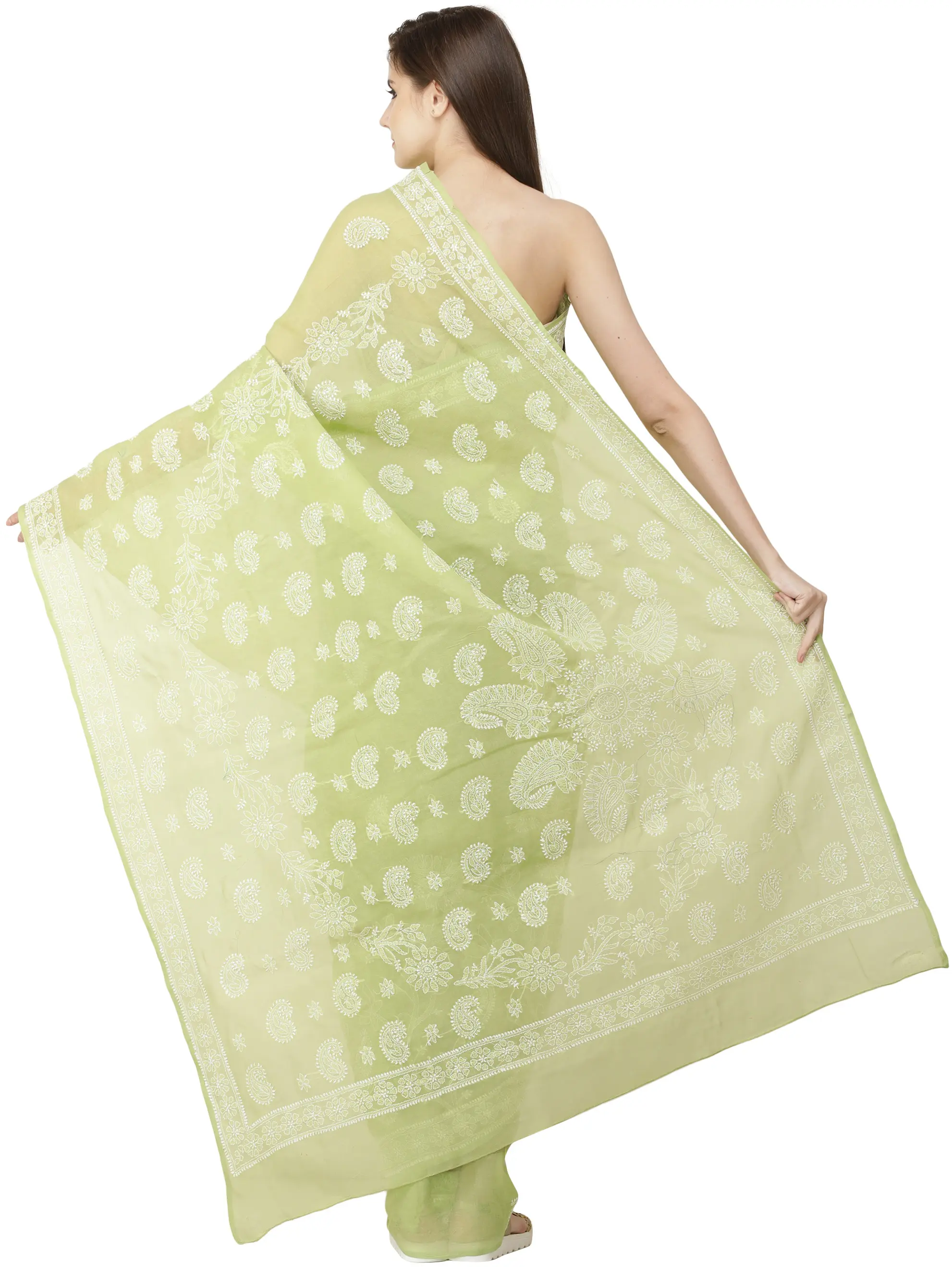 Lily-Green Lukhnavi Chikan Sari with Hand-Embroidered White Flowers and Paisleys